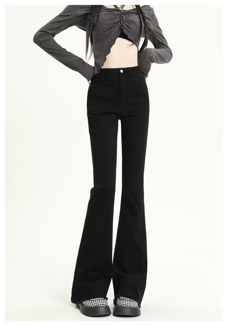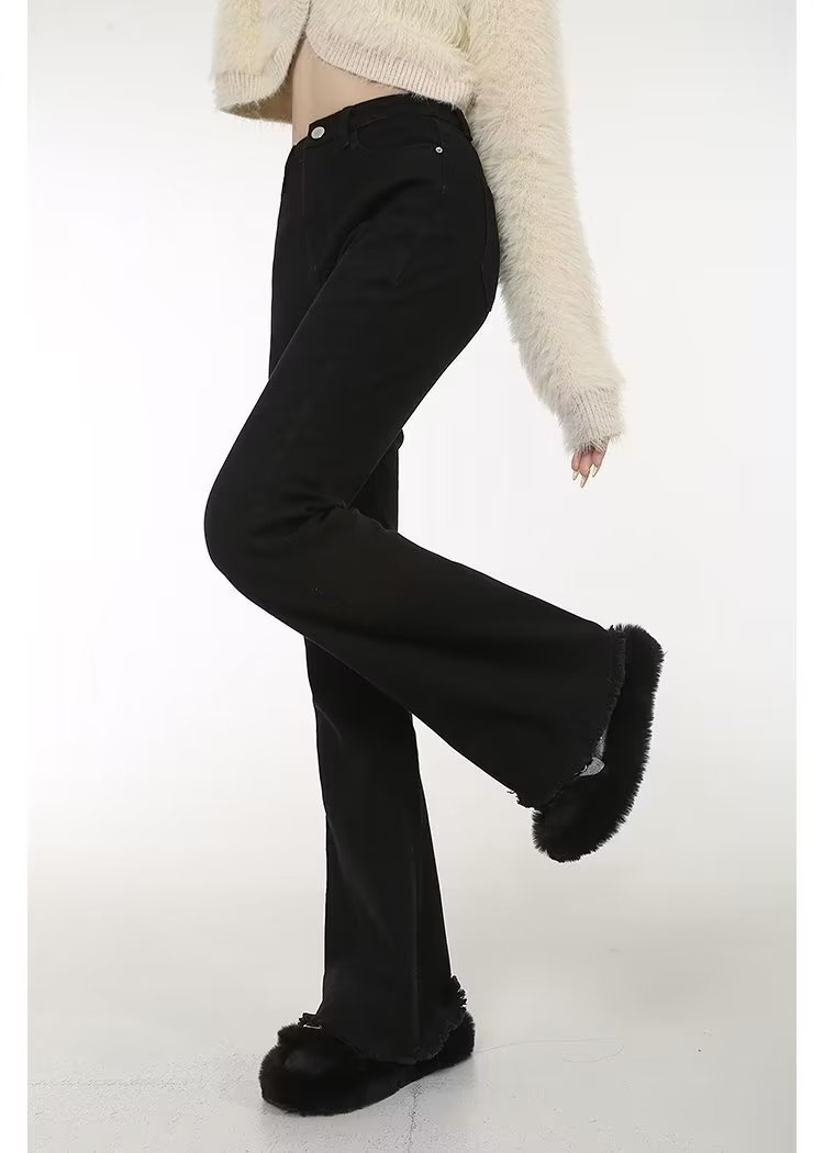 여성용 레트로 청바지, 로우 엣지 플레어 플러스 벨벳 스트레치 하이 웨이스트 슬림핏 패셔너블한 말굽 바닥 길이 바지