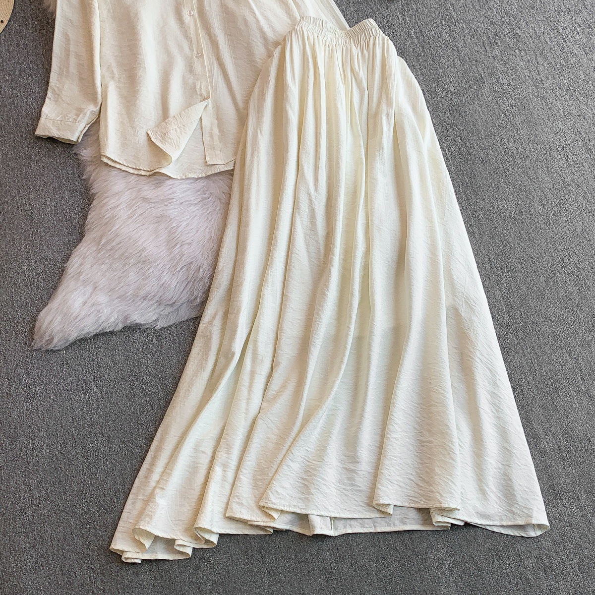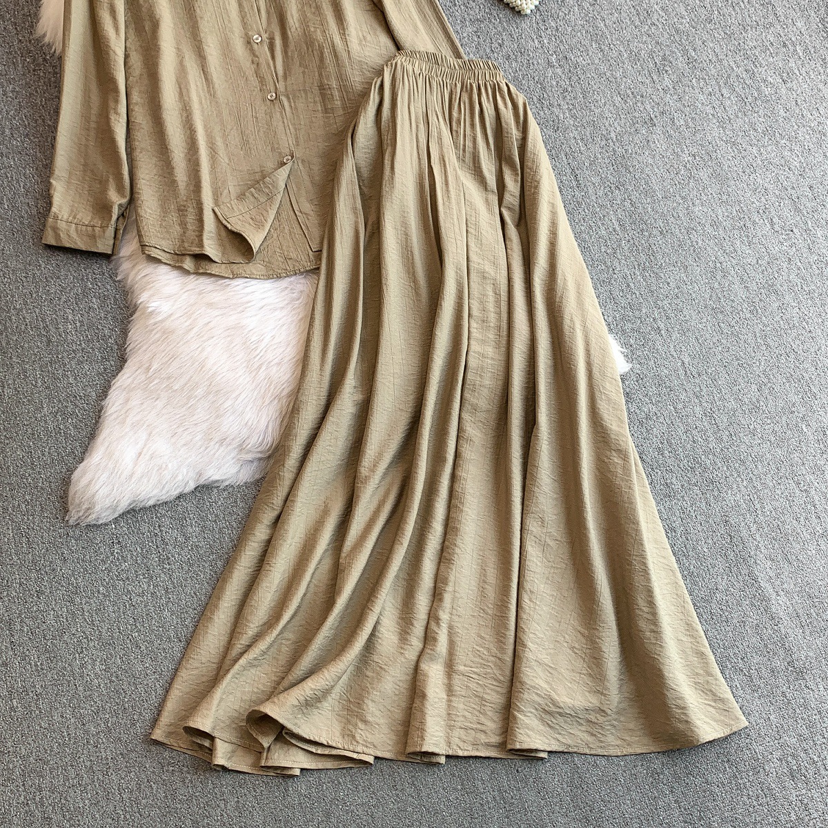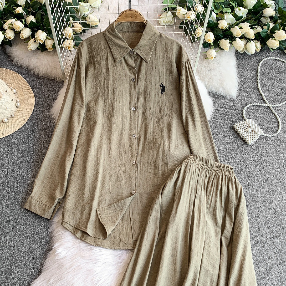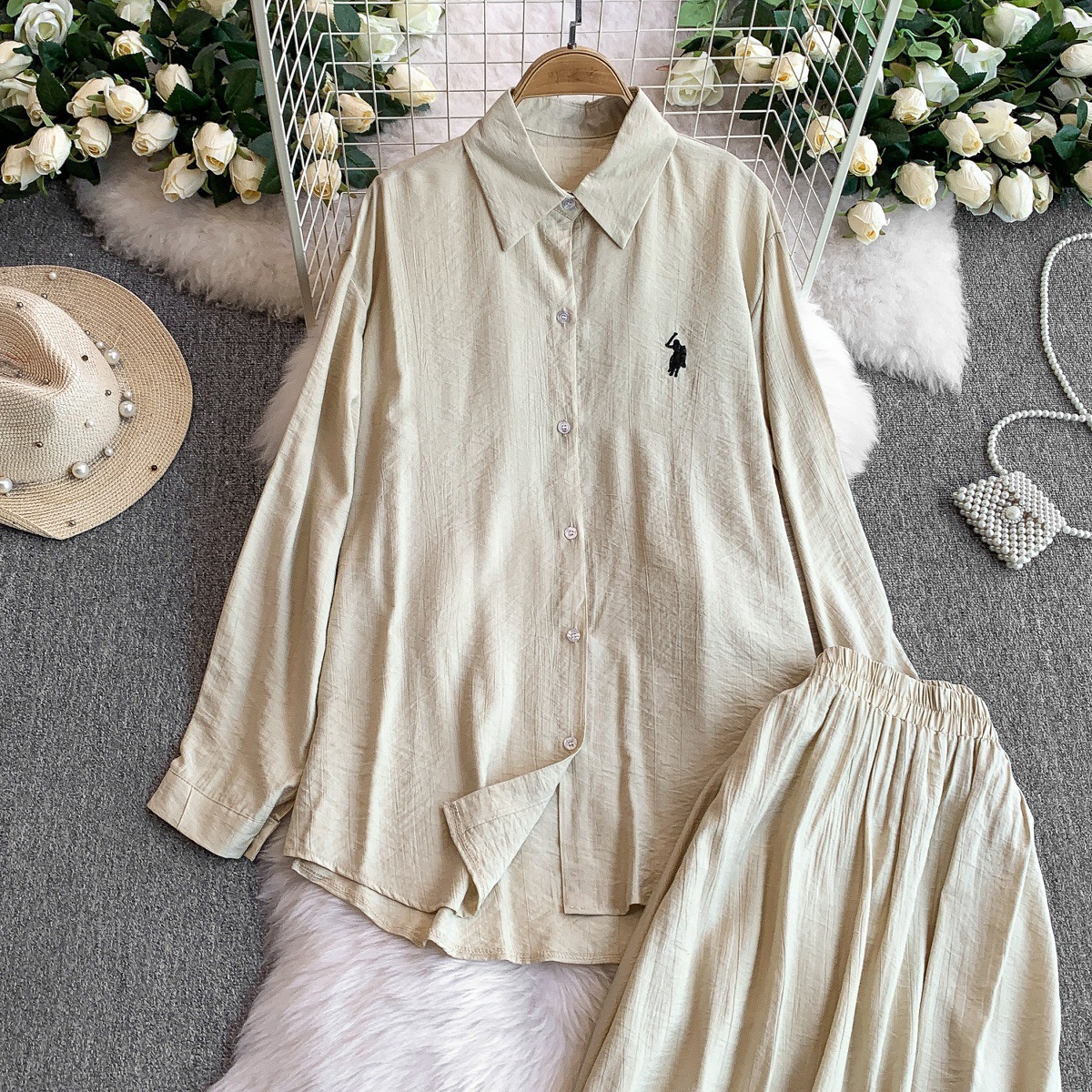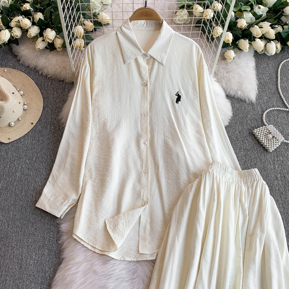 패션 정장 여성 캐주얼 루즈 자수 긴팔 자외선 차단 셔츠 + 하이 웨이스트 슬리밍 스커트 투피스 세트