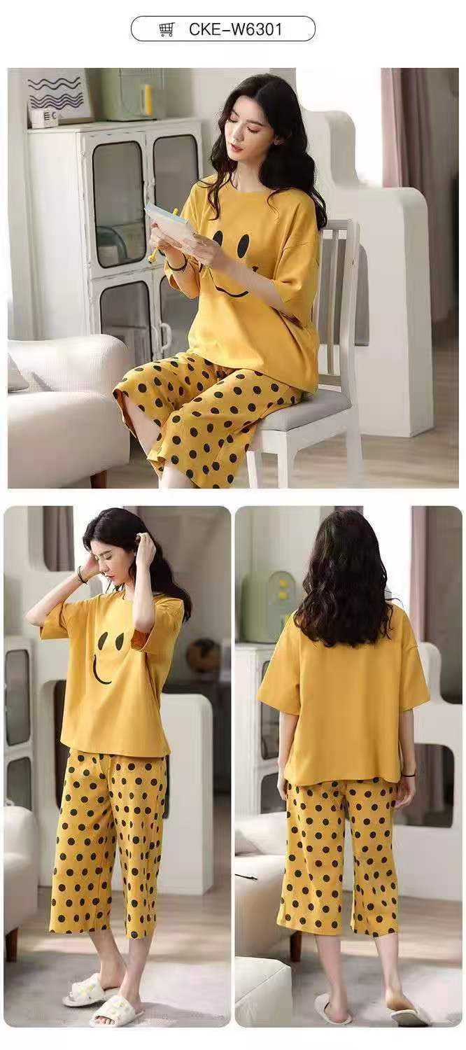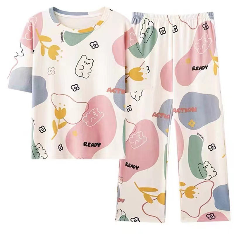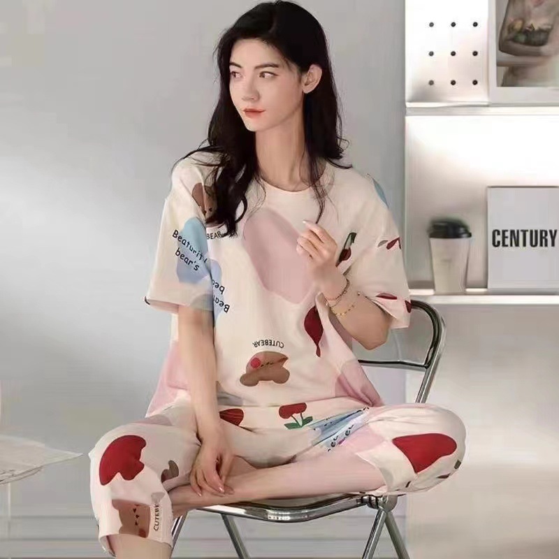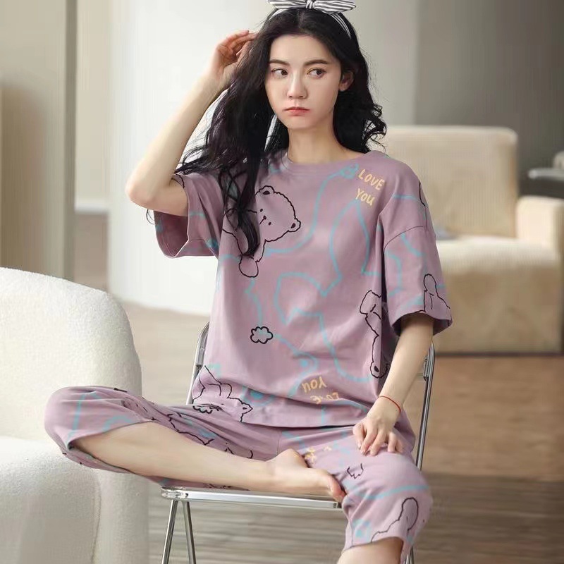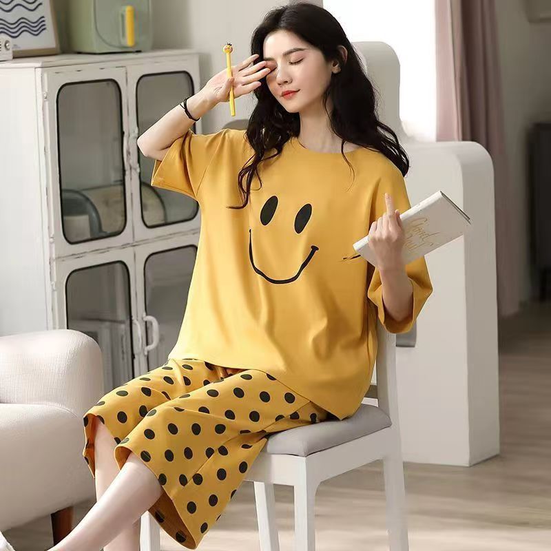 여성용 잠옷, 여름 반팔 크롭 팬츠, 만화 귀엽고 달콤하고 루즈한 대형 사이즈, 집 밖에서 입을 수 있는 옷스토어 가기