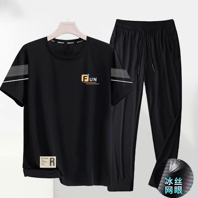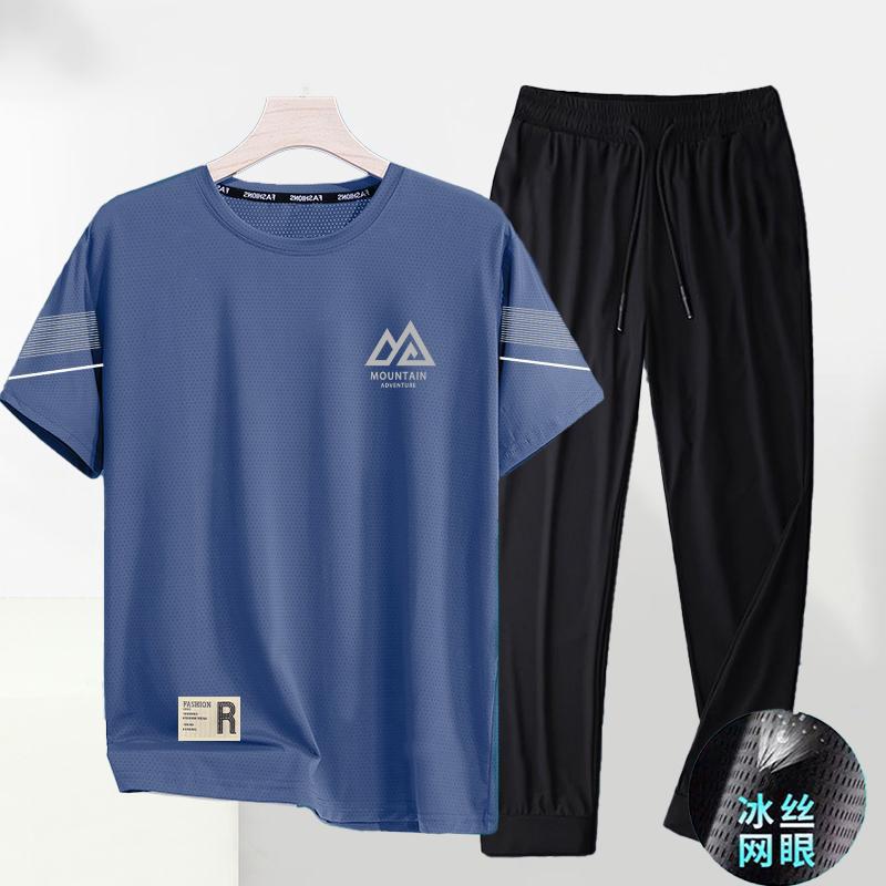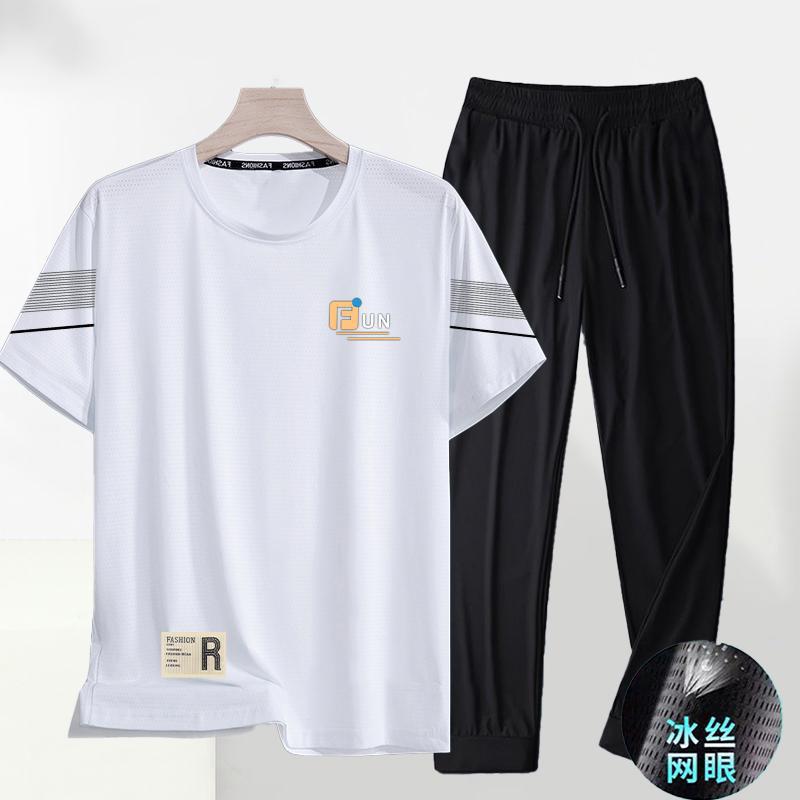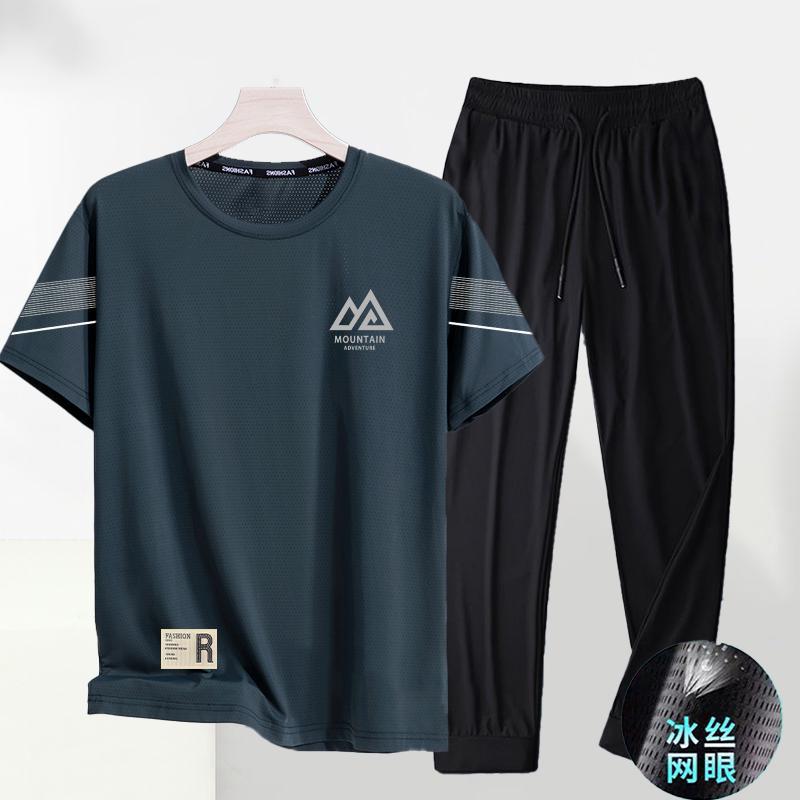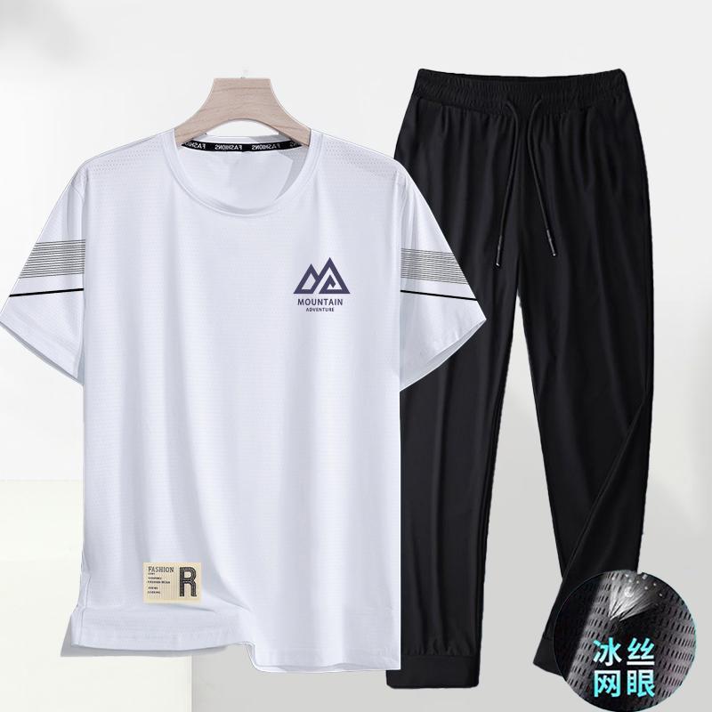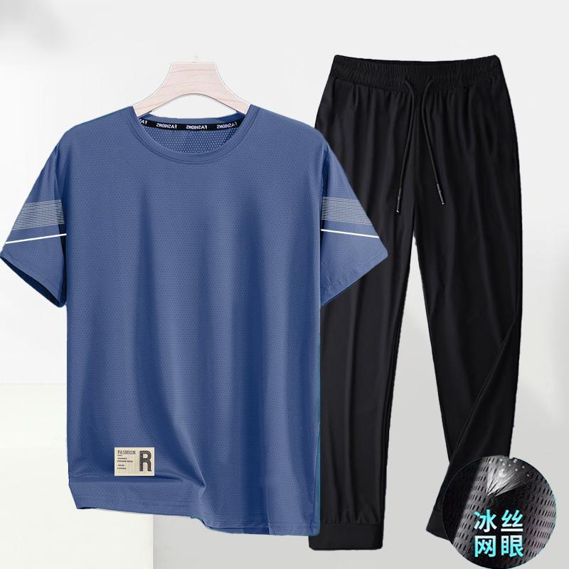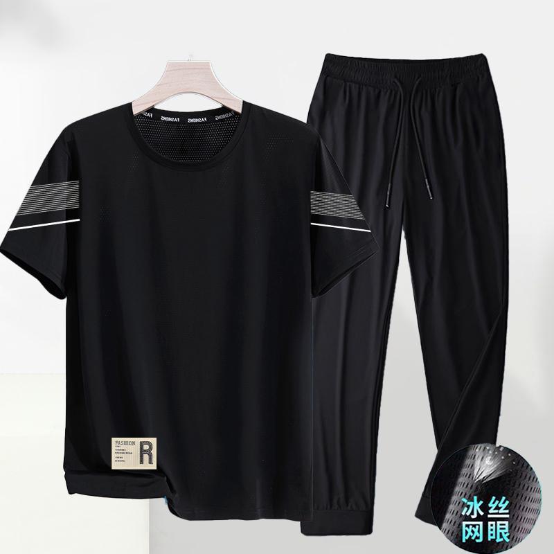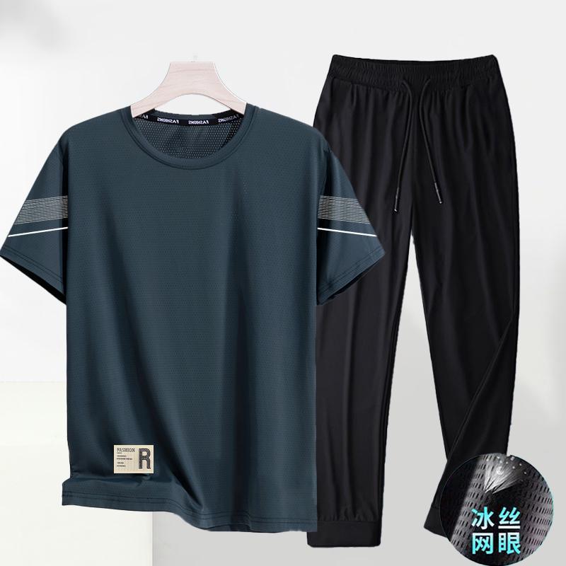 [빠른 배송] 스포츠 슈트 남성 여름 통기성 캐주얼 수분 흡수 슈트 반팔 바지 아이스 실크 투피스 세트