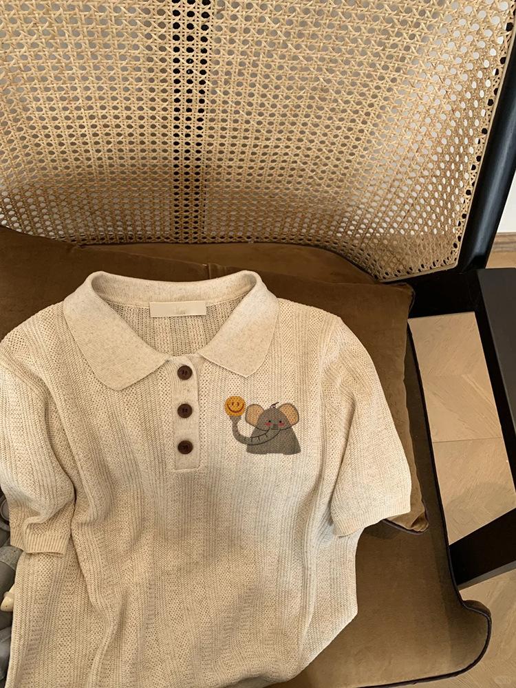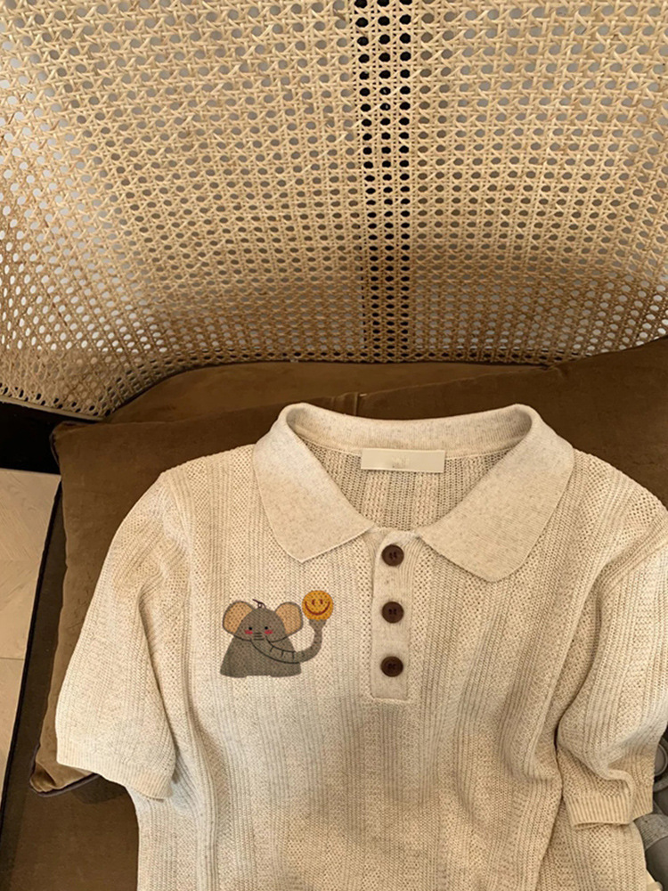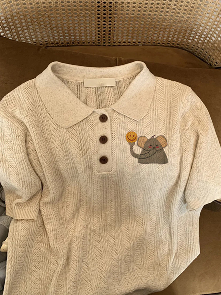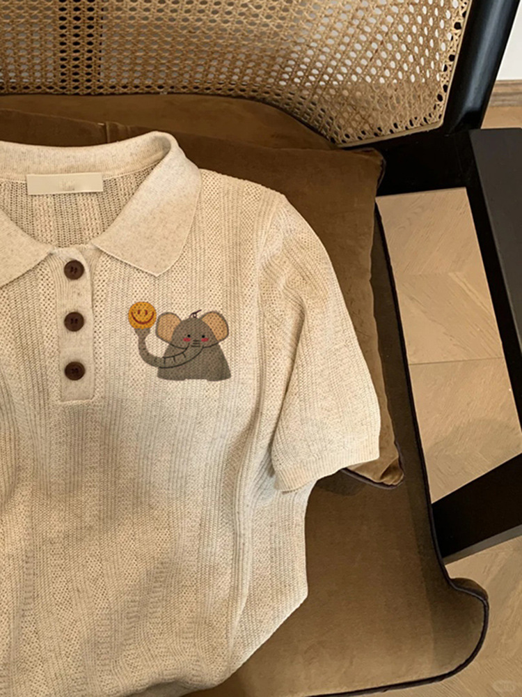 2025년 여름 여성을 위한 오트밀 컬러 니트 코끼리 프린트 티셔츠 새로운 스타일 슈퍼 멋진 독특한 다용도 연령 감소 탑 인스토어 가기
