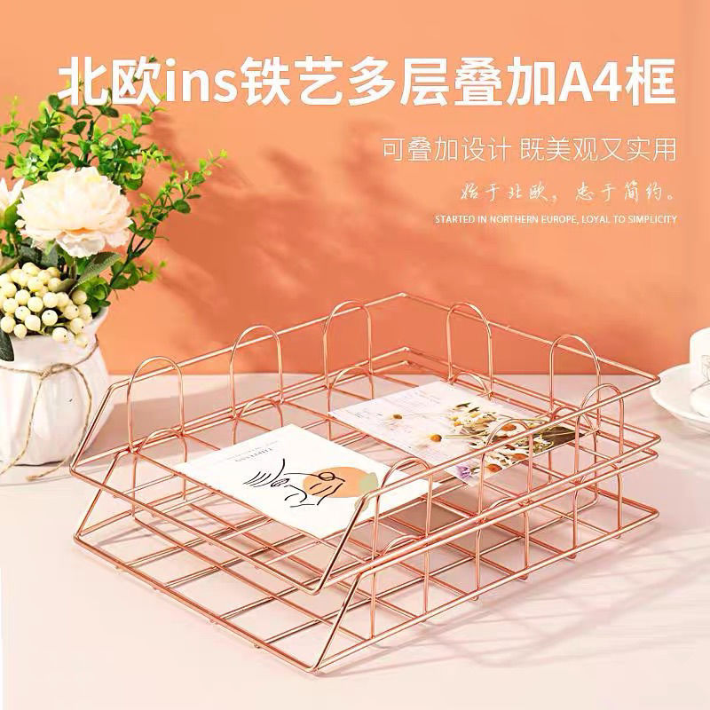 • 더블 레이어 A4 용지 파일 바구니 - 로즈 골드(스태킹 가능)⚑