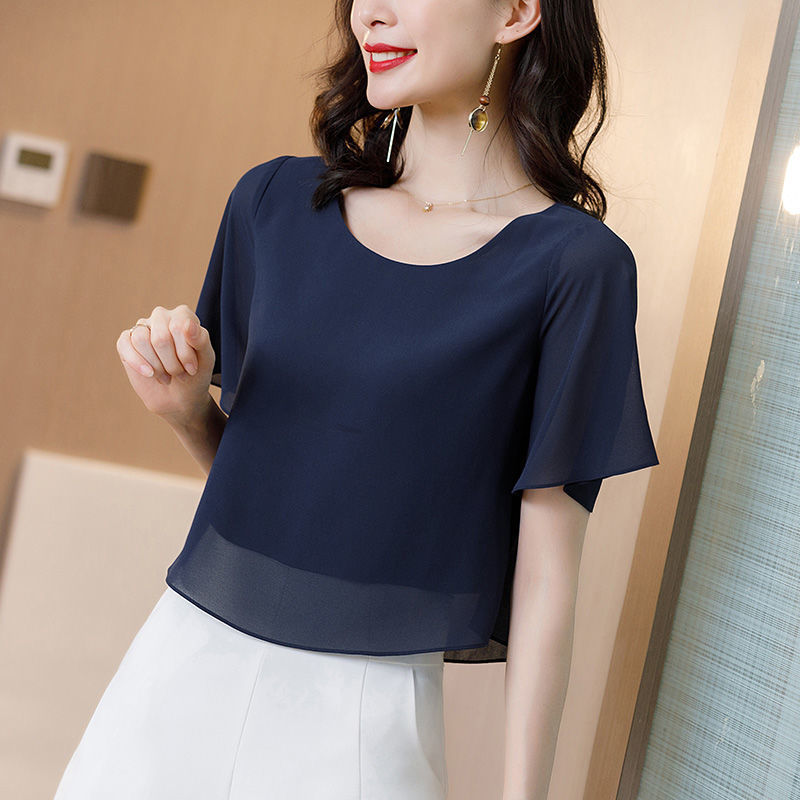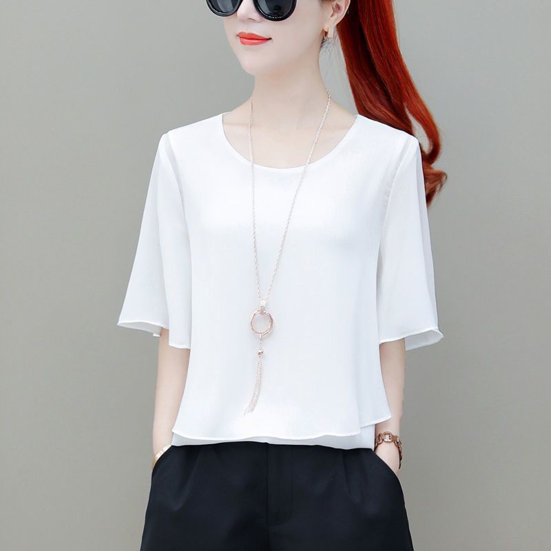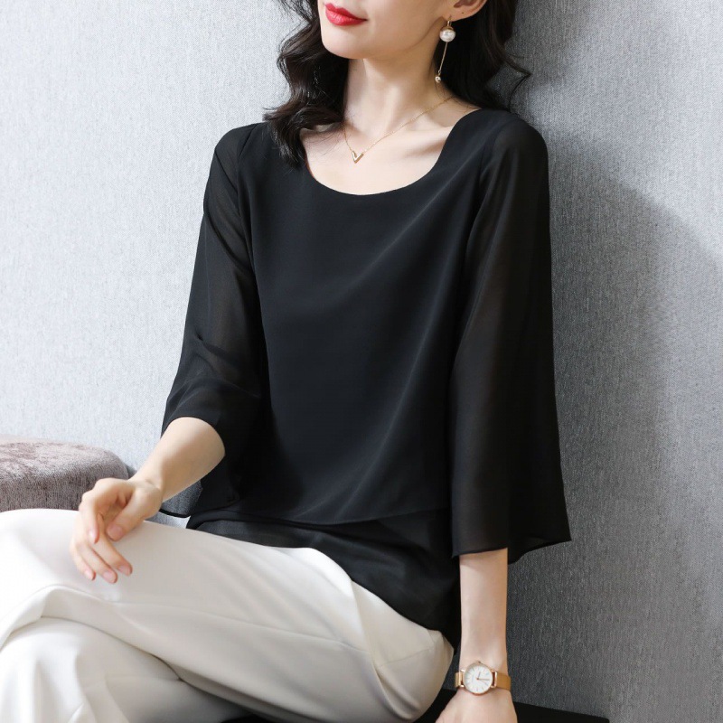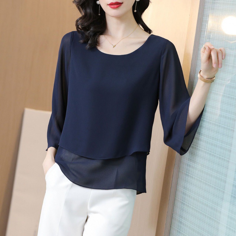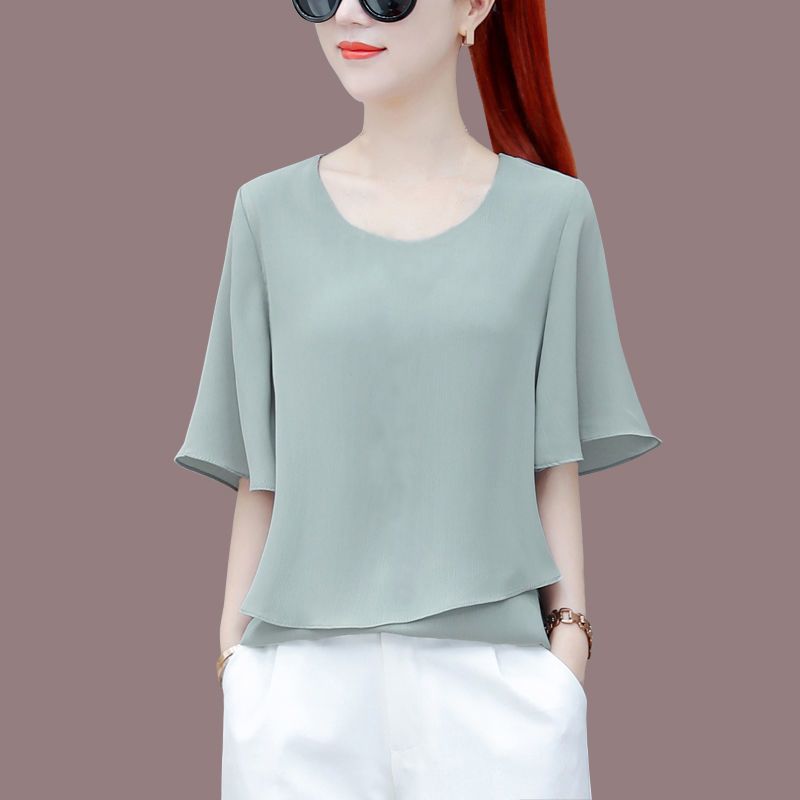 시폰 셔츠 여성용 탑 반팔 2023 중년 어머니 가짜 투피스 뚱뚱한 mm 패션 연령 감소스토어 가기