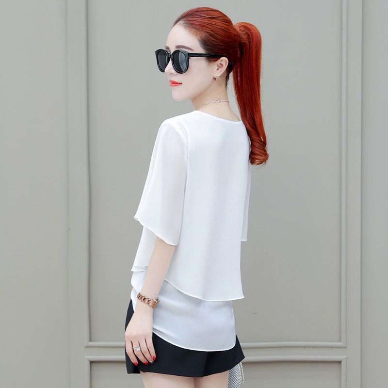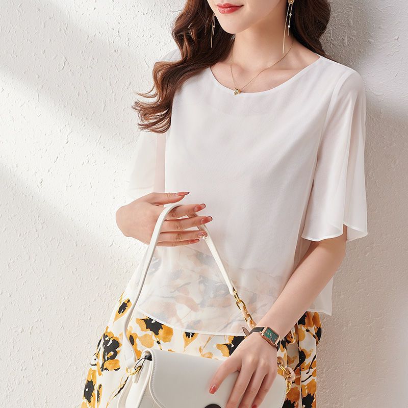 시폰 셔츠 여성용 탑 반팔 2023 중년 어머니 가짜 투피스 뚱뚱한 mm 패션 연령 감소