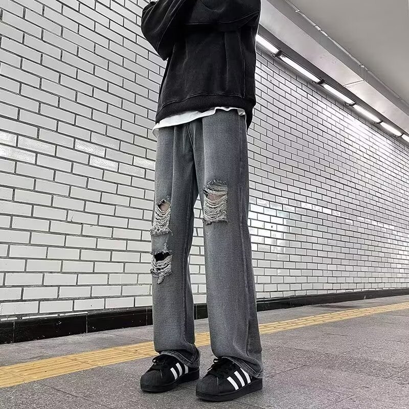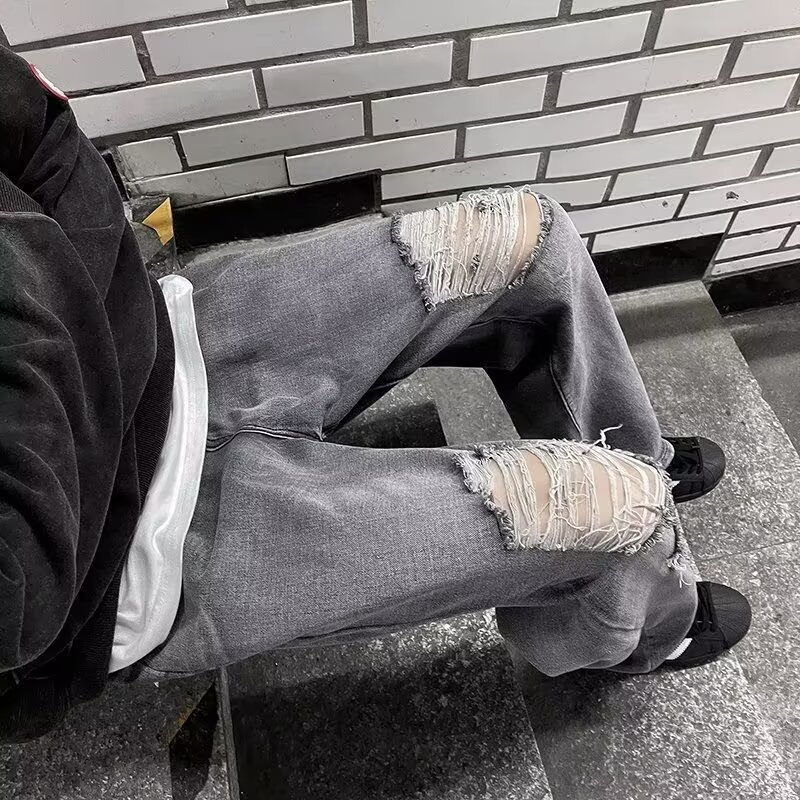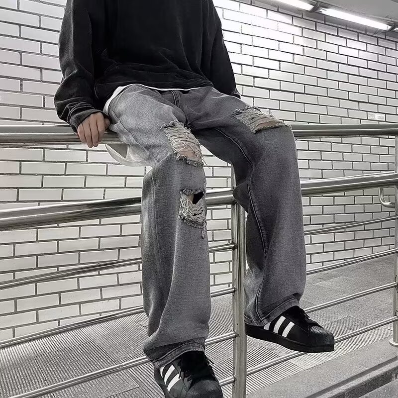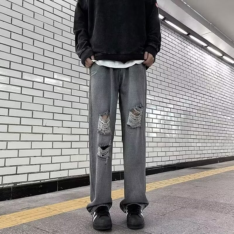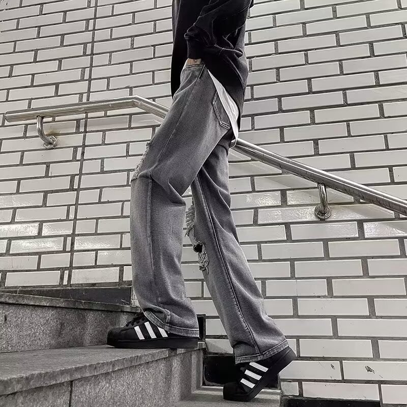 여름 남성용 아메리칸 하이 스트리트 찢어진 청바지, 다재다능한 얇은 스트레이트 트렌디 브랜드 봄, 가을 캐주얼 바닥 길이 바지