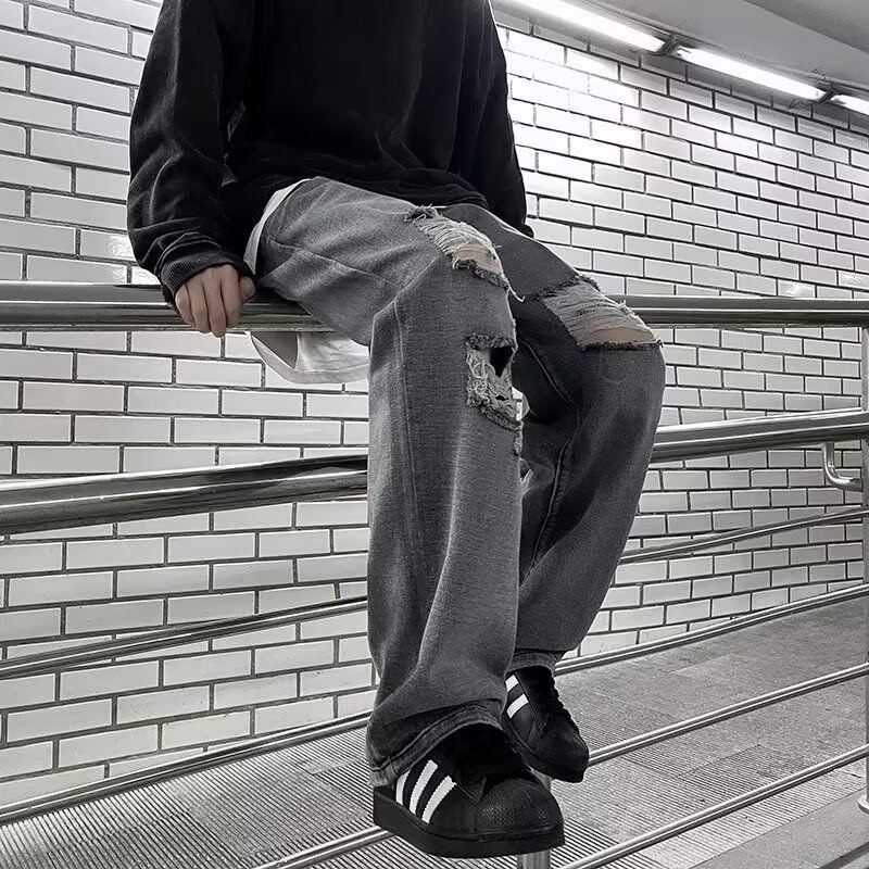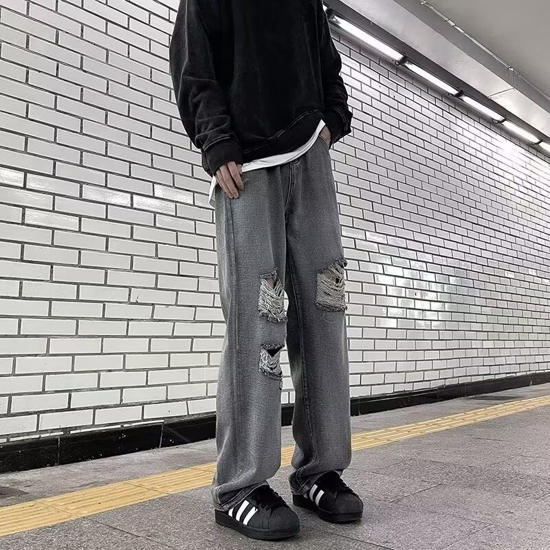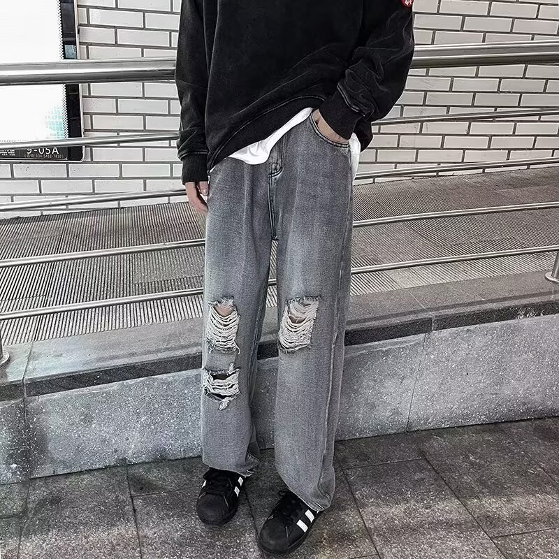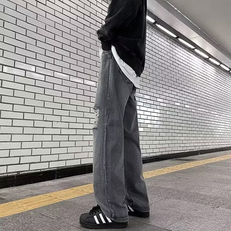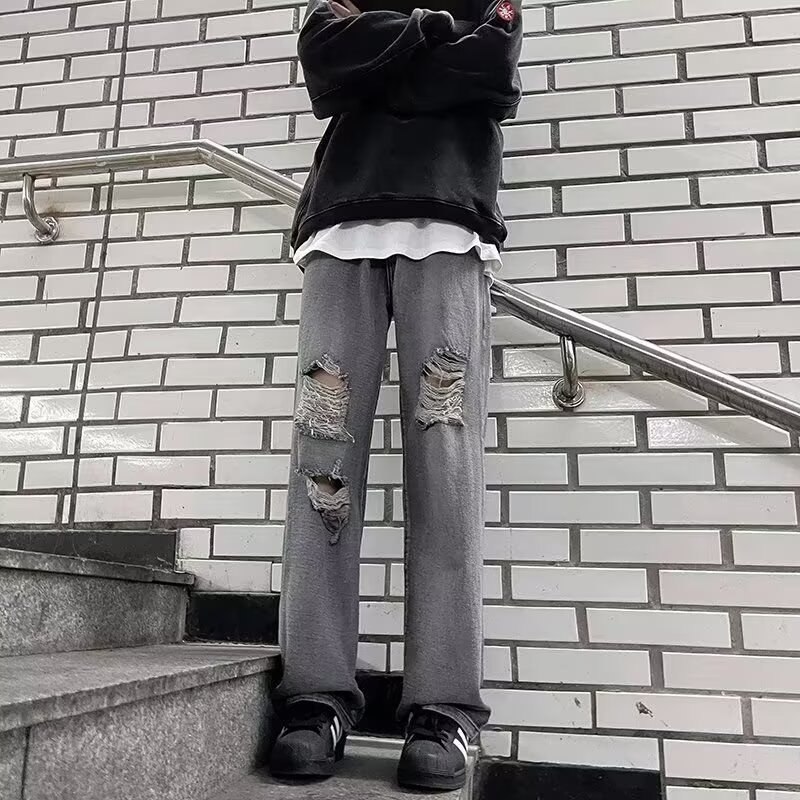 여름 남성용 아메리칸 하이 스트리트 찢어진 청바지, 다재다능한 얇은 스트레이트 트렌디 브랜드 봄, 가을 캐주얼 바닥 길이 바지