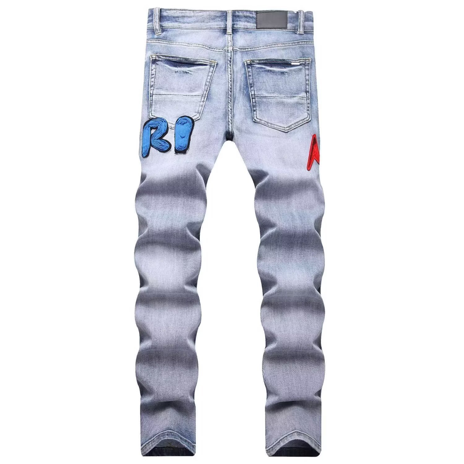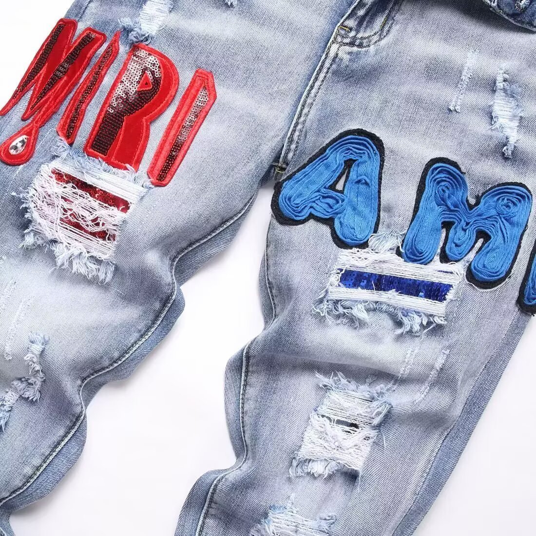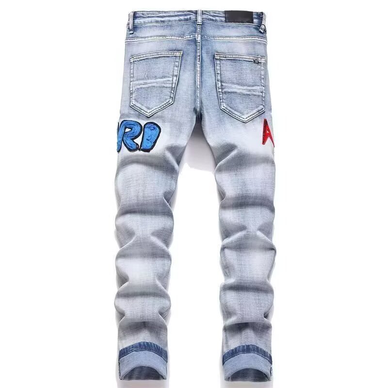 라이트 럭셔리 AM 에미르 하이 버전 레드 및 블루 버프 더블 컬러 매치 찢어진 패치 자수 스트레치 남성 청바지 크로스보더스토어 가기