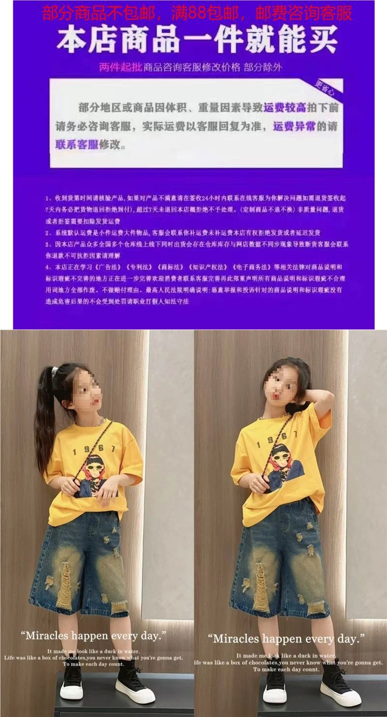 여자 여름 정장 2025 새로운 스타일 어린이 반팔 티셔츠 인쇄 한국 스타일 캐주얼 청바지 투피스 유행 t스토어 가기