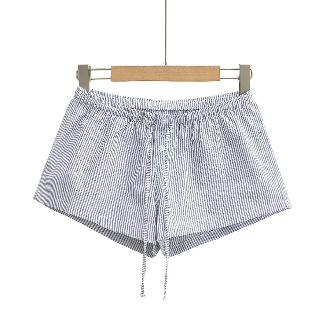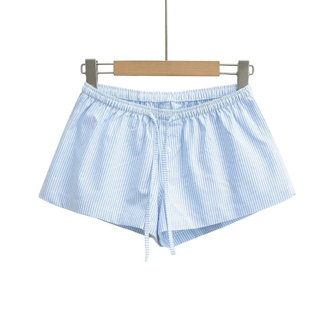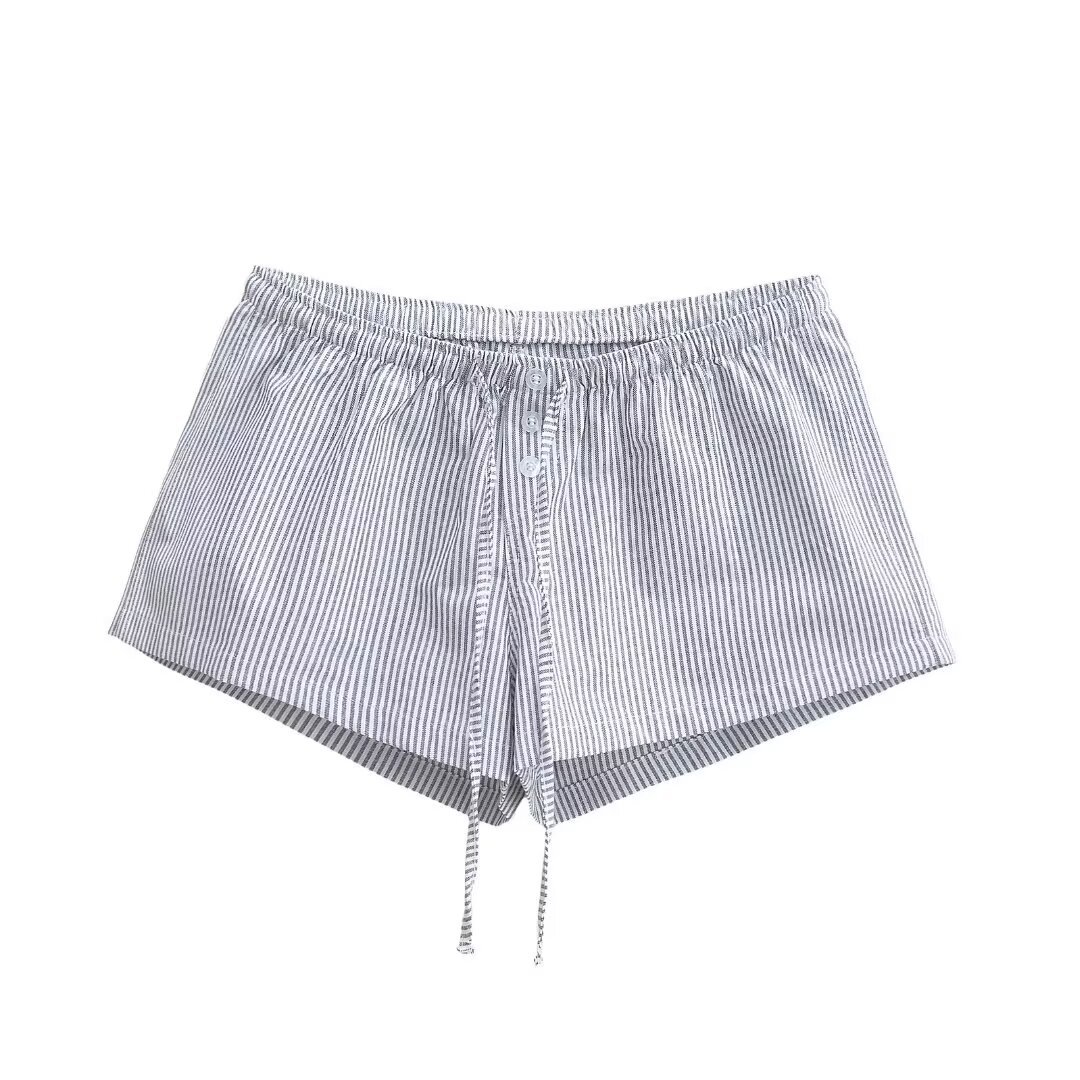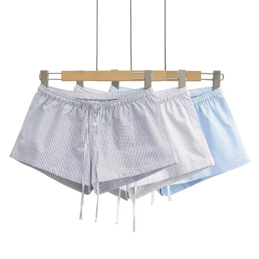 여성을위한 대비 색 줄무늬 버튼 드로스트링 로우 웨이스트 반바지 여름 2025 다목적 신축성있는 허리 루즈 캐주얼 바닥 홈 바지