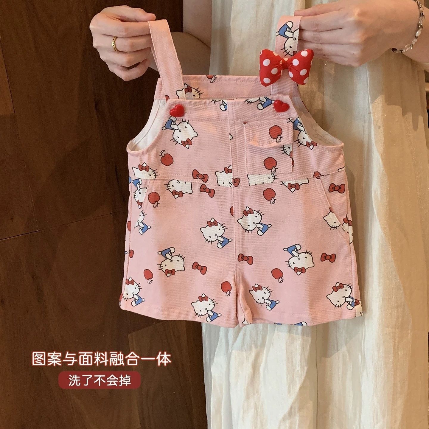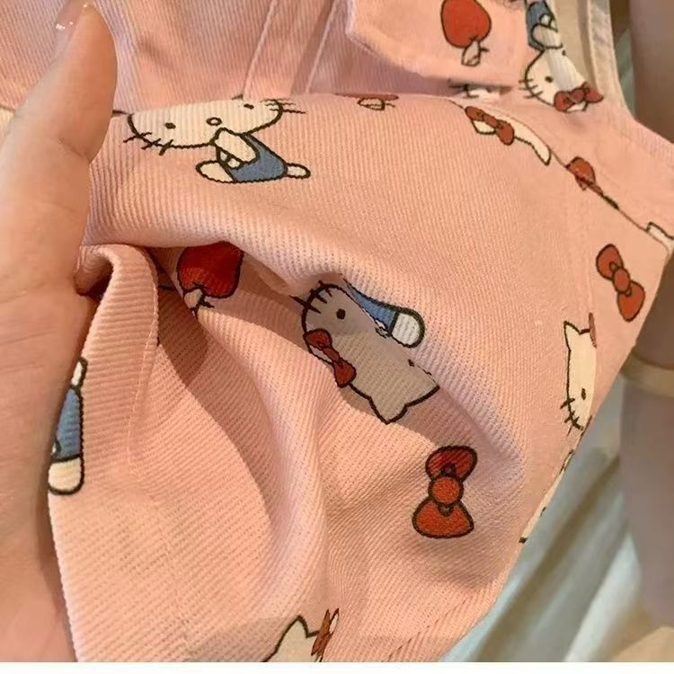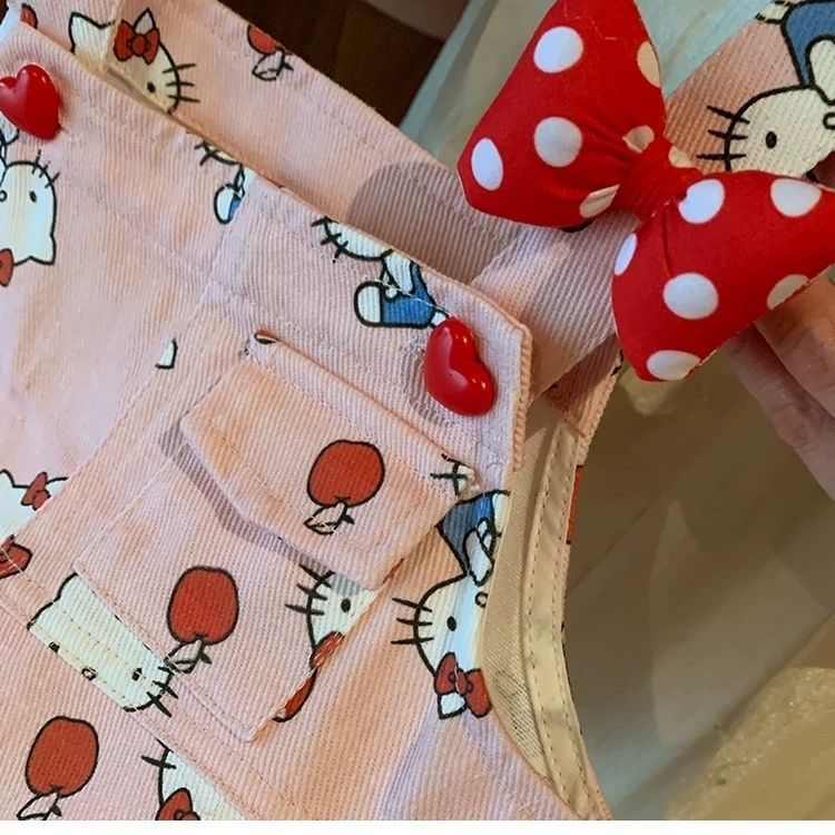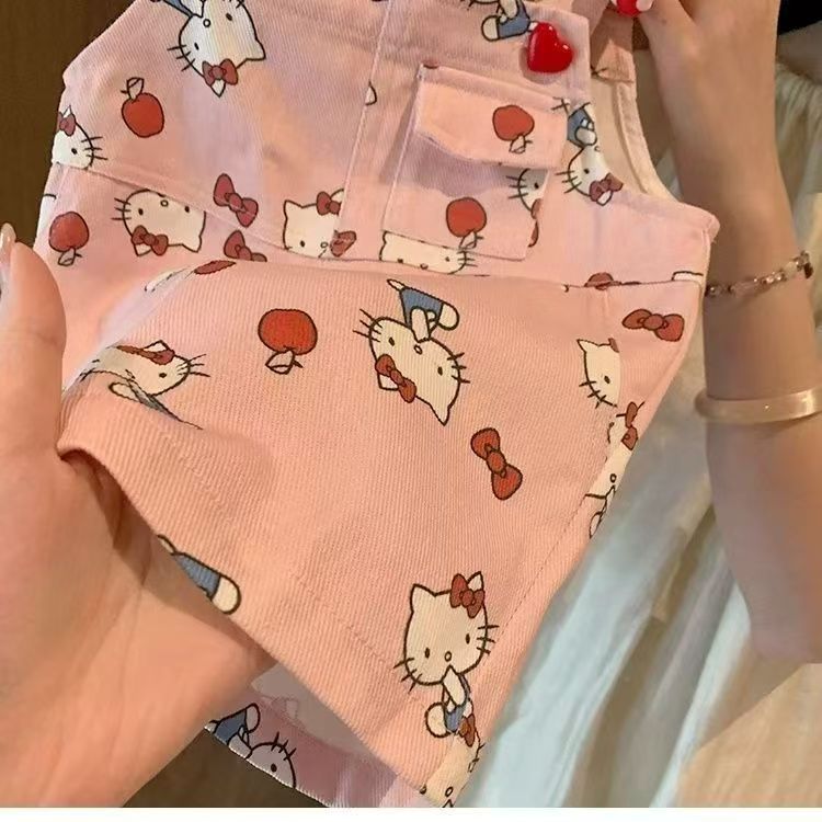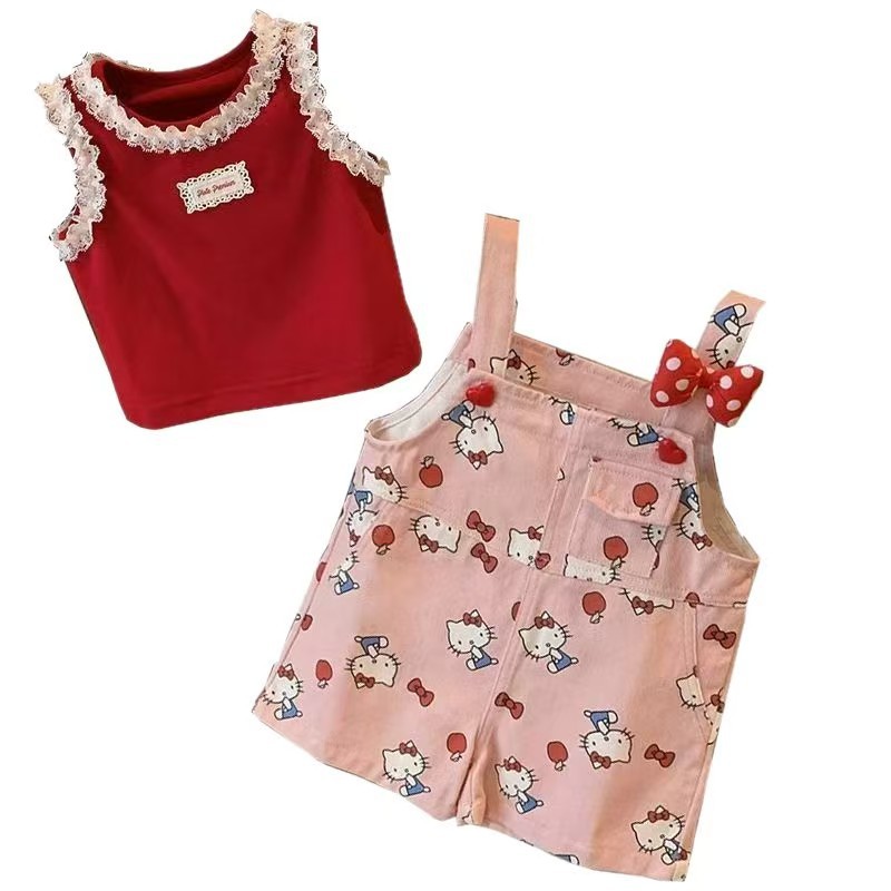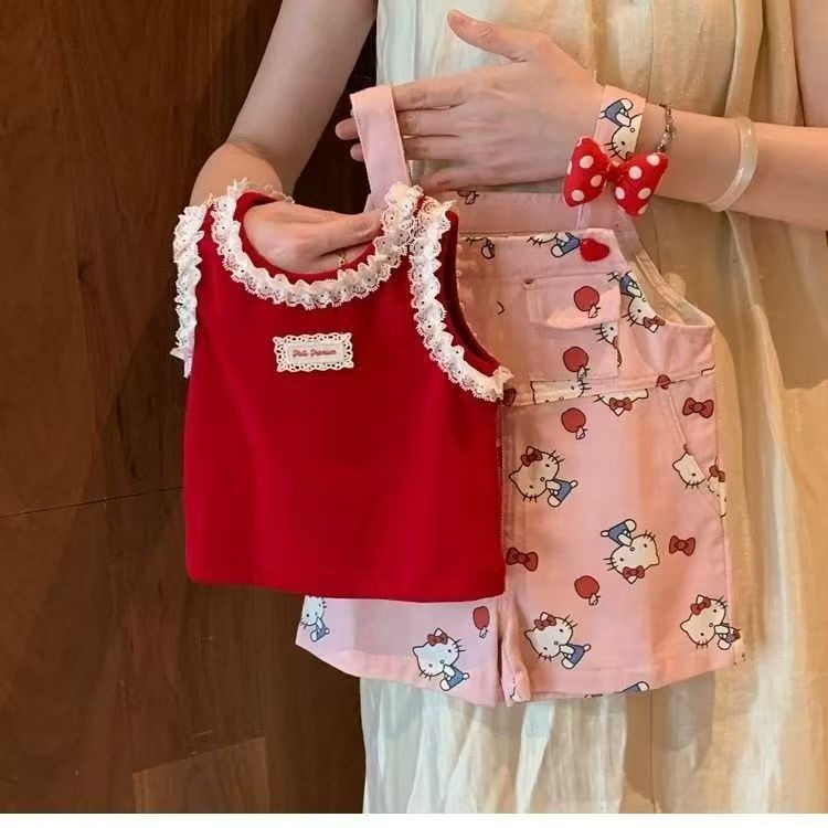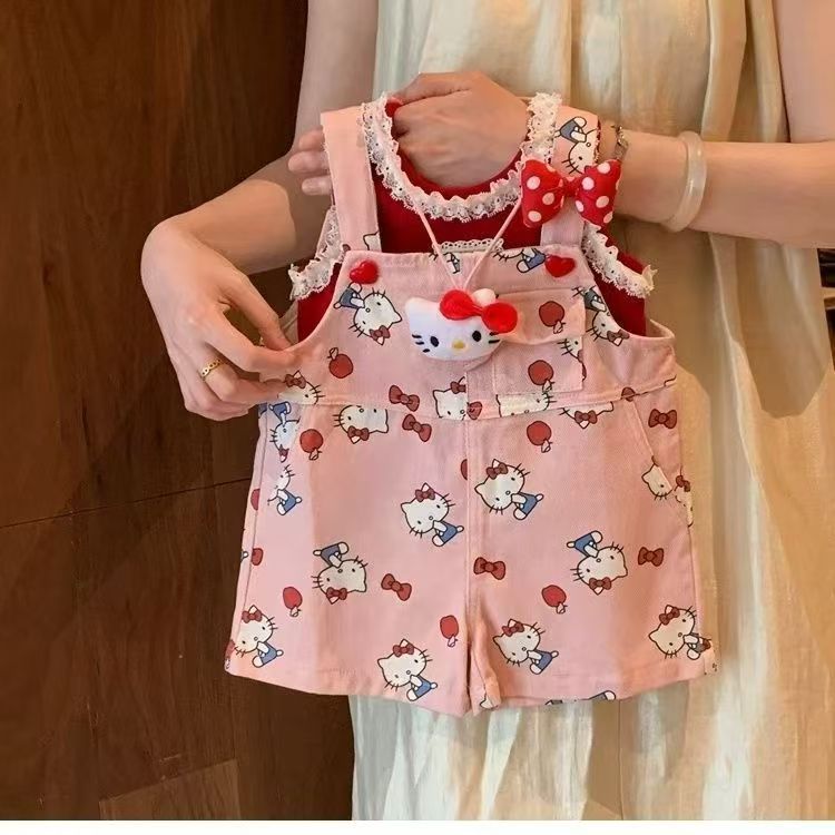 여아용 슈퍼 귀여운 도파민 패션 조절형 KT 고양이 멜빵바지 아동용 점프수트 세트 여름 레이스 조끼