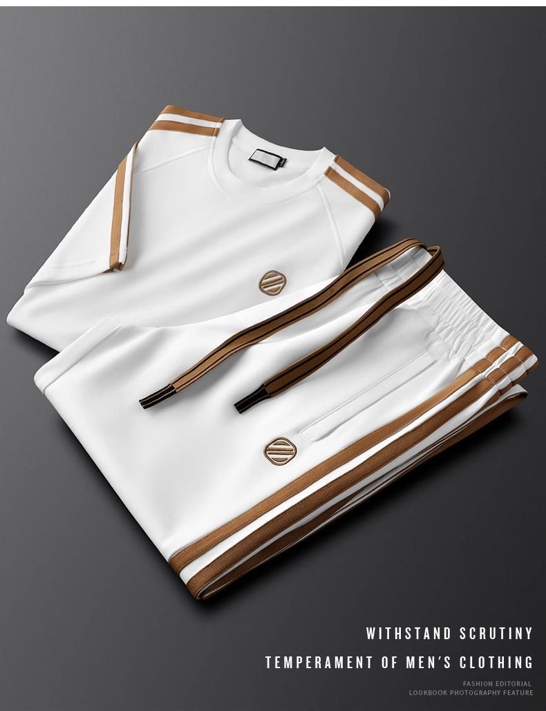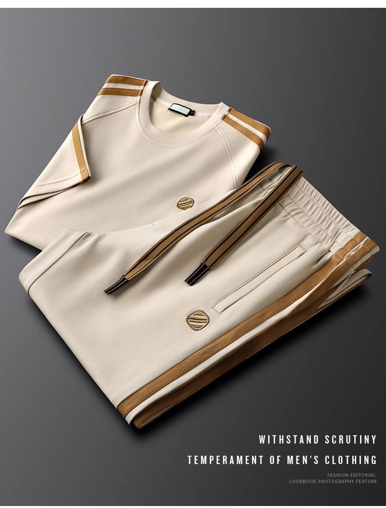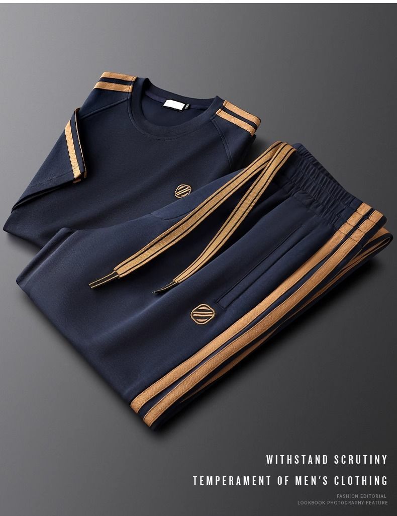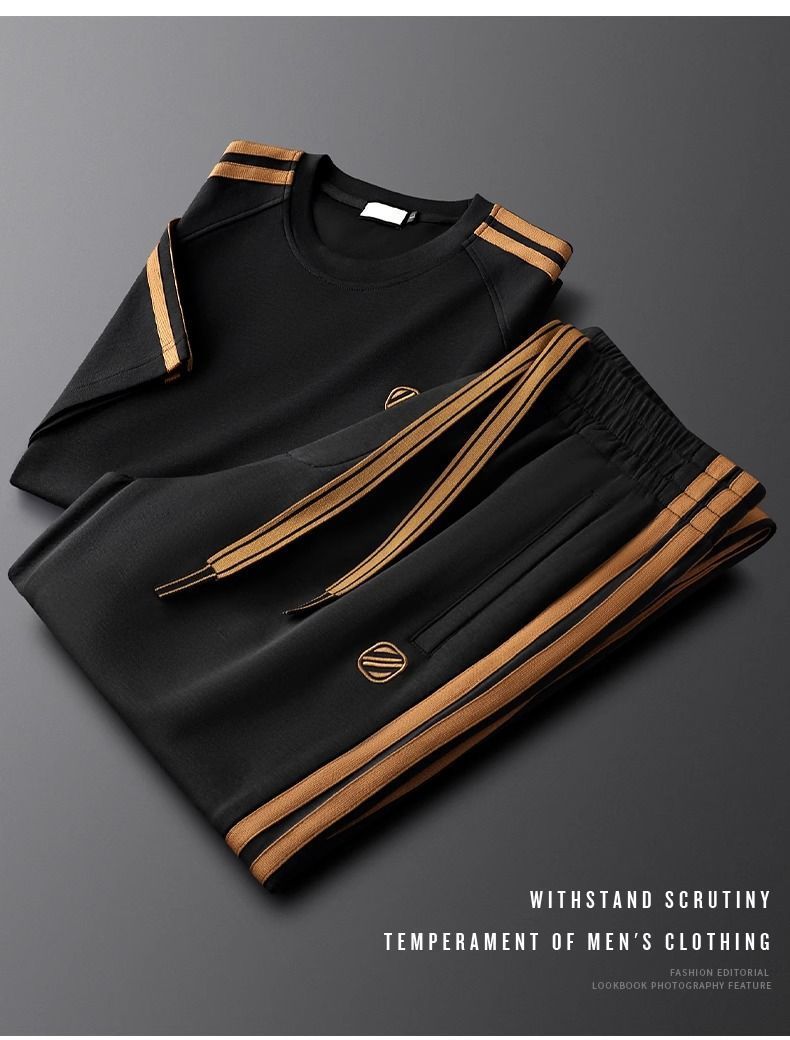 여름 사이드 스트라이프 캐주얼 스포츠 정장 남성용 반팔 티셔츠 스몰 스트레이트 스웨트 팬츠 투피스 세트 남성용 여름 정장