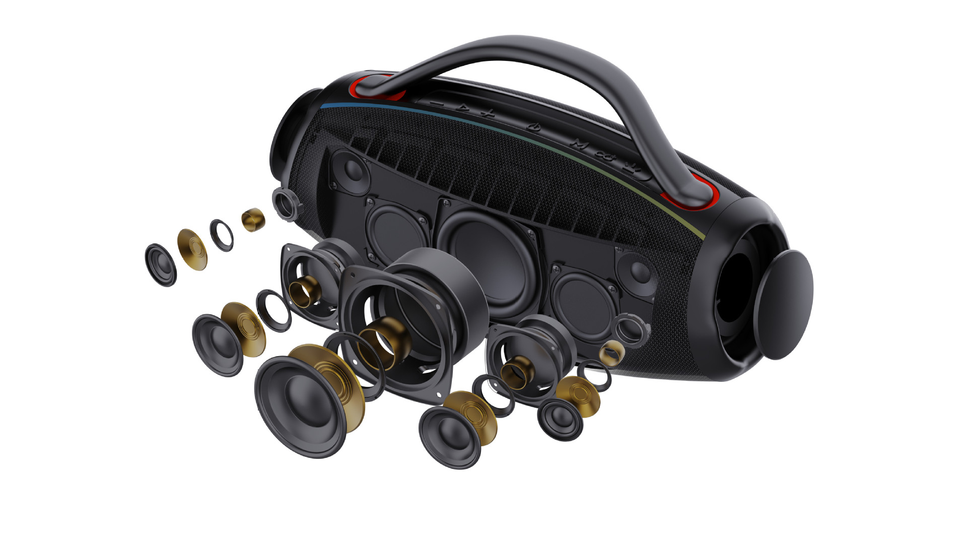 便携式蓝牙扬声器,带有4英寸*1低音箱+2.5英寸*2中端扬声器+2*1.5英寸扬声器 +被动散热器*2