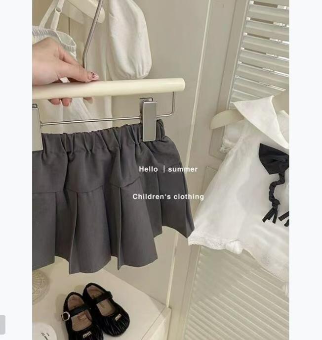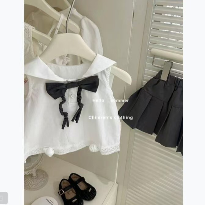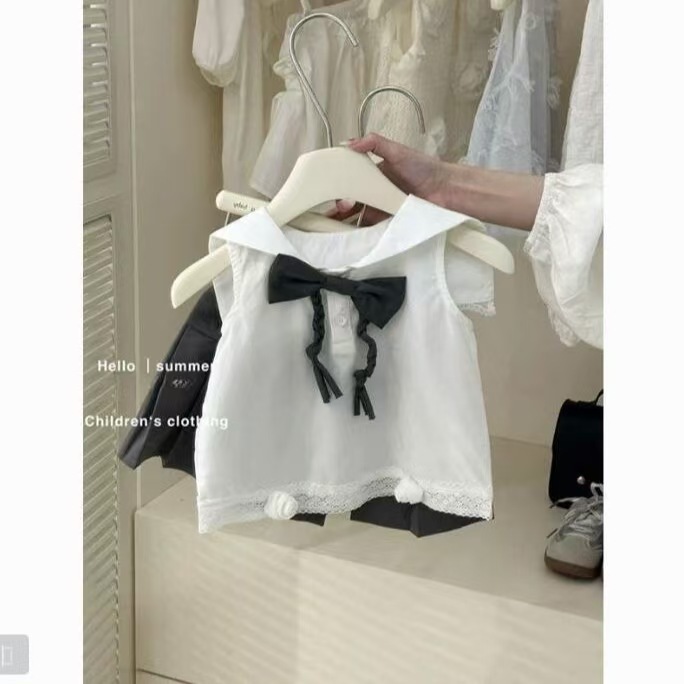 여자 2025 새로운 여름 정장 유행 아기 소녀 해군 칼라 민소매 조끼 정장 스커트 투피스 세트
