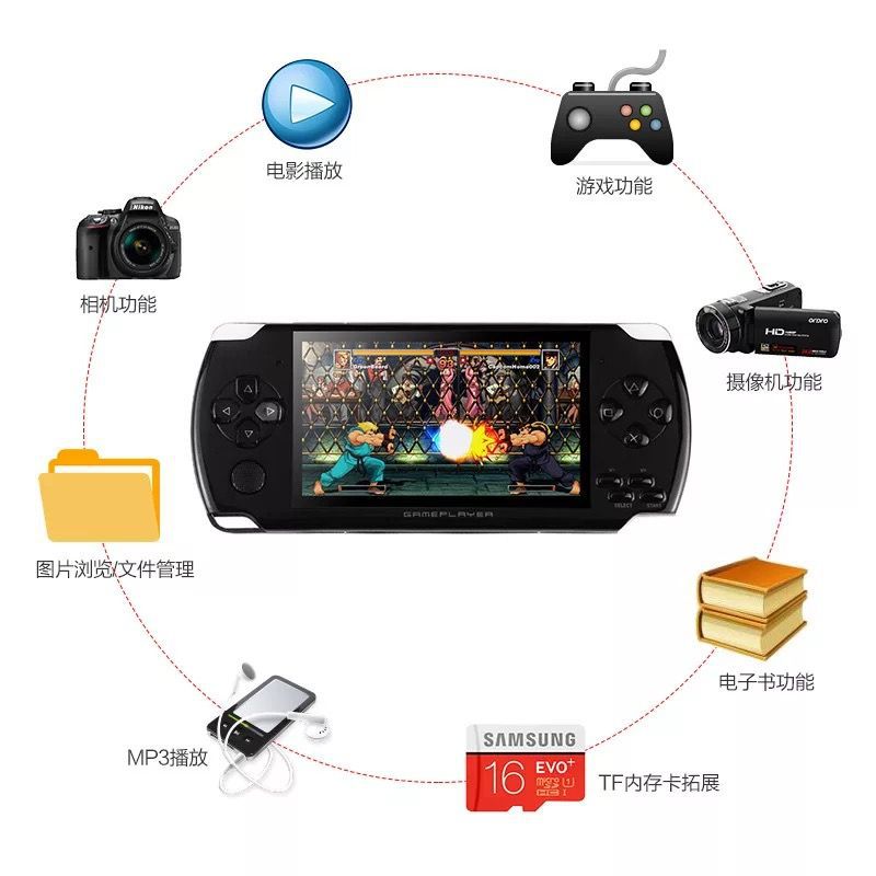 휴대용 게임 콘솔, 향수를 불러일으키는 구식 아케이드 게임, 소형 휴대용 카드, 킹 오브 파이터스, 콘트라, 테트리스, PSP