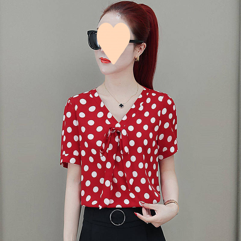 • 2053 폴카 도트 쉬폰 레드 반소매