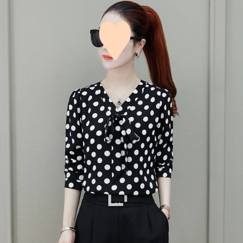 2025 봄 여름 한국 스타일 칼라 폴카 도트 프린트 셔츠 여성 긴팔/반팔 쉬폰 셔츠 탑 여성용 바닥 셔츠