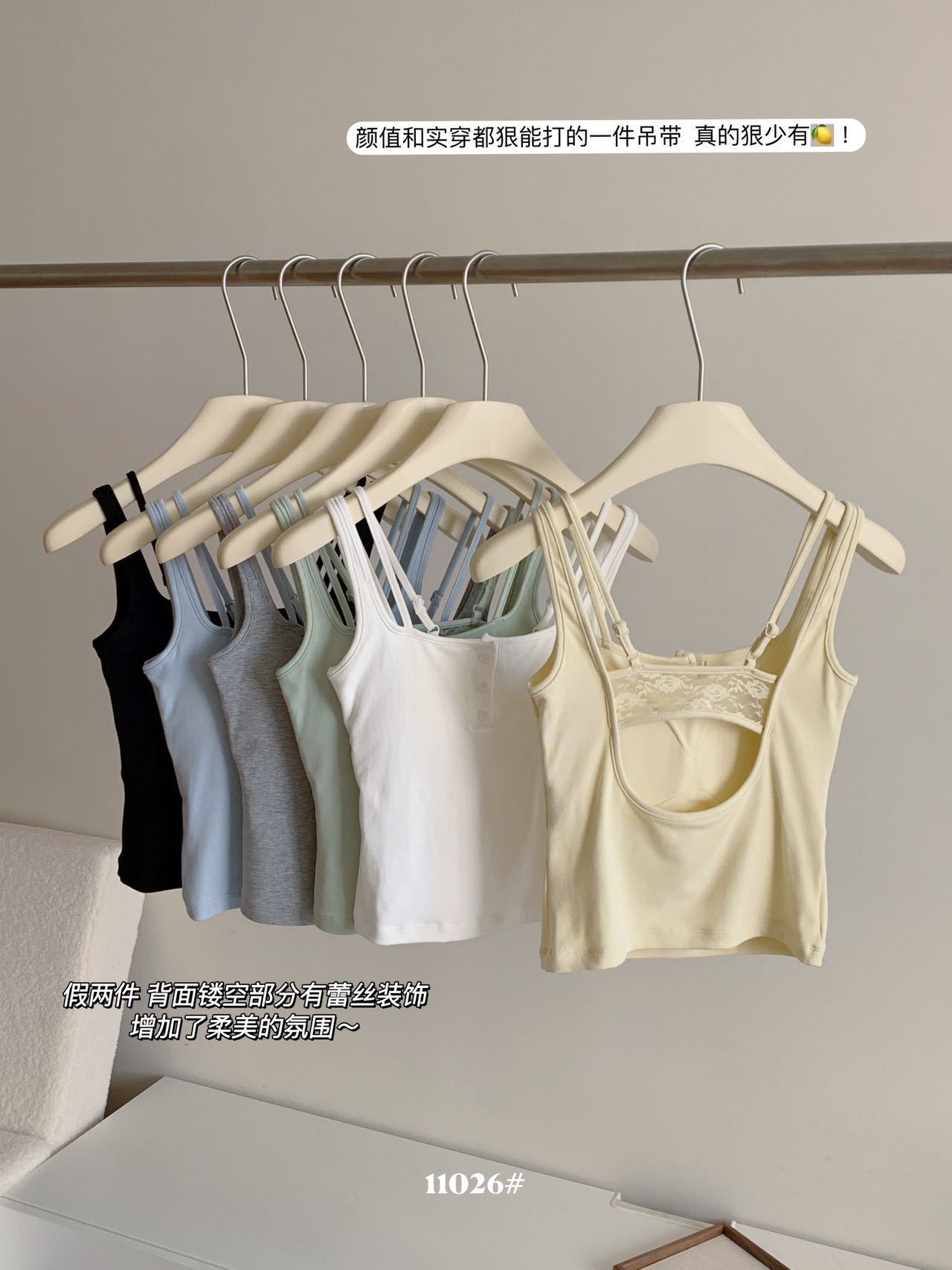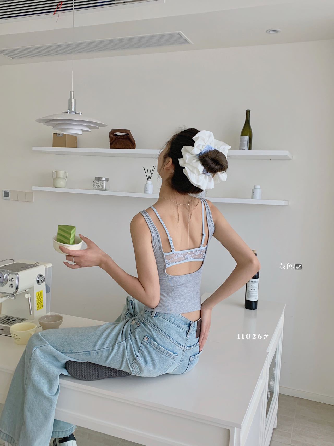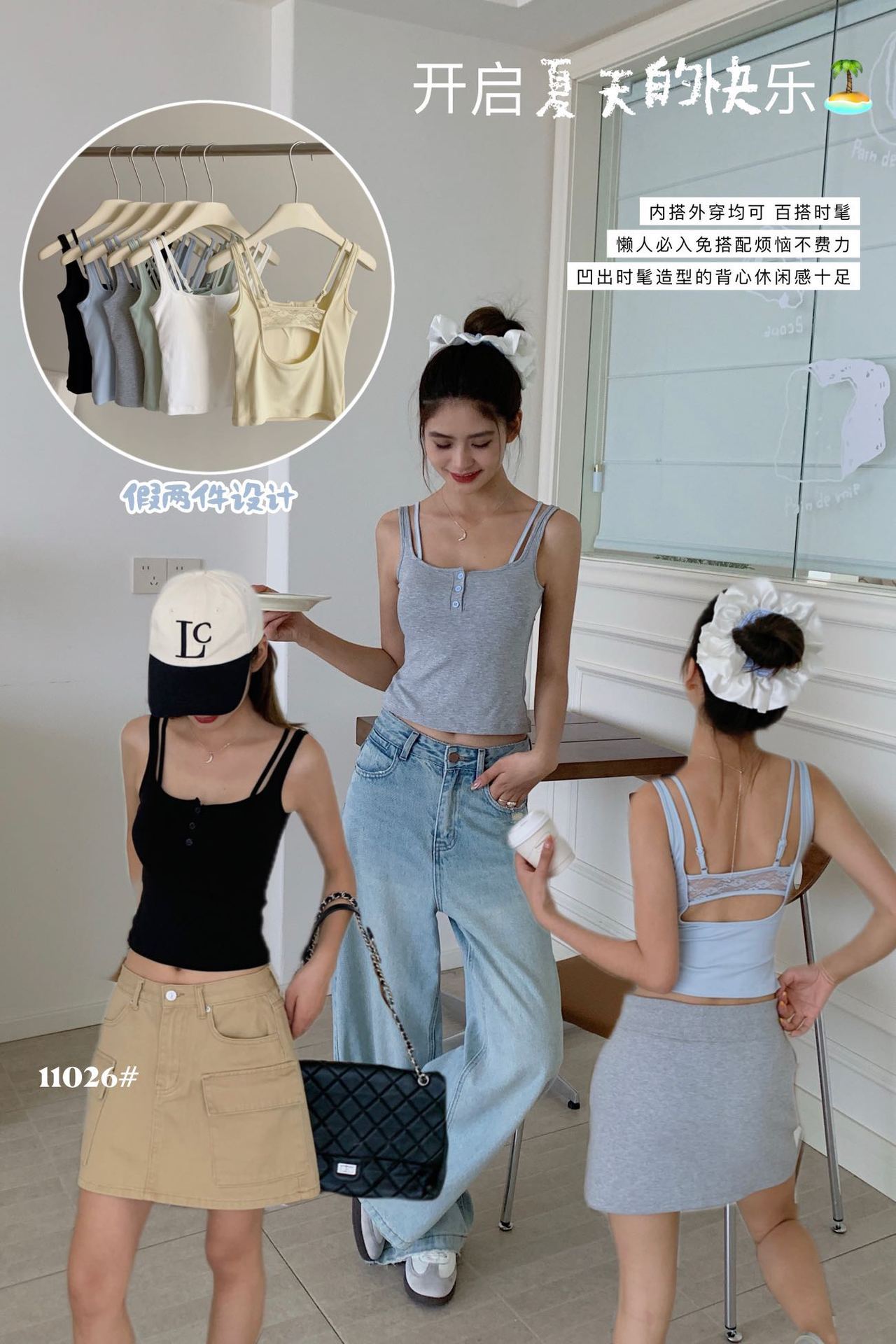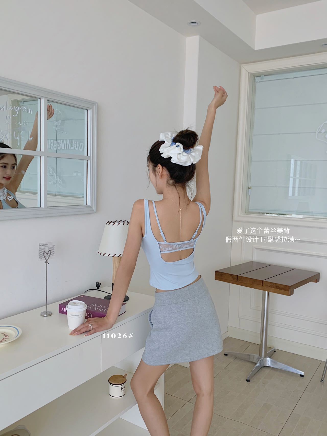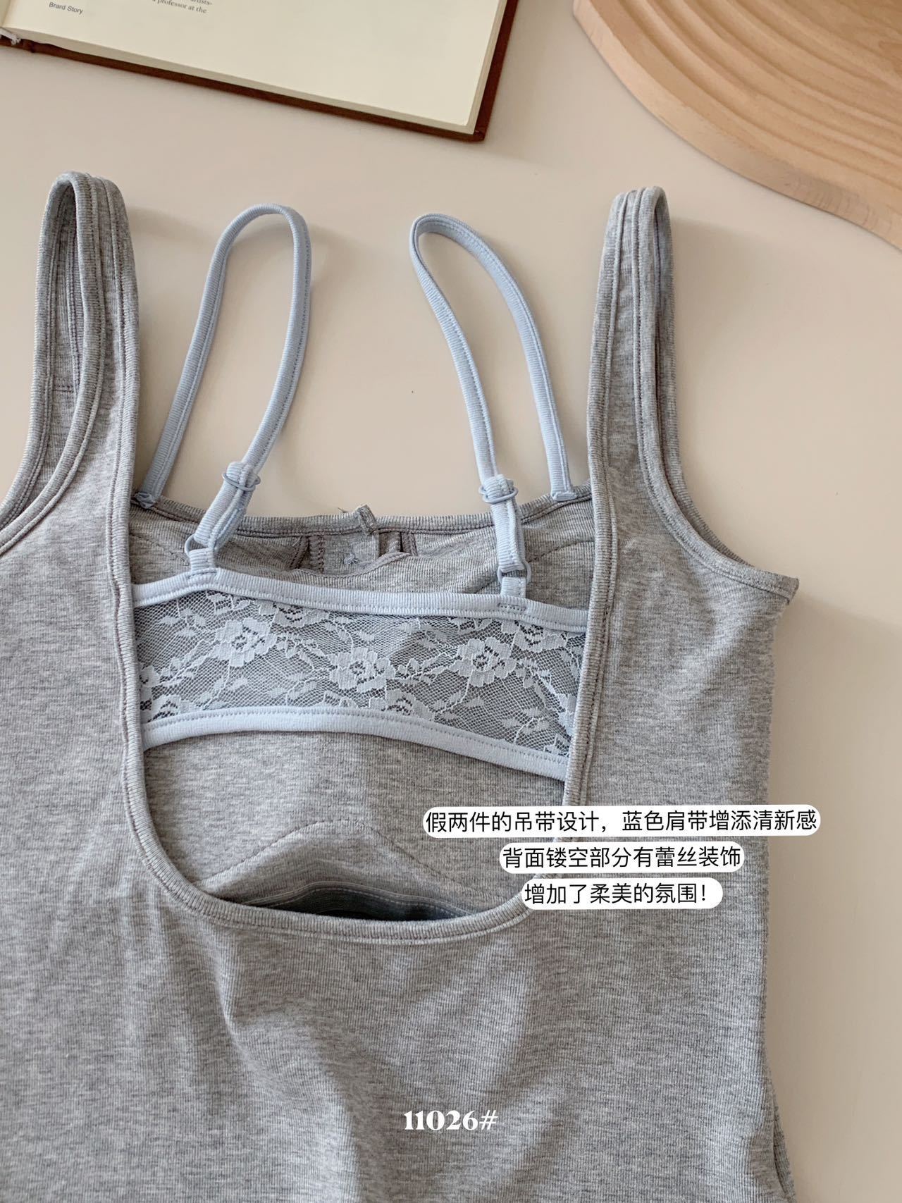 11026 가짜 투피스 캐미솔 고정 가슴 패드 달콤하고 매운 레이스 중공 아름다운 등 슬림핏 다용도 민소매 탑
