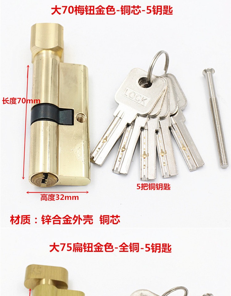 • 대형 70 플랫 버튼 금-구리 코어-5 키-35-50mm-범용 유형-키 포함