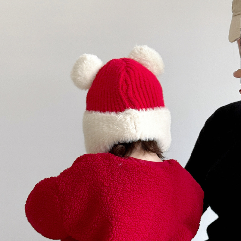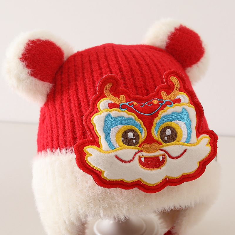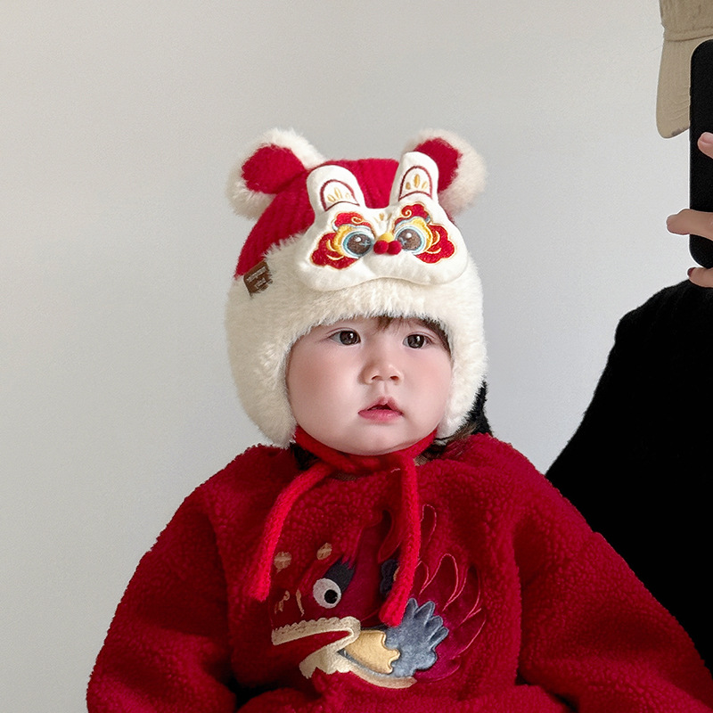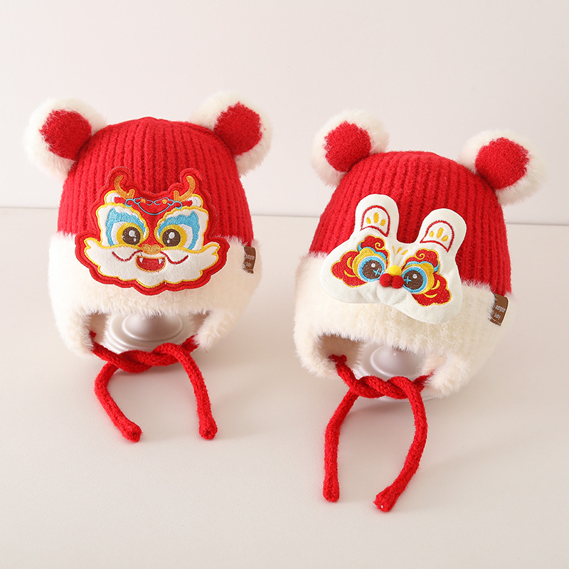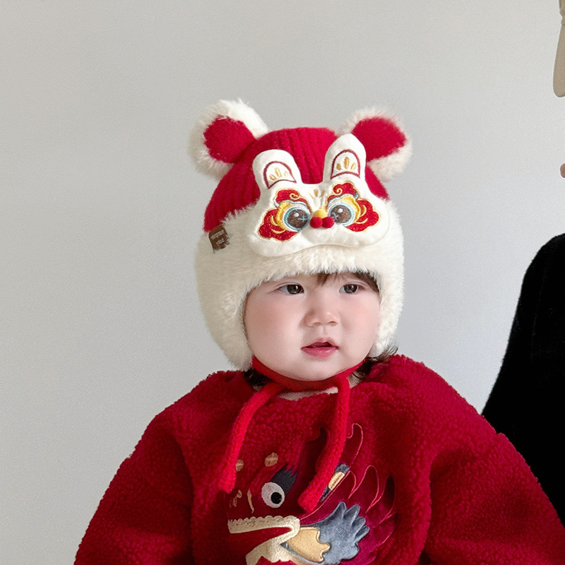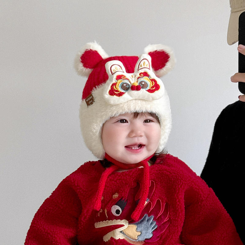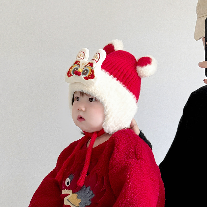 아기 모자 겨울 빨간색 모직 모자 축제 사자 깨우기 한 살짜리 모자 유아 두꺼운 따뜻한 니트 귀 보호 모자스토어 가기