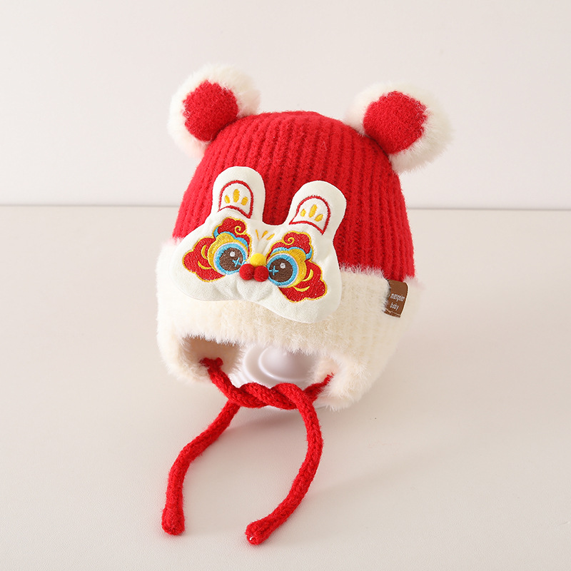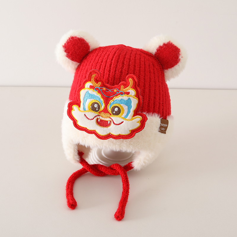 아기 모자 겨울 빨간색 모직 모자 축제 사자 깨우기 한 살짜리 모자 유아 두꺼운 따뜻한 니트 귀 보호 모자