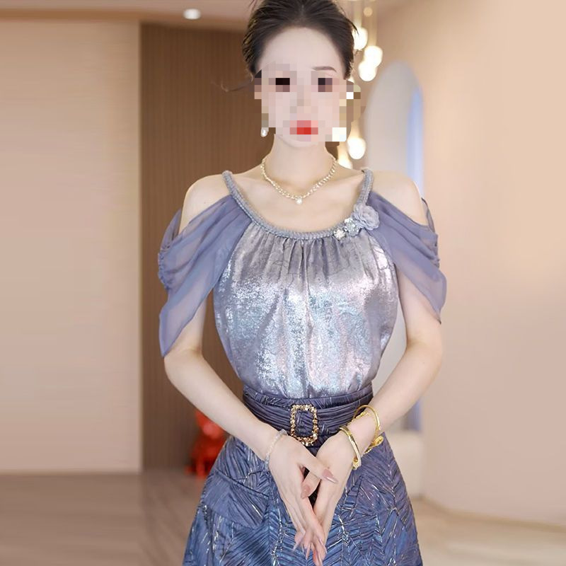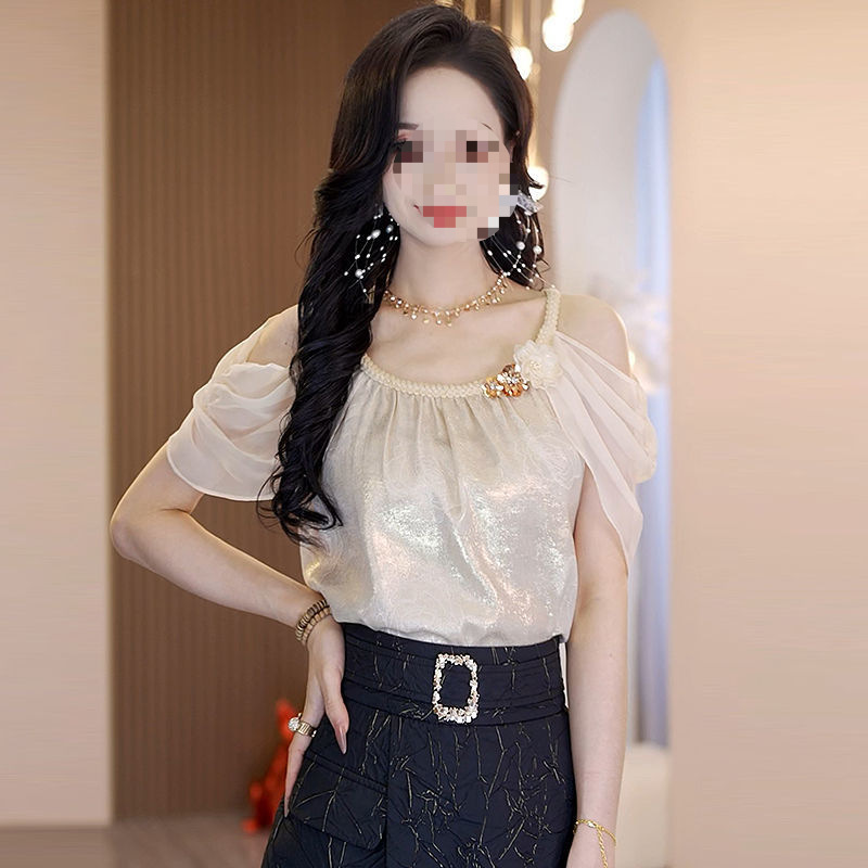 2025 신상 쉬폰 셔츠, 스플라이스 홀터넥 오프숄더 셔츠, 여성용 상의, 아름답고 유니크한 셔츠, 새틴 셔츠