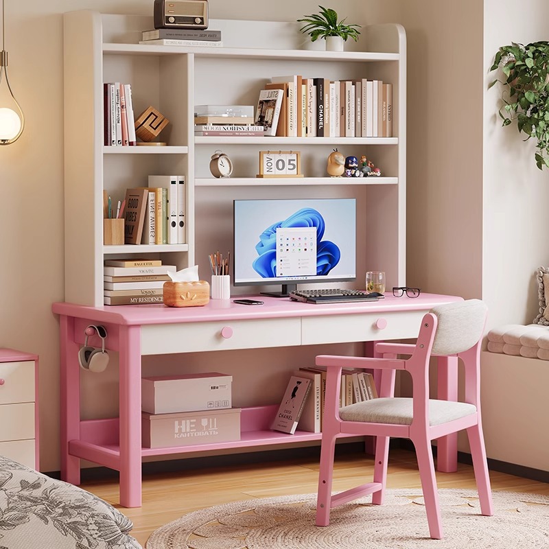 • 핑크색과 흰색 테이블 + 높은 책장 [엄선된 두꺼운 목재]
