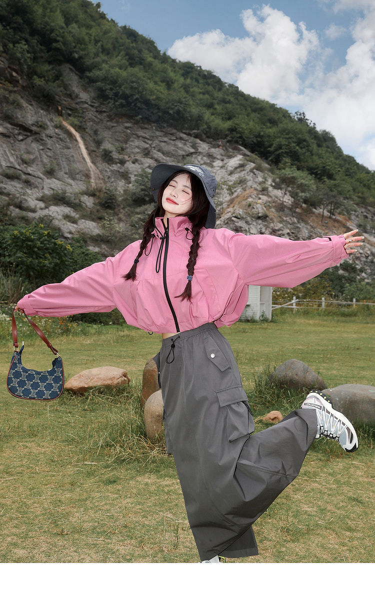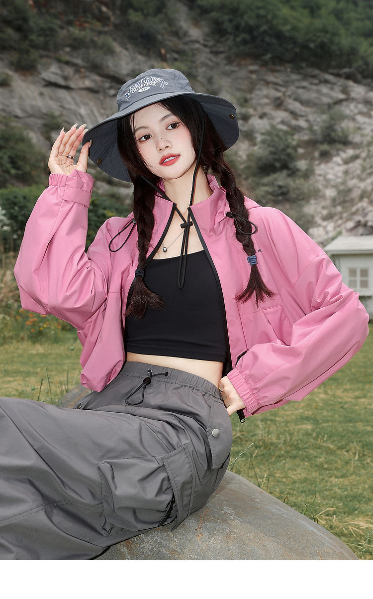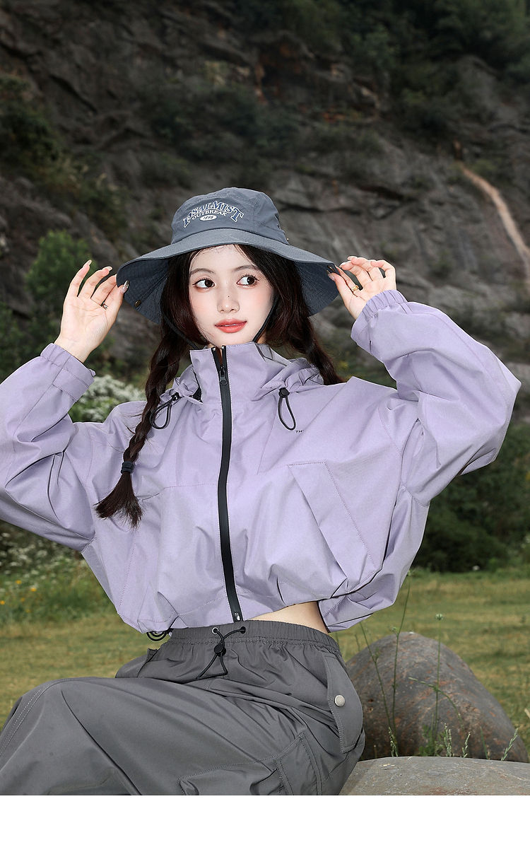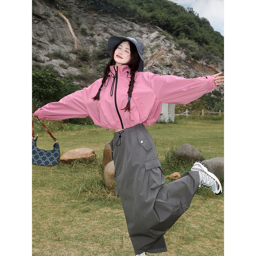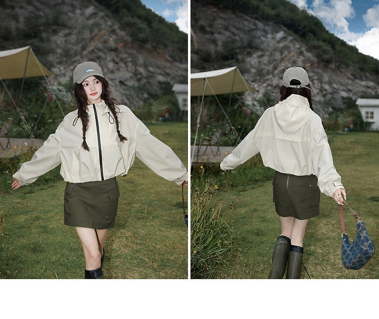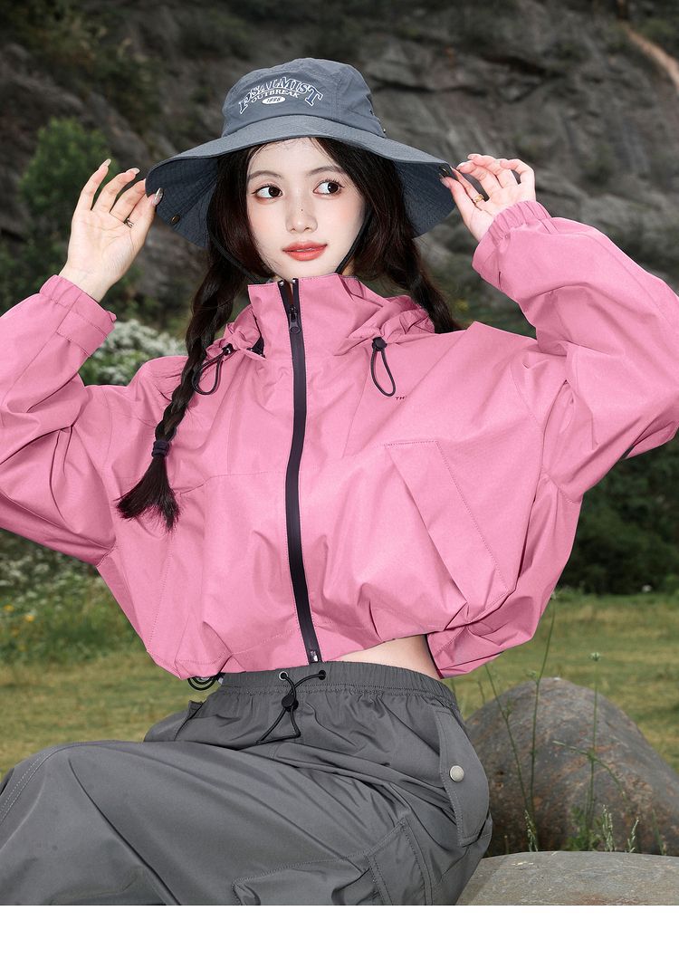 여성을위한 미국 스탠드 업 칼라 후드 작업 재킷 2025 봄, 가을 야외 방풍 짧은 재킷 스포츠 재킷스토어 가기