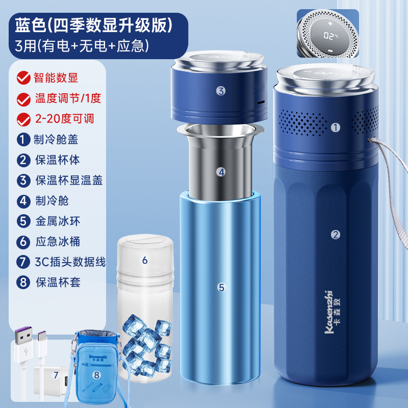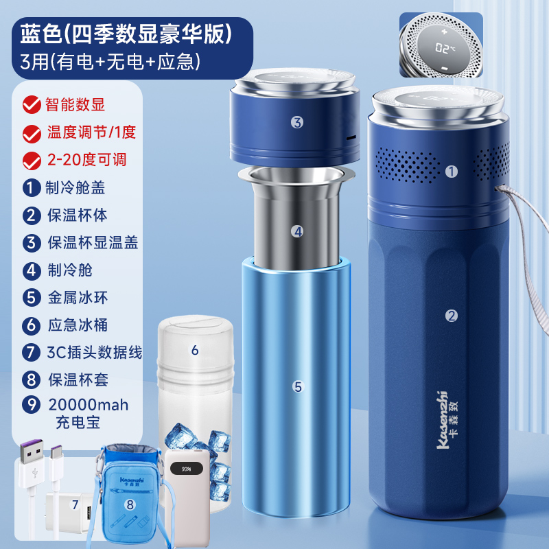 • [사계절용 사파이어 블루 온도 디스플레이 디럭스 에디션 ★ 온도 조절] 냉장실 + 금속 아이스링 + 컵 슬리브 + 보조베터리, 3가지 용도