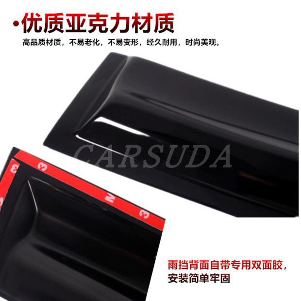 1.如何安装:晴雨挡背面自带专用双面胶,自己动手直接粘贴即可,安装前先对比好车窗弧度,安装部位擦干净,不要沾到油污,安装后不要随意调动安装位置,避免反复拉扯导致胶变形不粘,安装后3天内避免洗车以及高速行驶。(温馨提示:由于冬季受天气影响,双面胶粘性变弱,温度较低地区,建议使用前先用吹风机给胶表面来回游走加温,并控制吹风机温度不宜过高,使胶的化学分子恢复达到最佳粘贴效果)