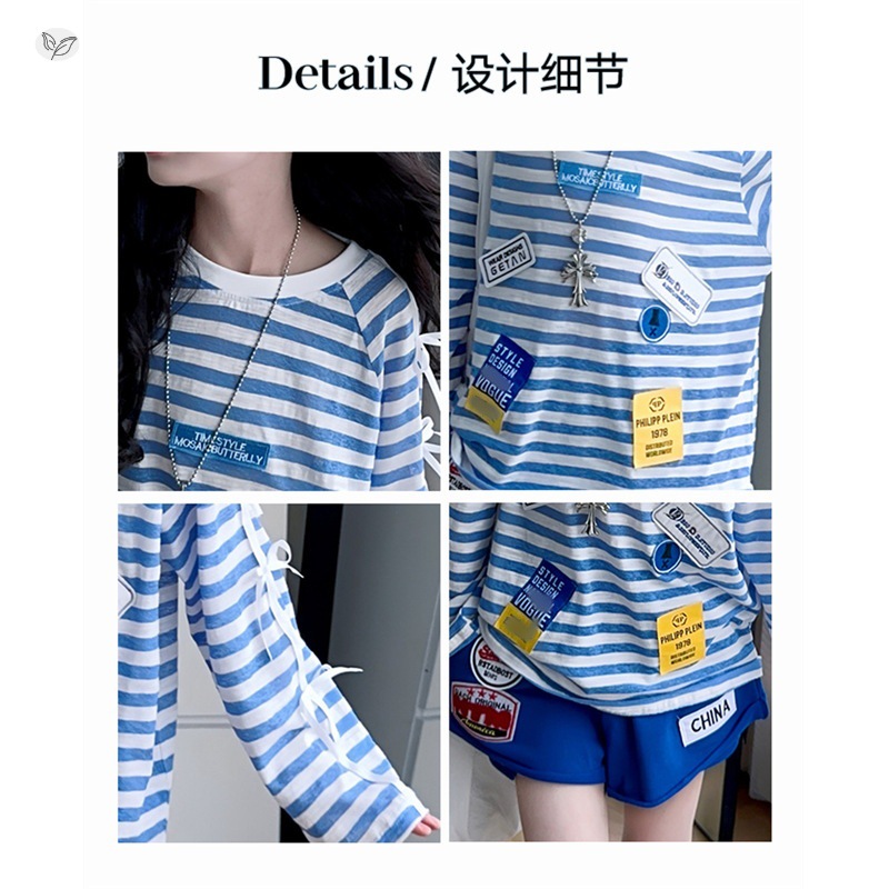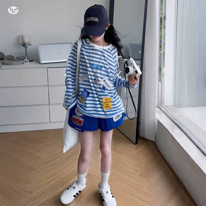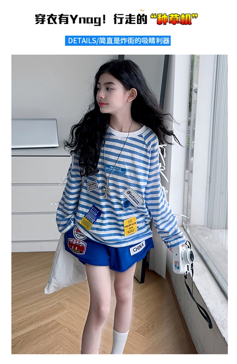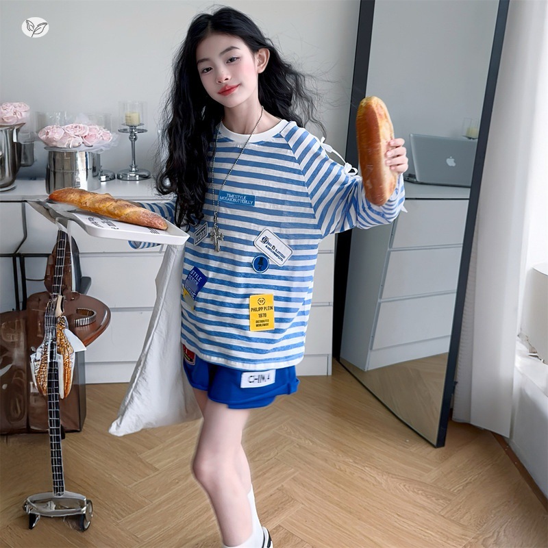 여자 자외선 차단 의류 세트 2025 여름 새로운 스타일 중대형 어린이 얇은 줄무늬 긴팔 티셔츠 반바지 투피스 세트스토어 가기