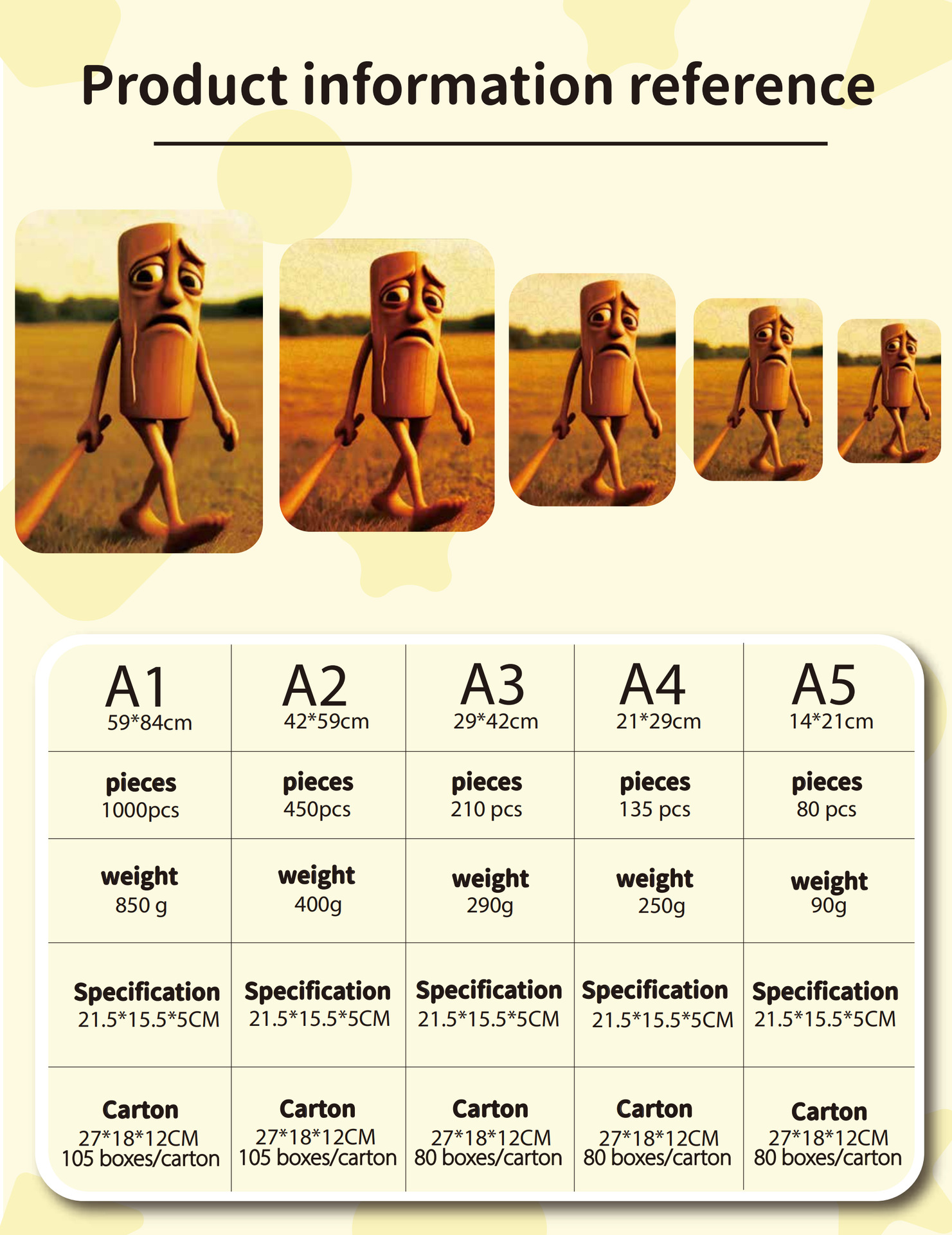 尺寸:S:A5(148*210),M:A4(210*297),L:A3(297*420),300片(380*520)500片(520*380)1000片(750*500),默认最小尺寸S,需要大号请联系客服改价!