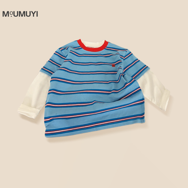 한국 스타일 소년 가짜 투피스 스트라이프 티셔츠 2025 새로운 가을 순수 코튼 긴팔 탑 중소형 어린이를위한 느슨한 베이비 셔츠