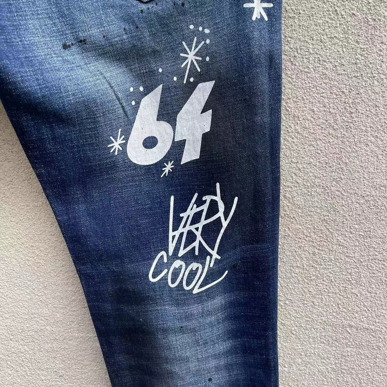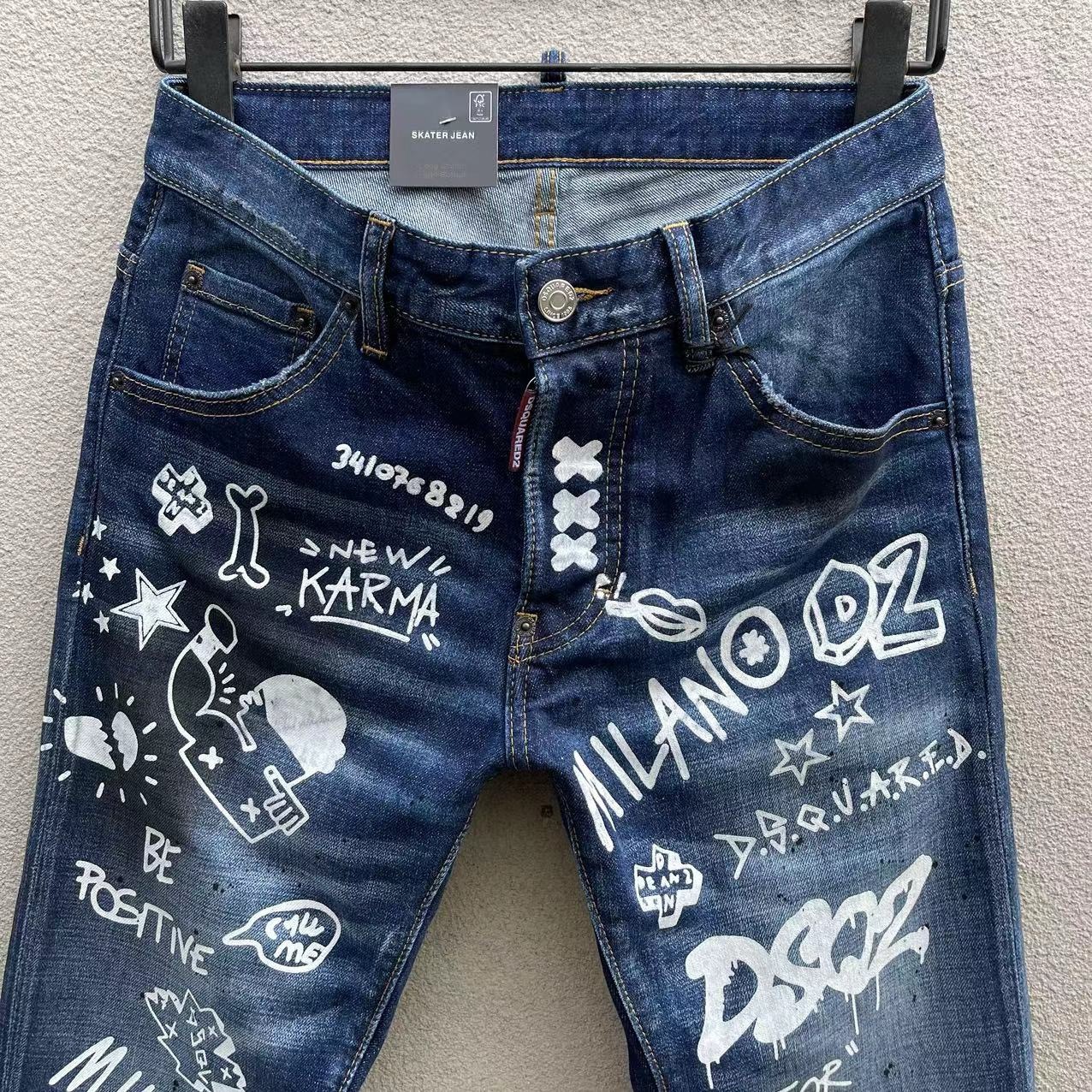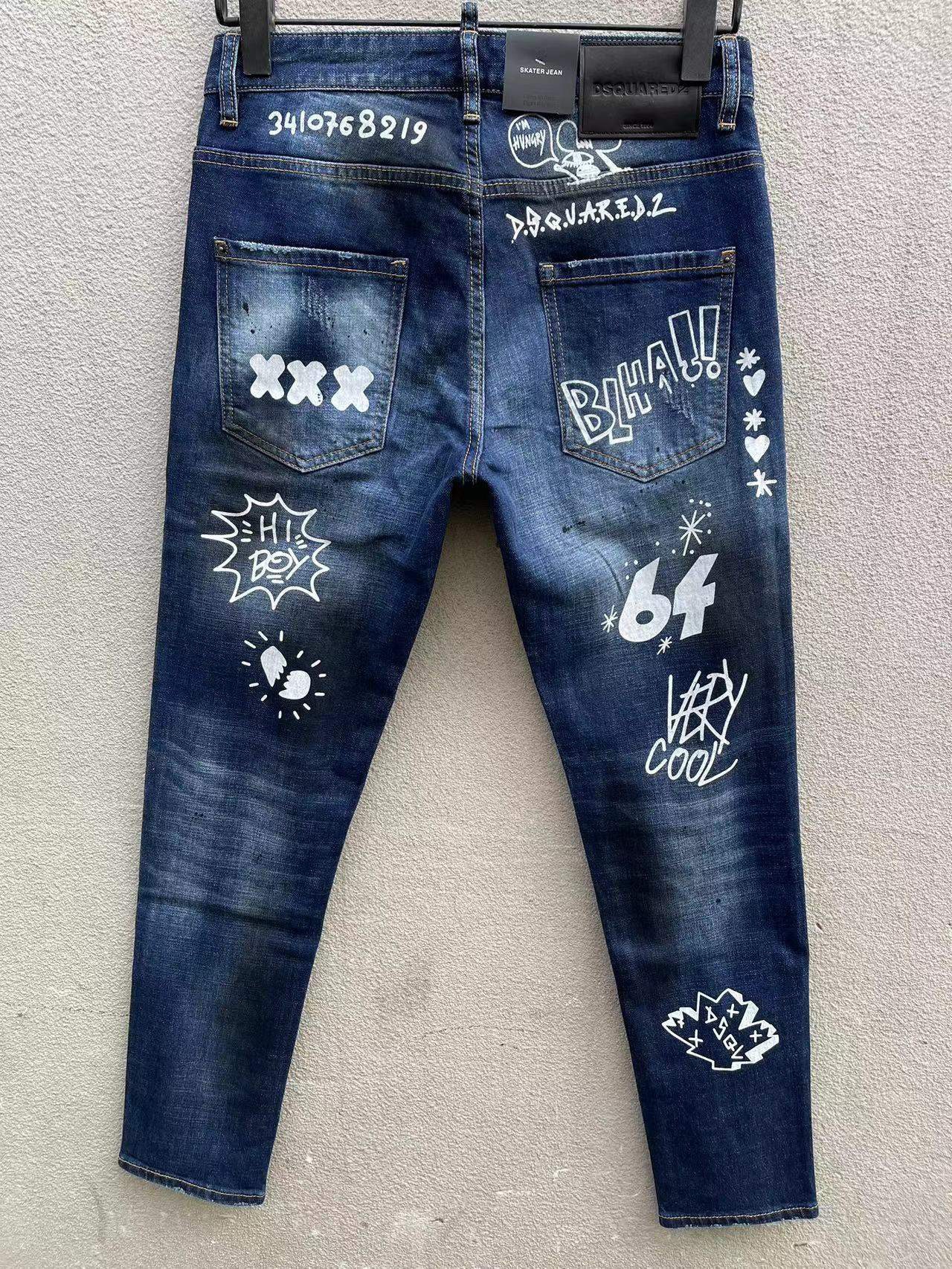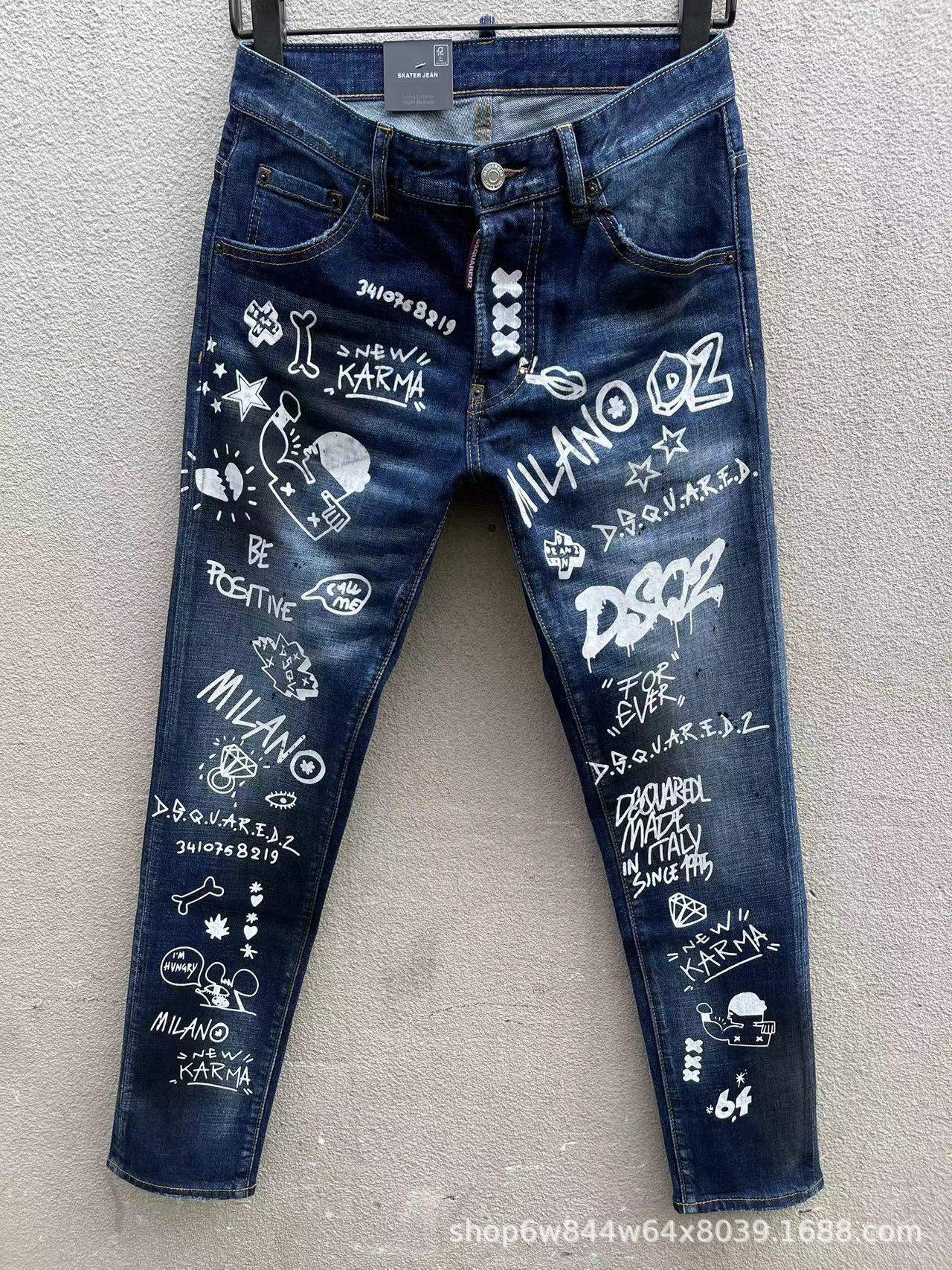 25 신상 데님 바지 남성 d2 슬림핏 캐주얼 워싱 풀 스트립 그래피티 프린트 캐주얼 바지 마이크로 엘라스틱 트렌디 C073스토어 가기