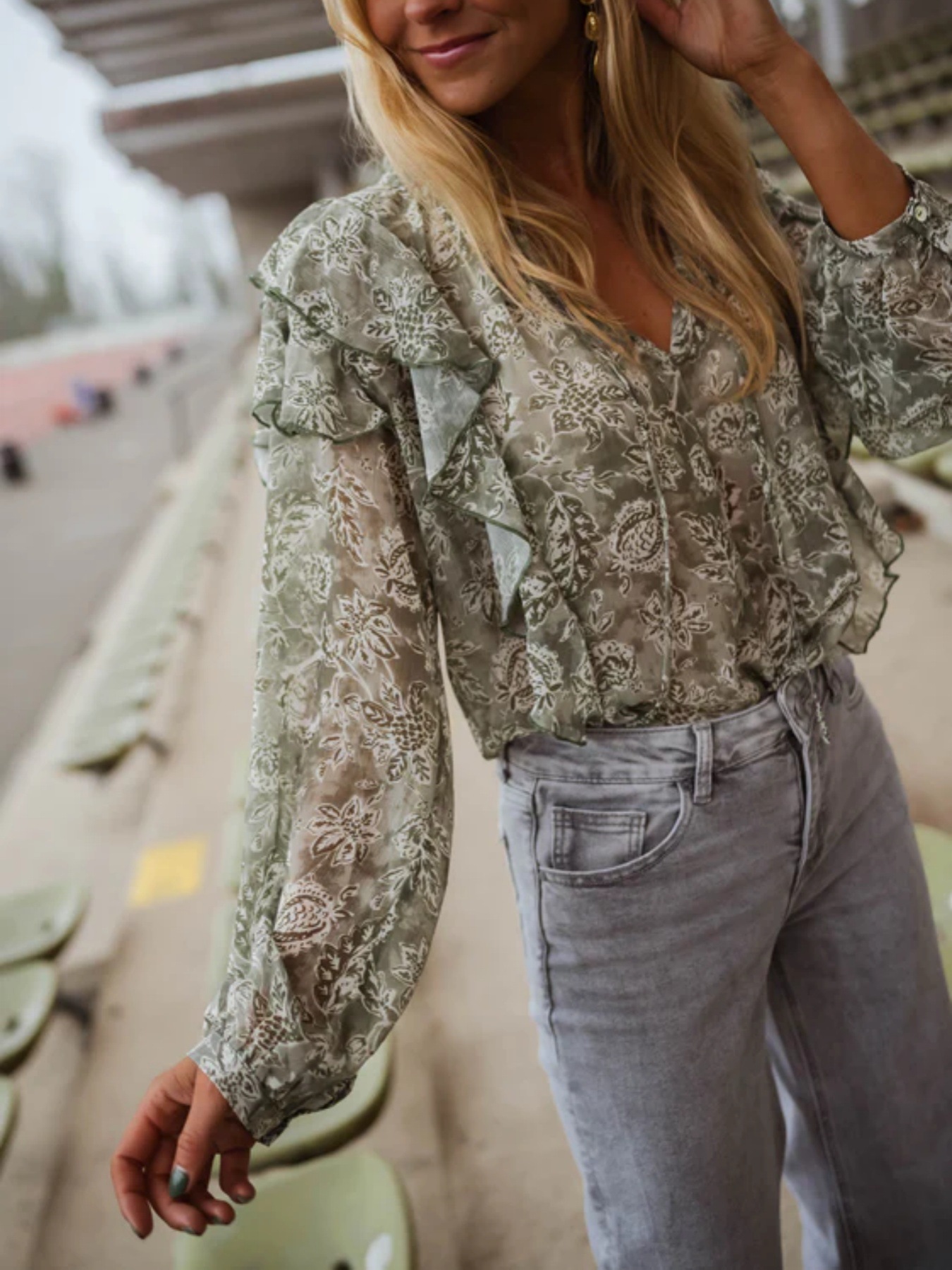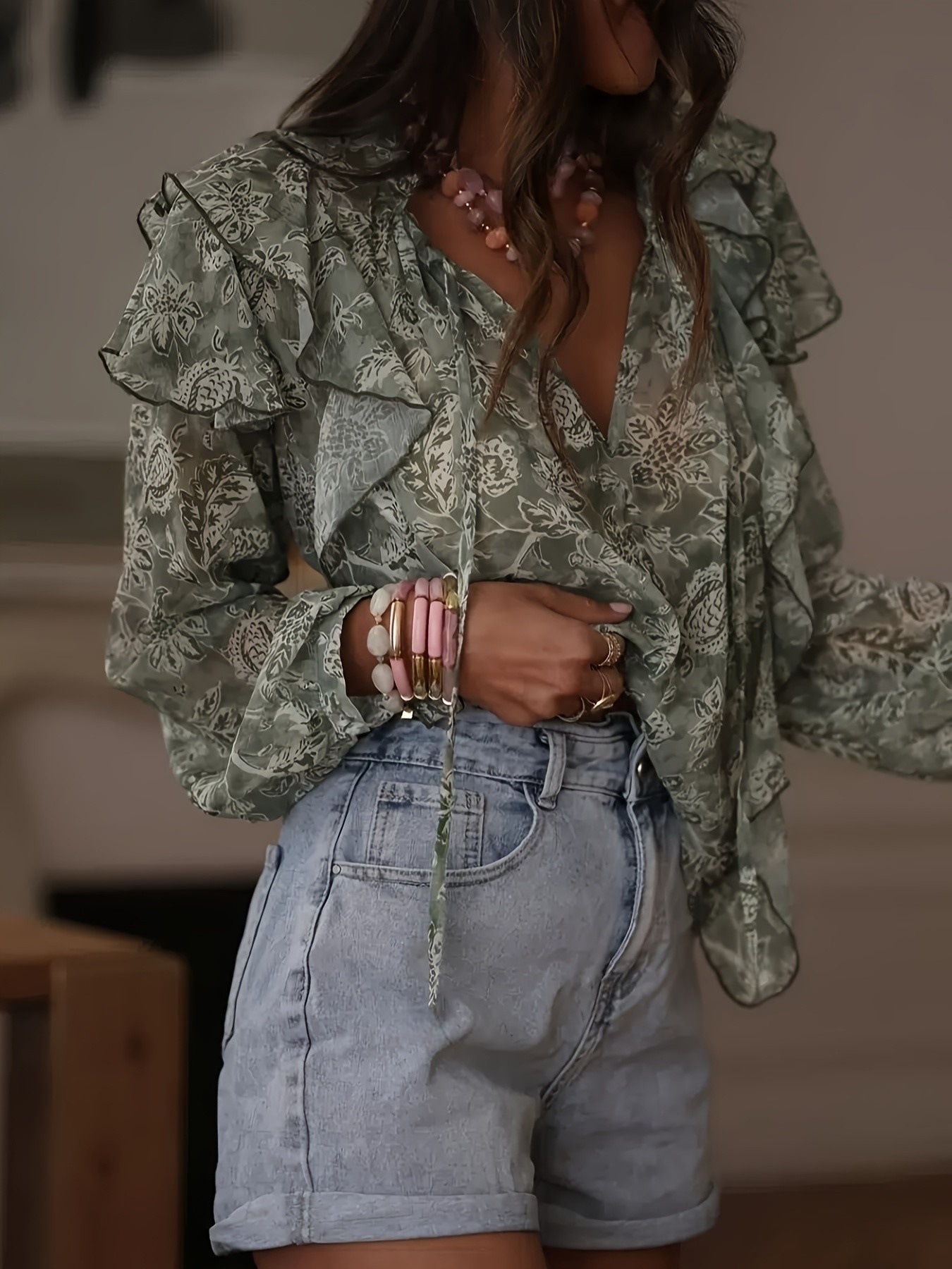 대외 무역 2025 봄, 가을 새로운 다목적 프린트 풀오버 라운드 넥 레이스 업 긴팔 레이어드 장식 셔츠 쉬폰 셔츠