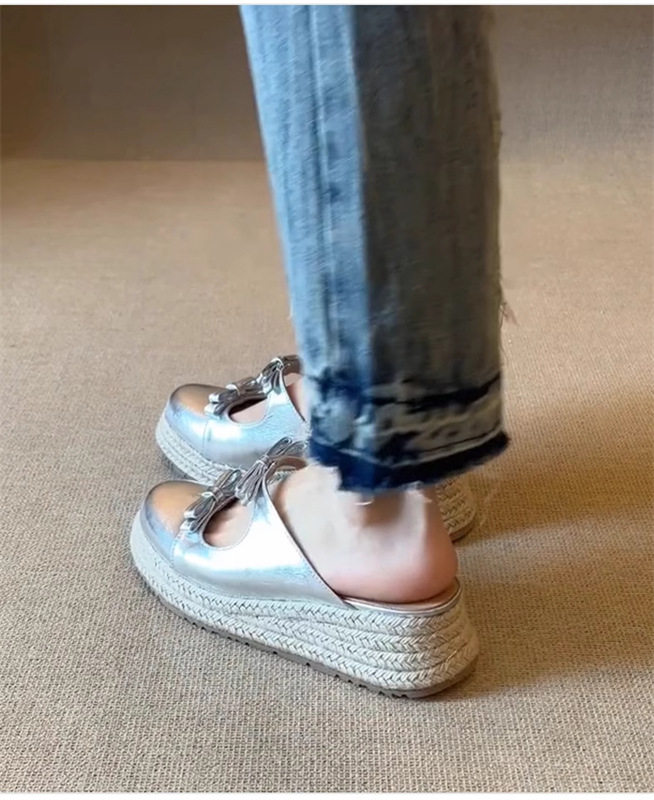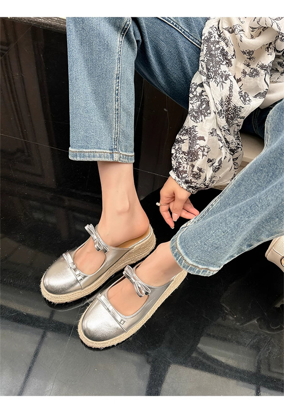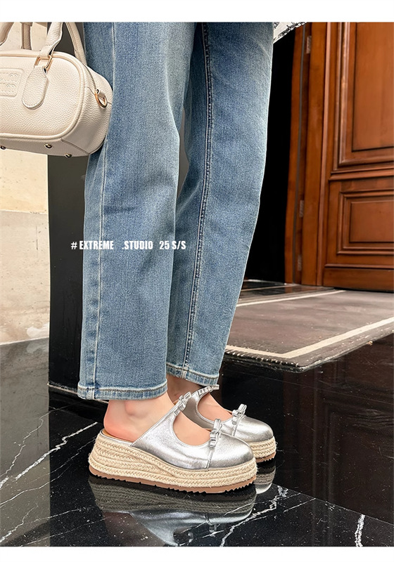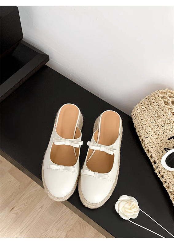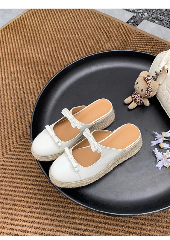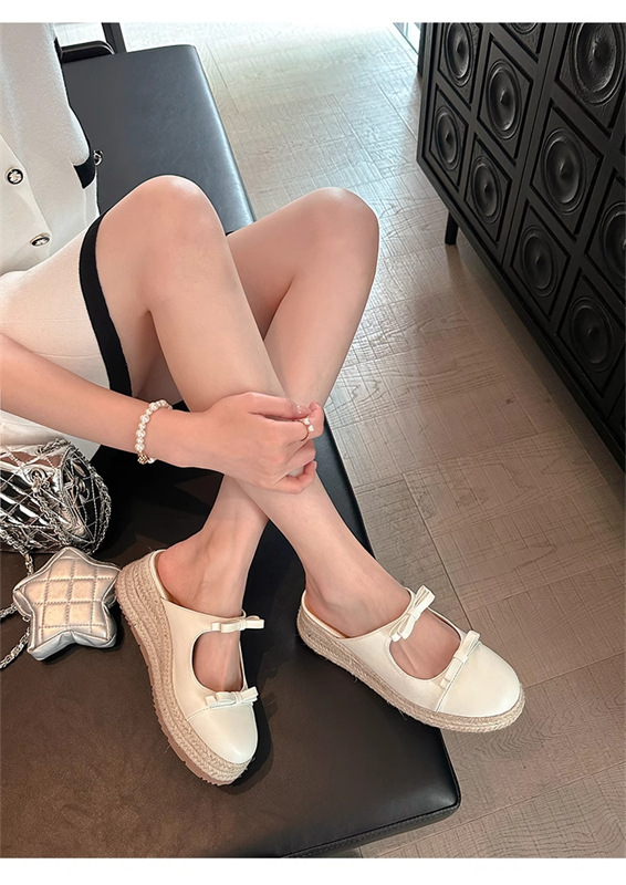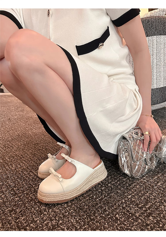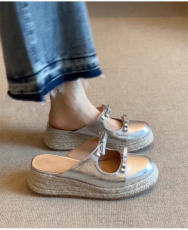 여성용 양가죽 리본 두꺼운 밑창 키높이 발가락 반슬리퍼, 여름 아우터, 캐주얼하고 활용도가 높은 펌프스 슬립온 슈즈스토어 가기