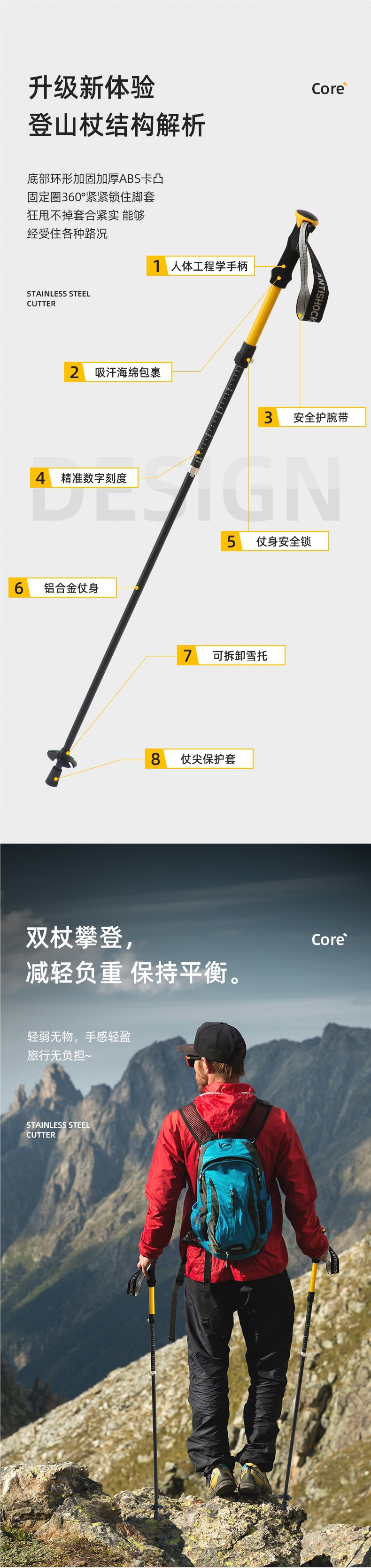 • 다음 2개의 막대/하이킹 및 등반용 막대 2개는 균형을 유지하는 데 더 도움이 됩니다.