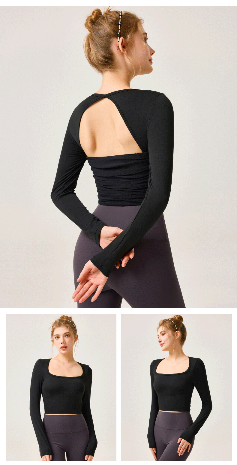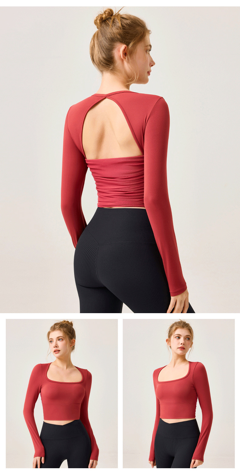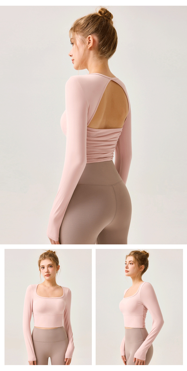 새로운 스포츠 긴팔 여성용 메쉬 속이 비치는 등 부분이 아름다운 탈부착 가능한 실내 요가복 전문 필라테스 피트니스 탑