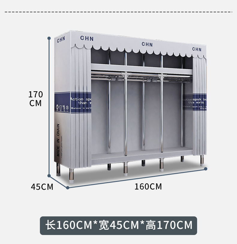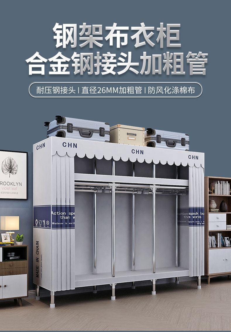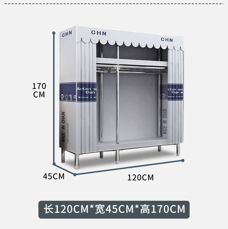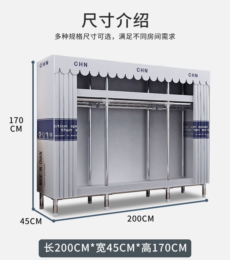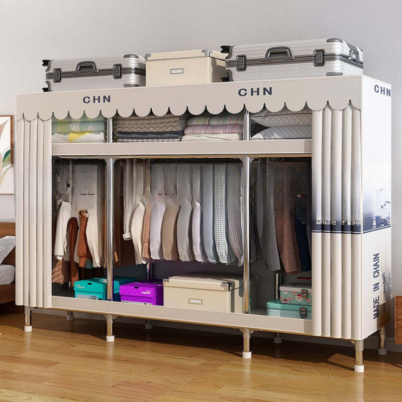 간단한 옷장, 튼튼하고 내구성이 뛰어난 가정용 침실 천 옷장, 전체 강철 프레임, 두껍고 두꺼운 조립 임대 주택 걸이 옷장