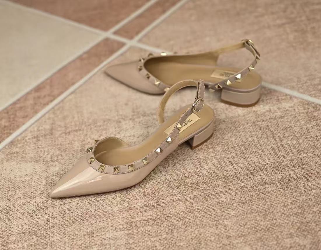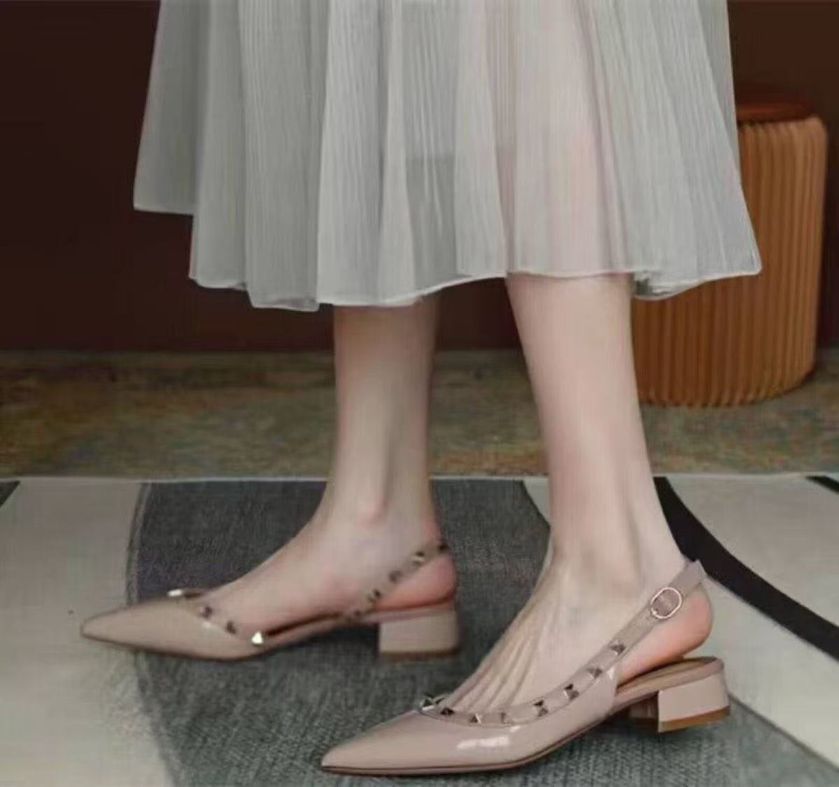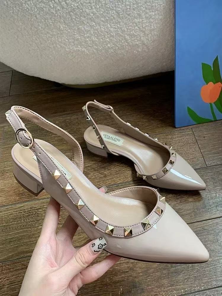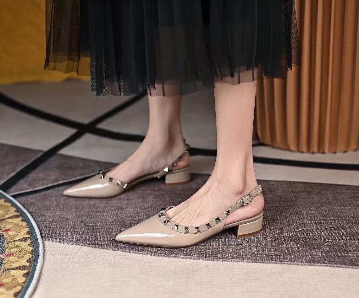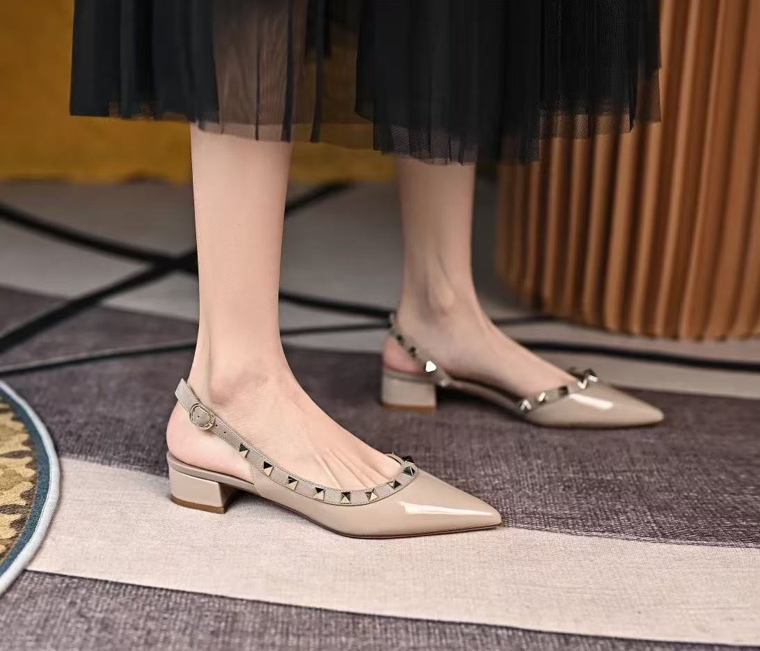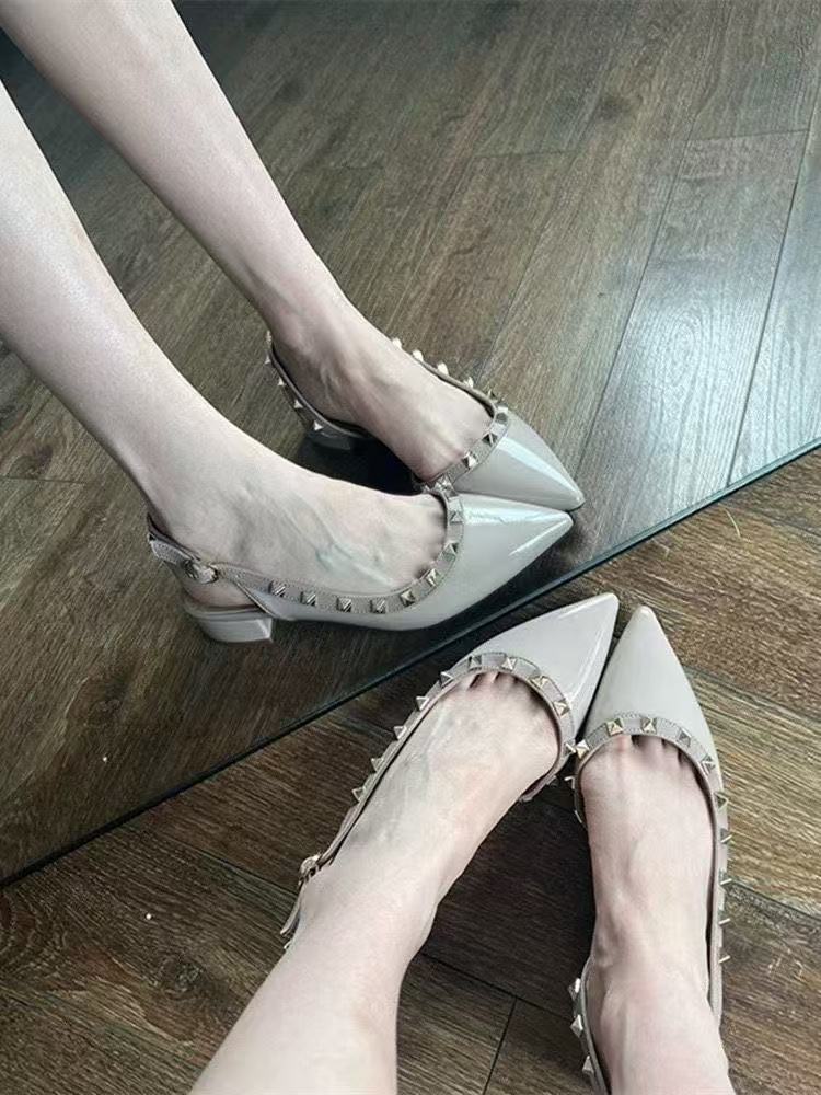 가을과 여름 여성용 프렌치 리벳 슈즈, 포인티드 토 플랫 슈즈, 부드러운 밑창 누드 컬러 여성용 로우힐 슈즈, 두꺼운 힐, 페이턴트 가죽스토어 가기