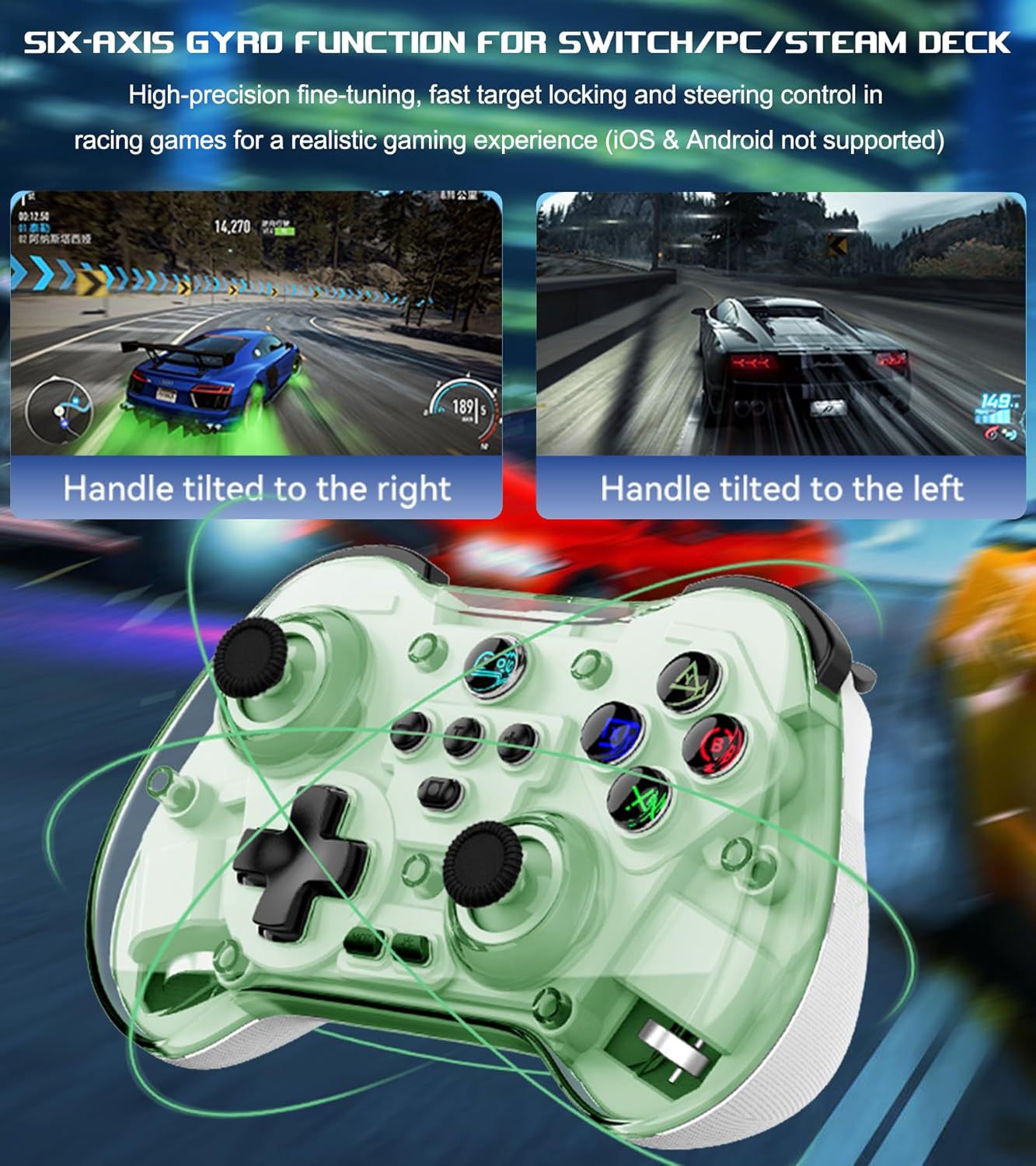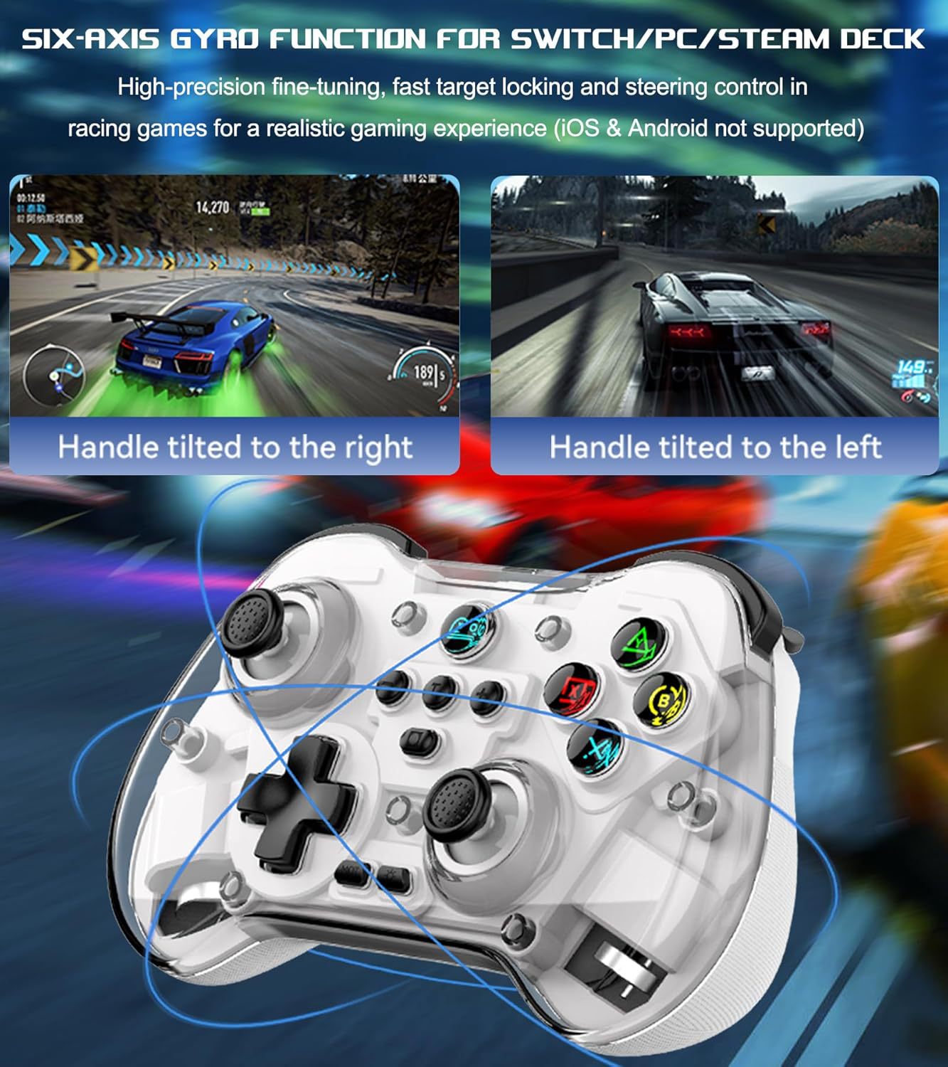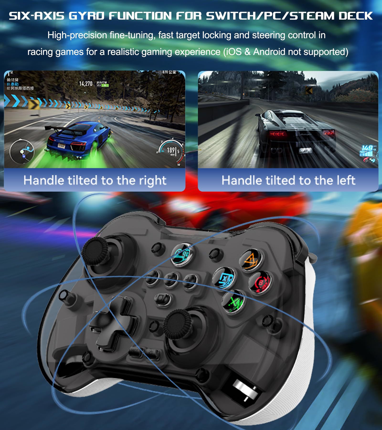 Multi-Function Gamepad: This Android game controller has other thoughtful and excellent functions: turbo function, macro programming function, ABXY key value interchange function, axis calibration function, vibration function, 6-axis gyroscope function, make it easy to win in the gaming world! [Note: iOS and Android devices do not support vibration and 6-axis gyroscope functions]Press the Y+A+Home' keys to switch the ABXY key value from Xbox mode settings to Switch mode settings