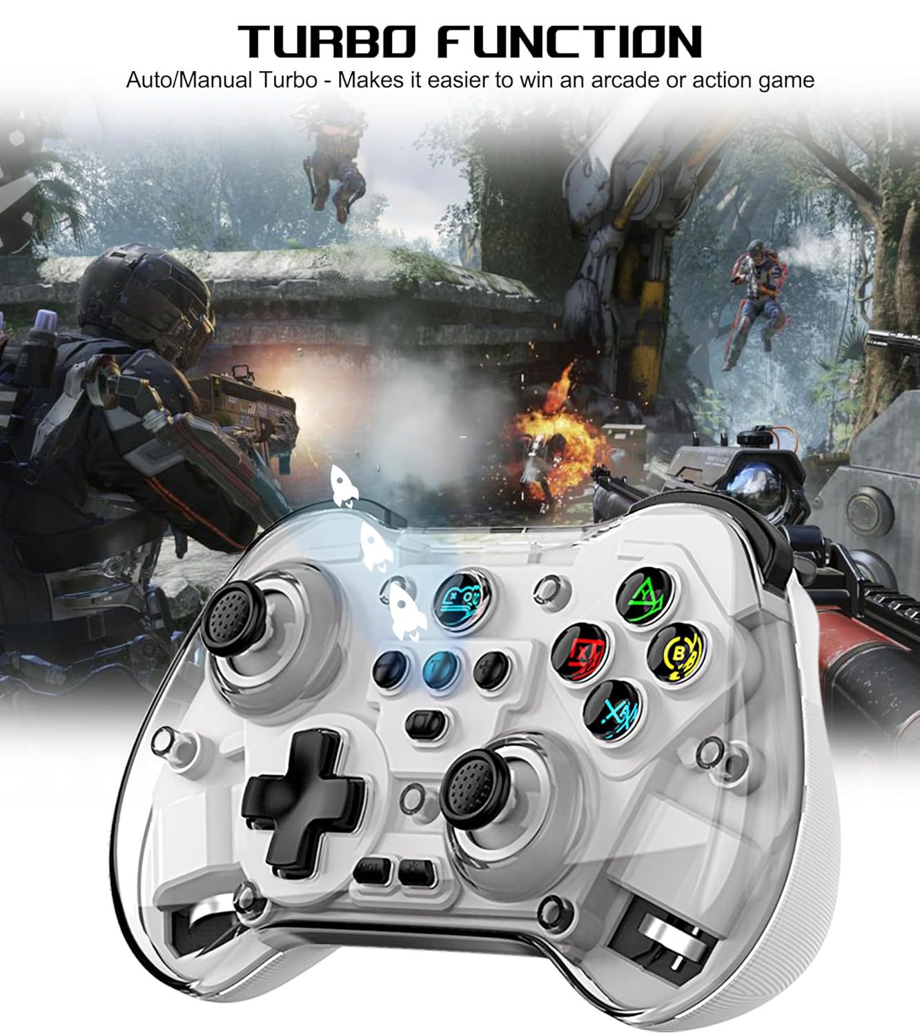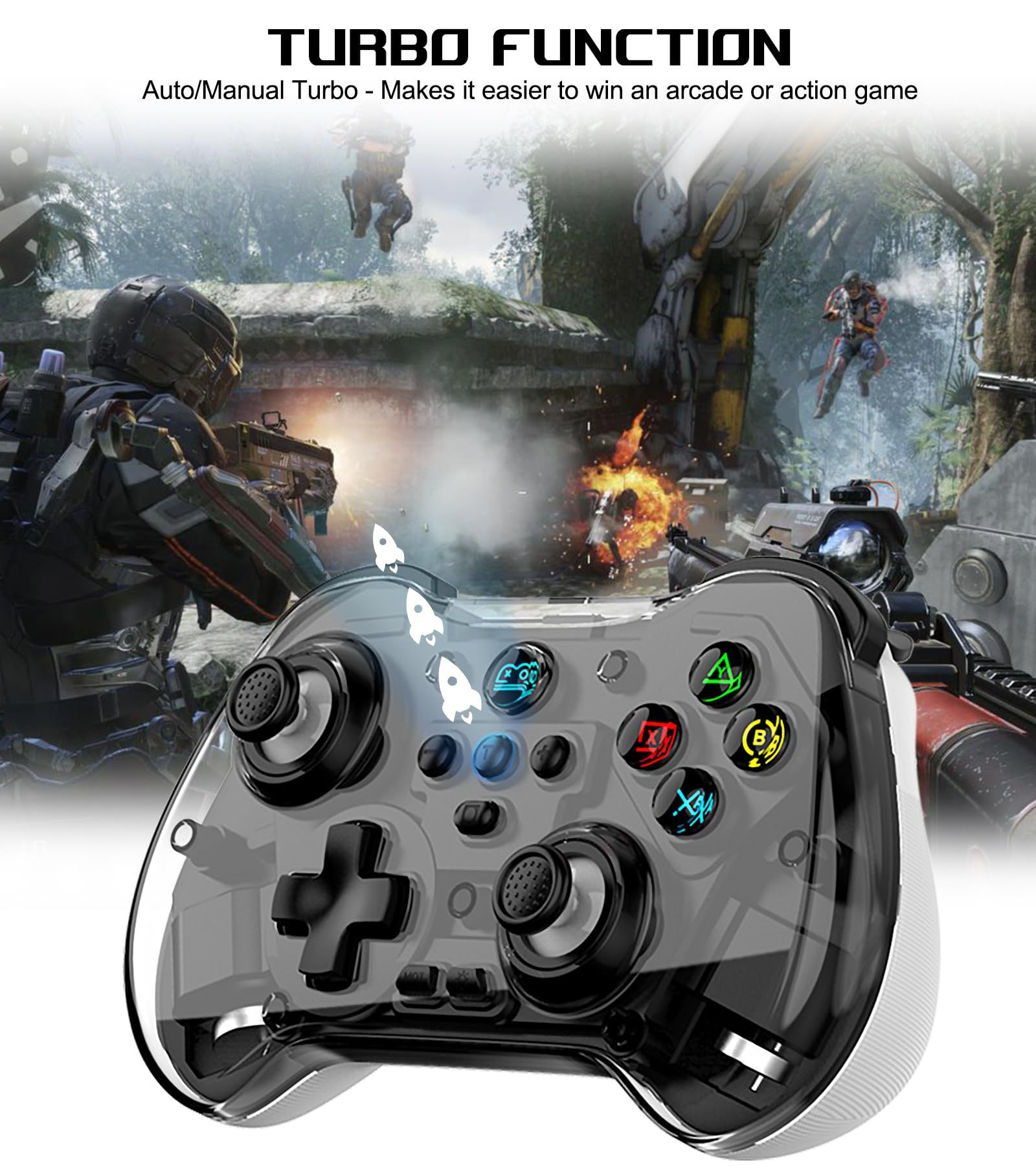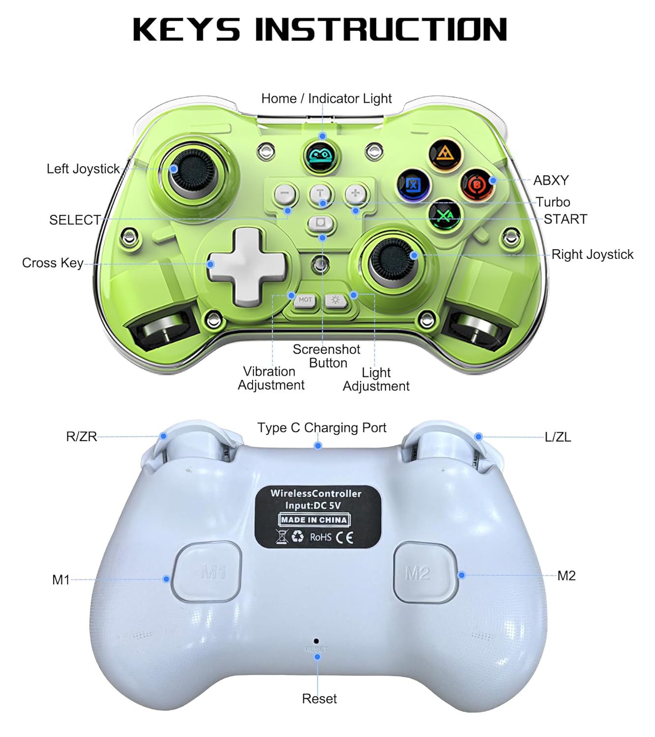 Multi-Function Gamepad: This Android game controller has other thoughtful and excellent functions: turbo function, macro programming function, ABXY key value interchange function, axis calibration function, vibration function, 6-axis gyroscope function, make it easy to win in the gaming world! [Note: iOS and Android devices do not support vibration and 6-axis gyroscope functions]Press the Y+A+Home' keys to switch the ABXY key value from Xbox mode settings to Switch mode settings