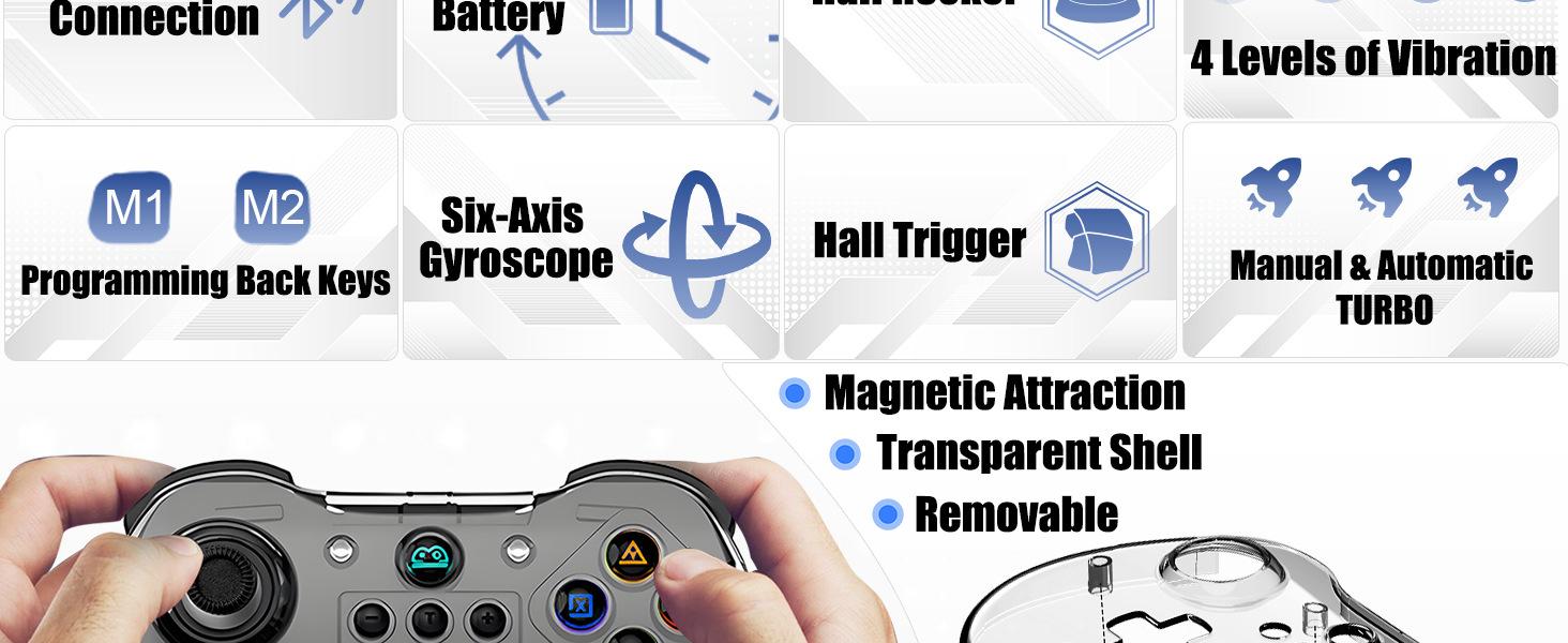Hall Effect Joysticks & Hall Effect Triggers: This iPhone controller hall effect sensing sticks deliver 360°seamless pinpoint control, provide the precision and durability that mobile gamers demand. And the Hall Effect analog triggers offer unparalleled smoothness and responsiveness, giving you a competitive advantage in any game