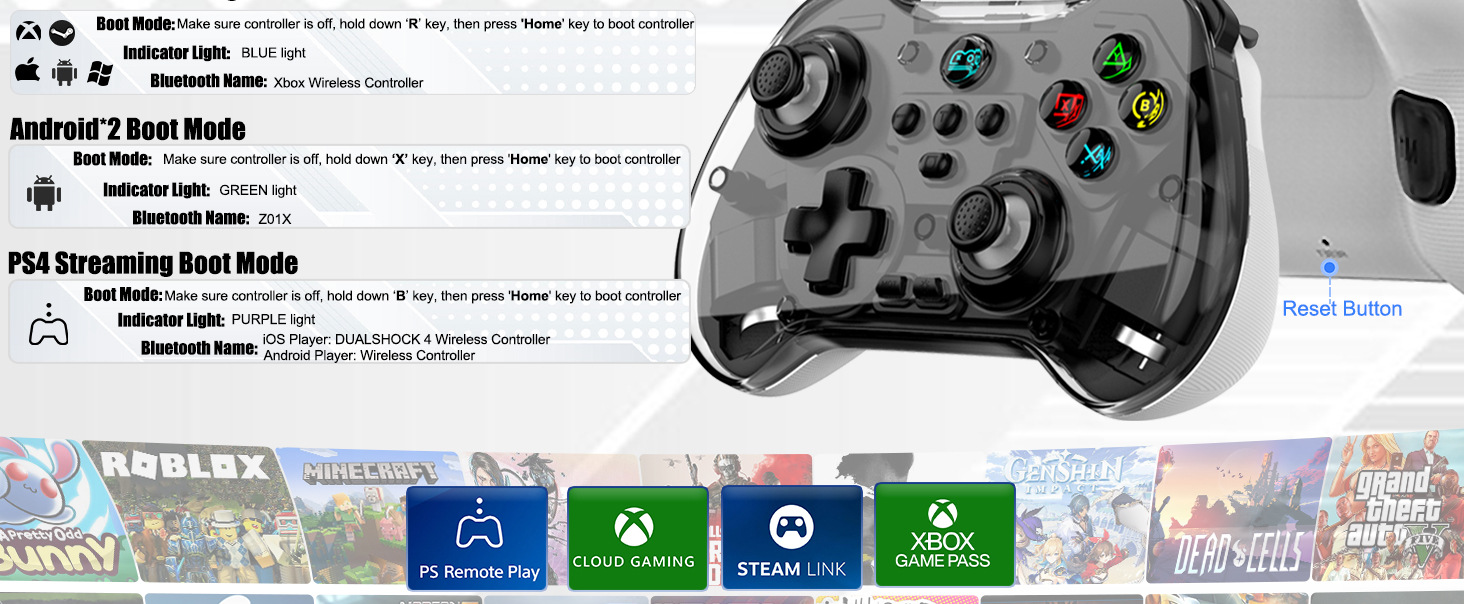 Tips for Mobile Gaming Controller: When the wireless phone controller encounters abnormal situations such as inability to connect/charge, joystick offset, you can try resetting it: poke the 'RESET' hole on the back of controller with a needle, and then restart the controller to solve most non quality problems