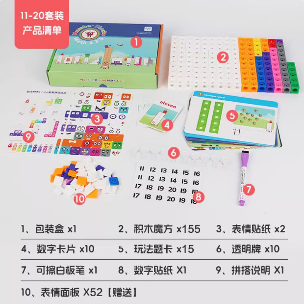 • 숫자 블록 1-10 세트 + 11-20 세트 (맞춤형 패널 111개 포함)