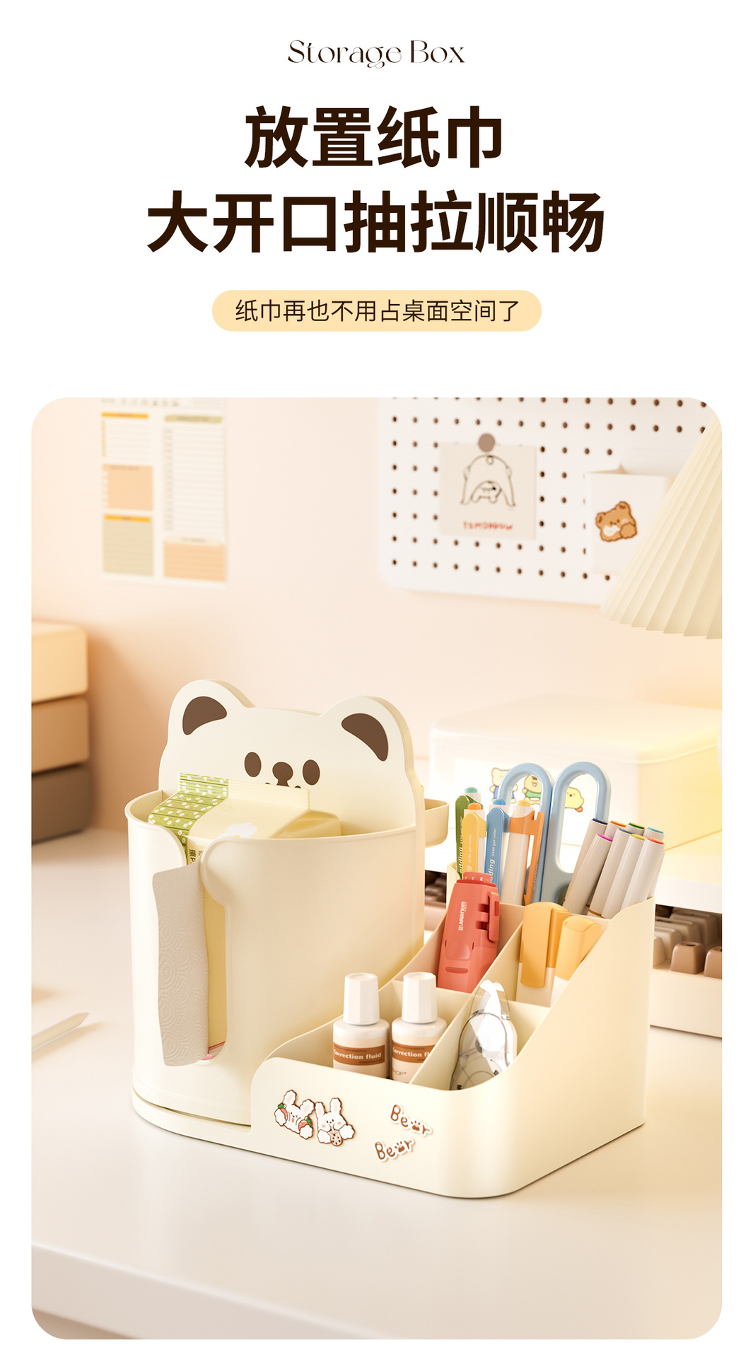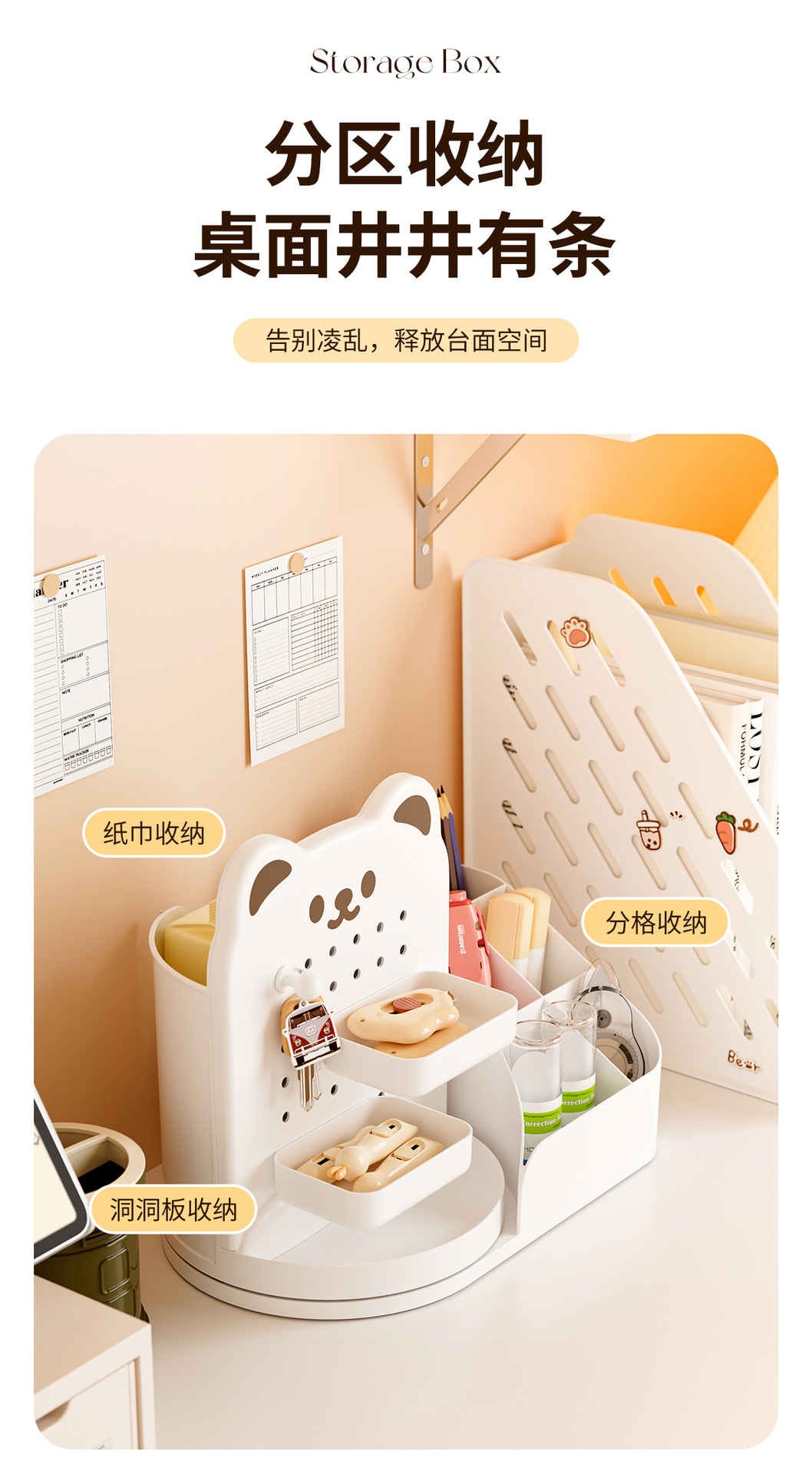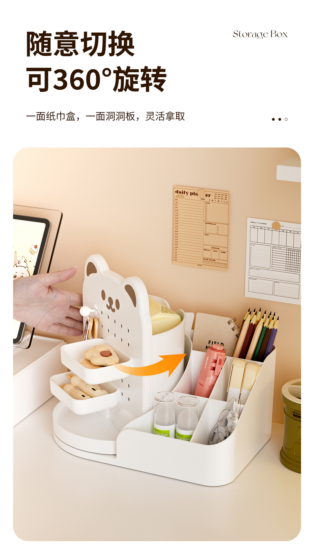 회전 만화 곰 구멍 보드 데스크탑 스토리지 박스 학생 사무실 다기능 책상 문구 정리 상자스토어 가기