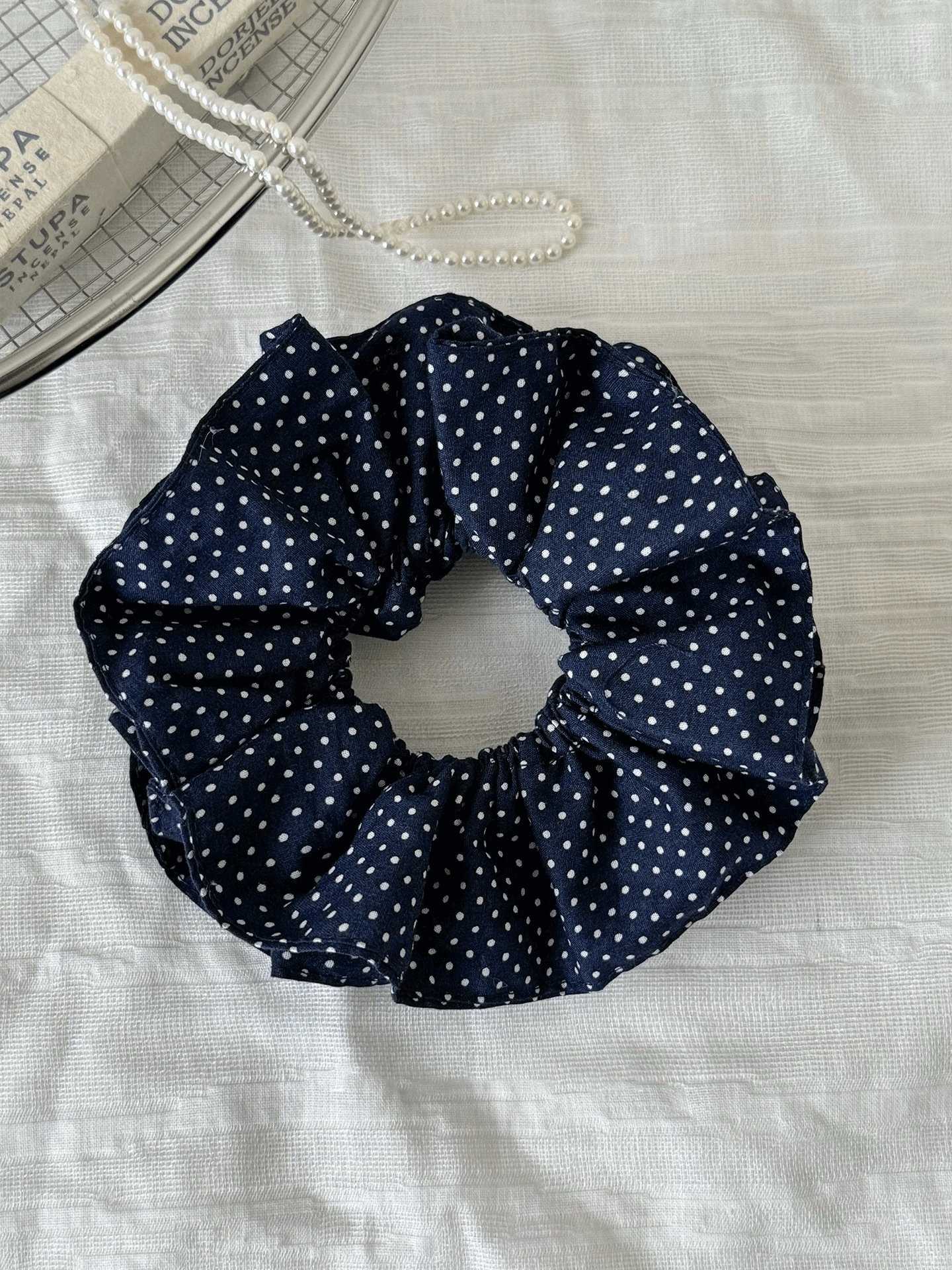 한국 복고풍 네이비 블루 더블 레이어 폴카 도트 헤어 밴드 소녀 대학 스타일 화이트 볼 헤드 타이 포니 테일 꽃 고무 밴드
