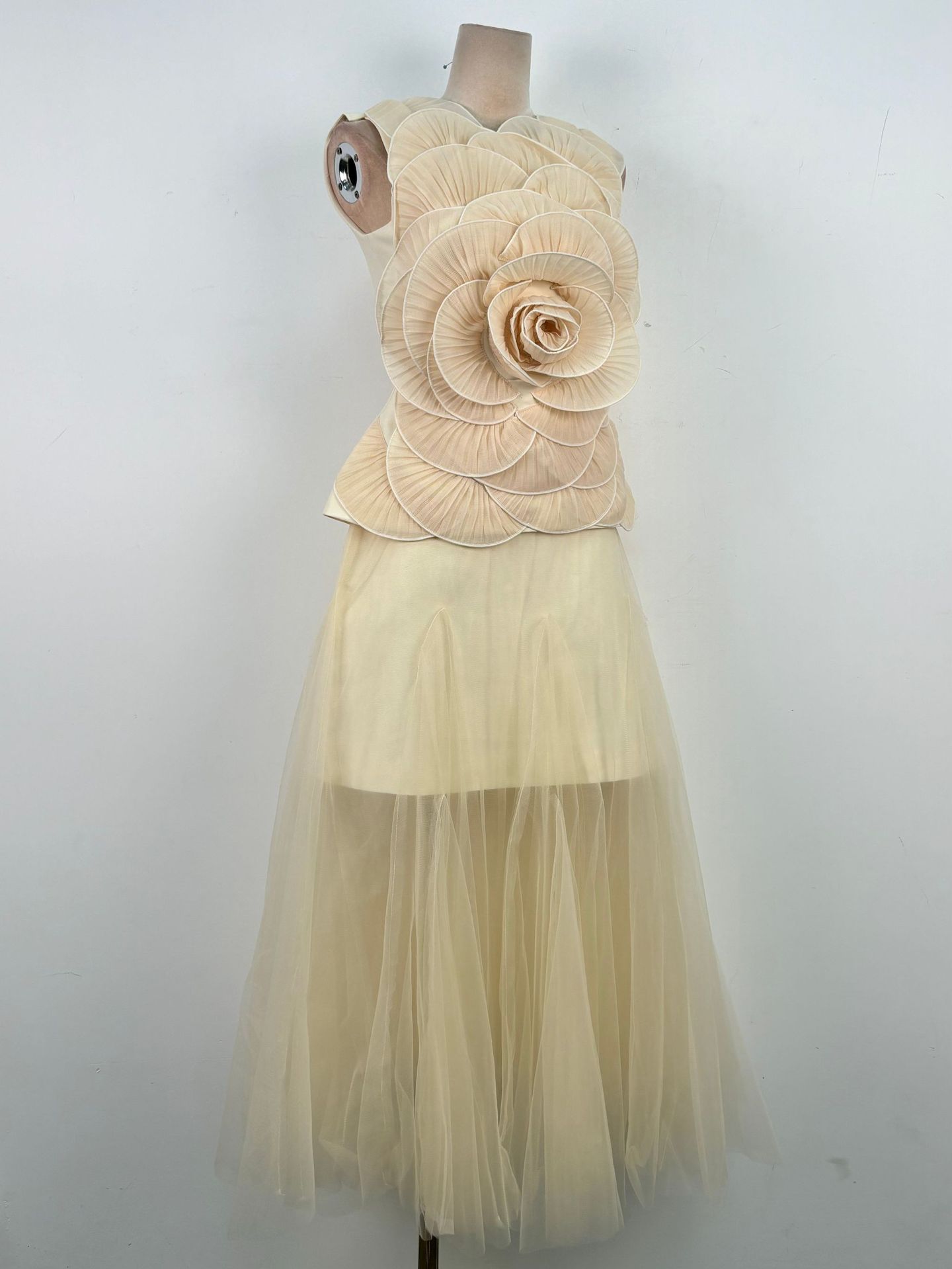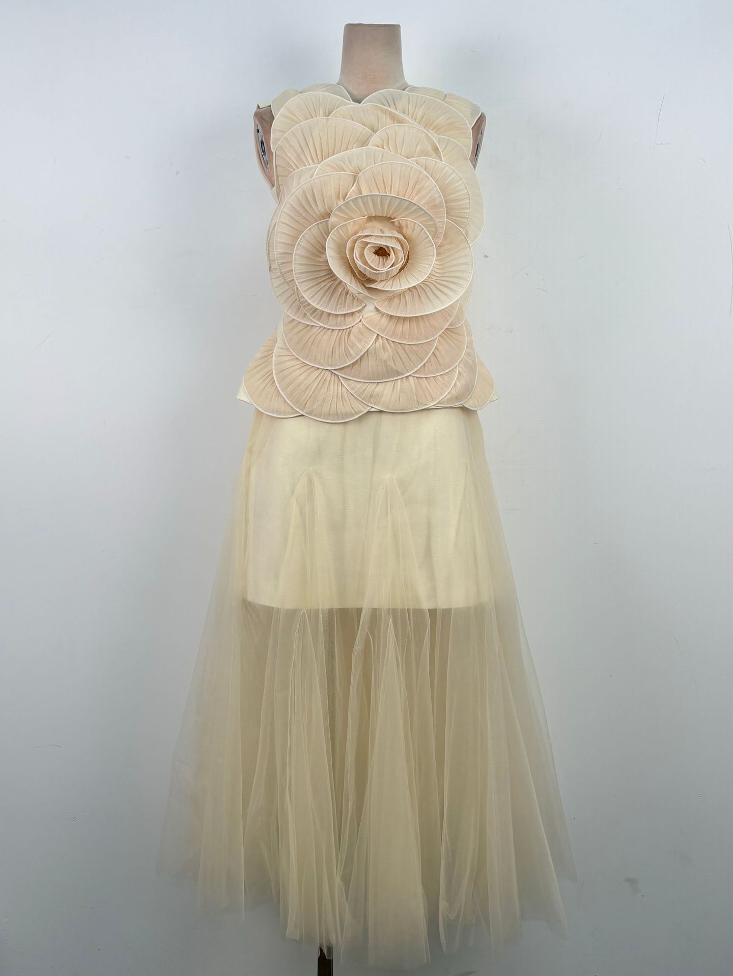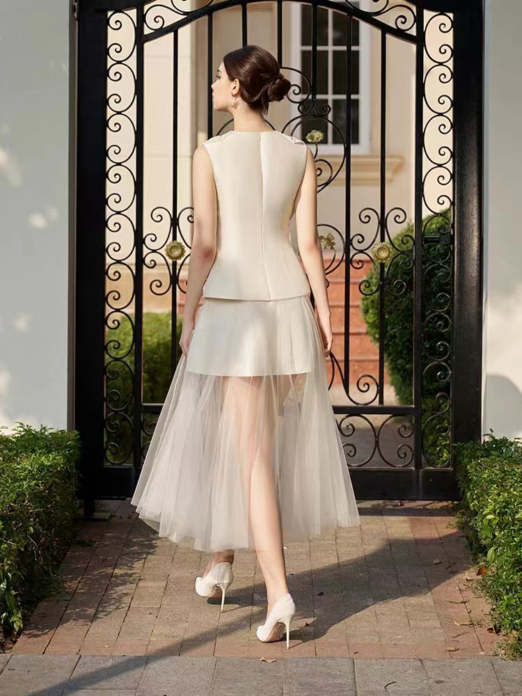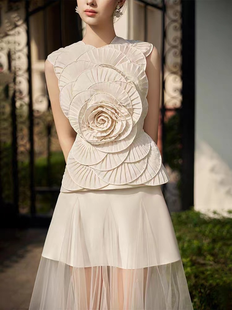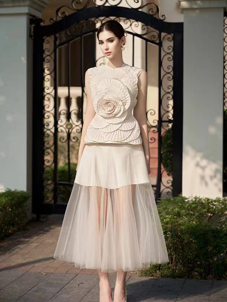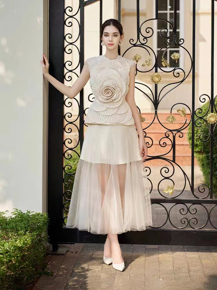 스팟 스타일 여성스러운 정장 스커트 베트남 니치 디자인 입체 꽃무늬 민소매 탑 메쉬 롱 스커트 50015