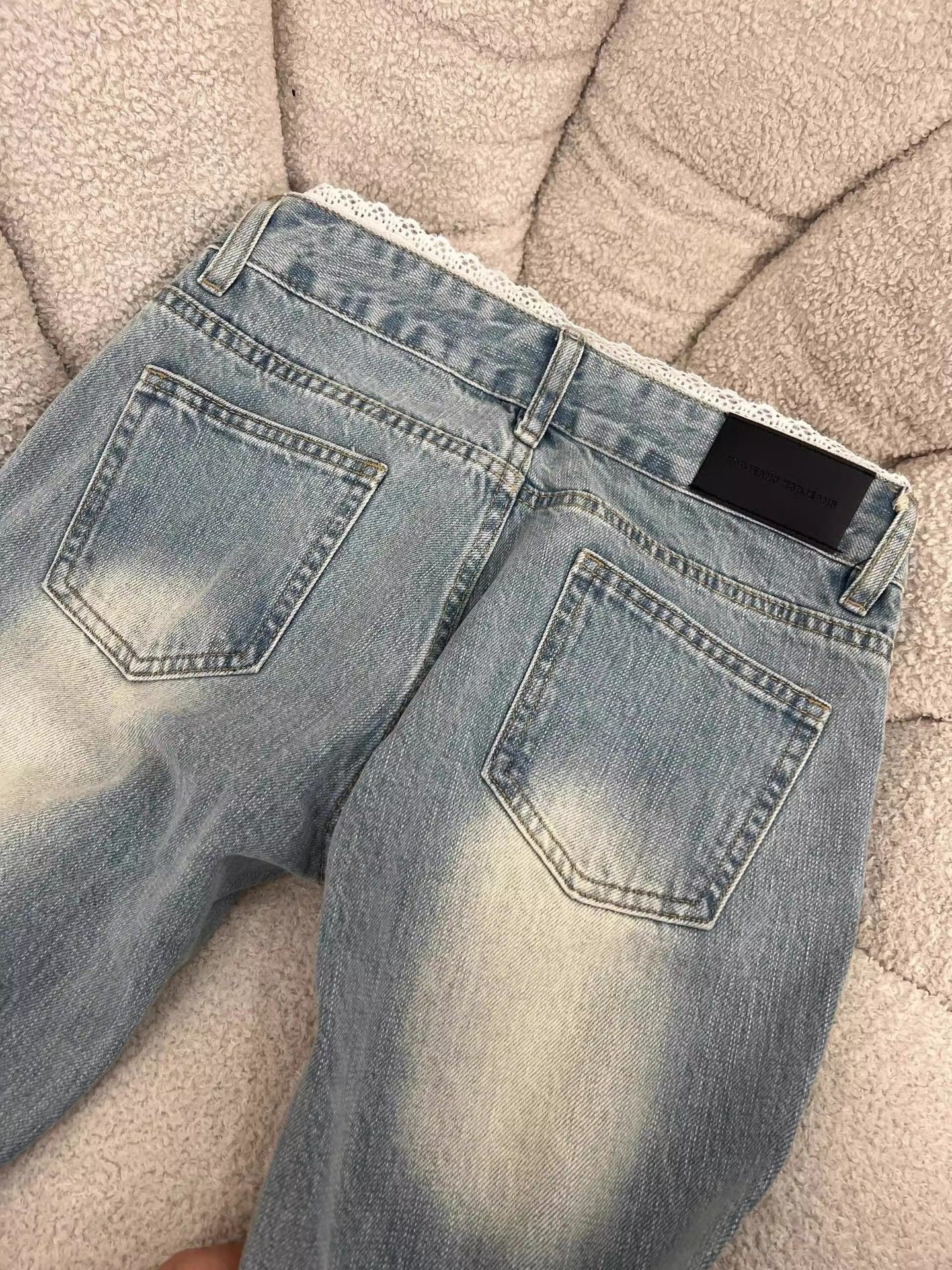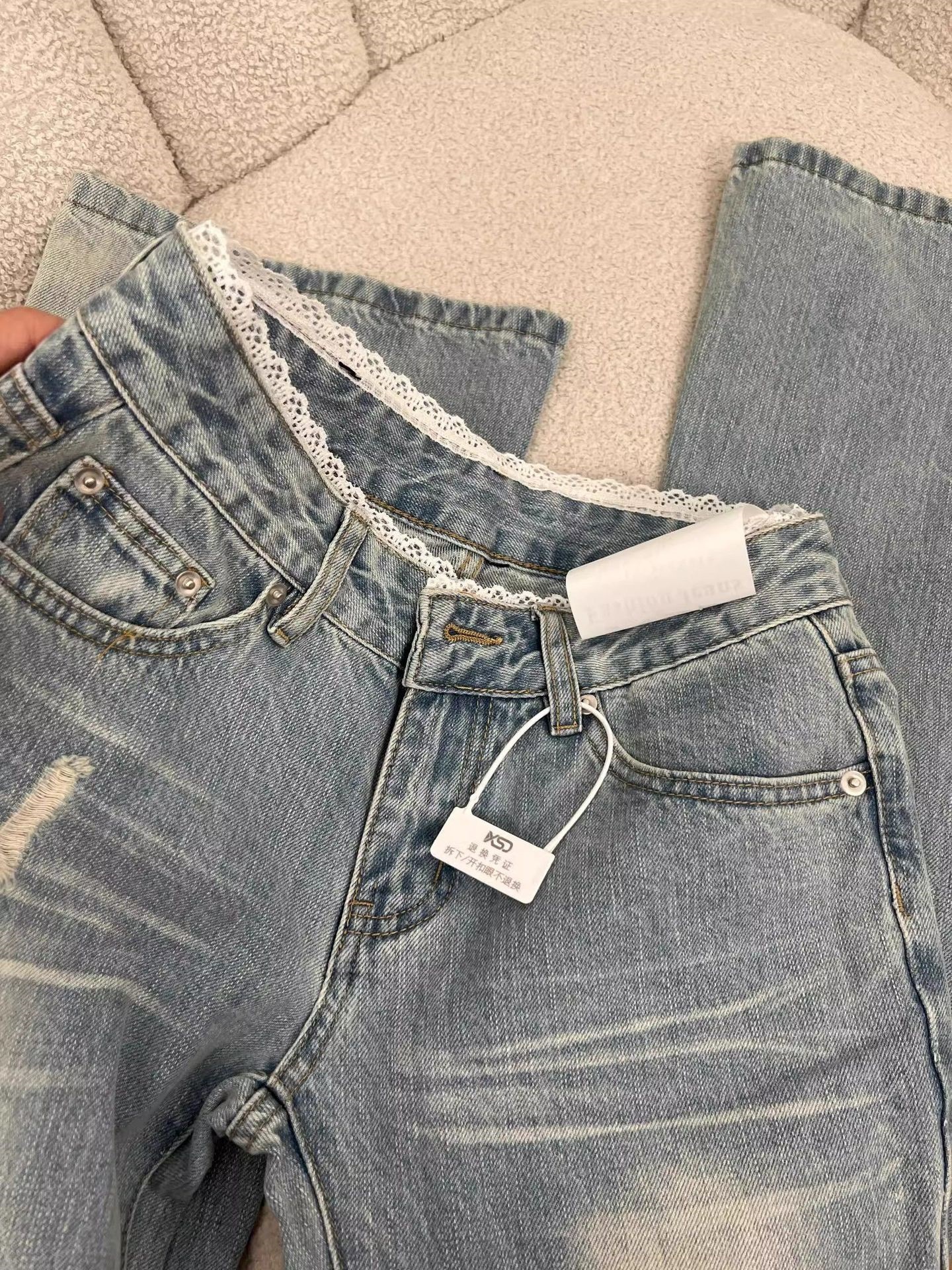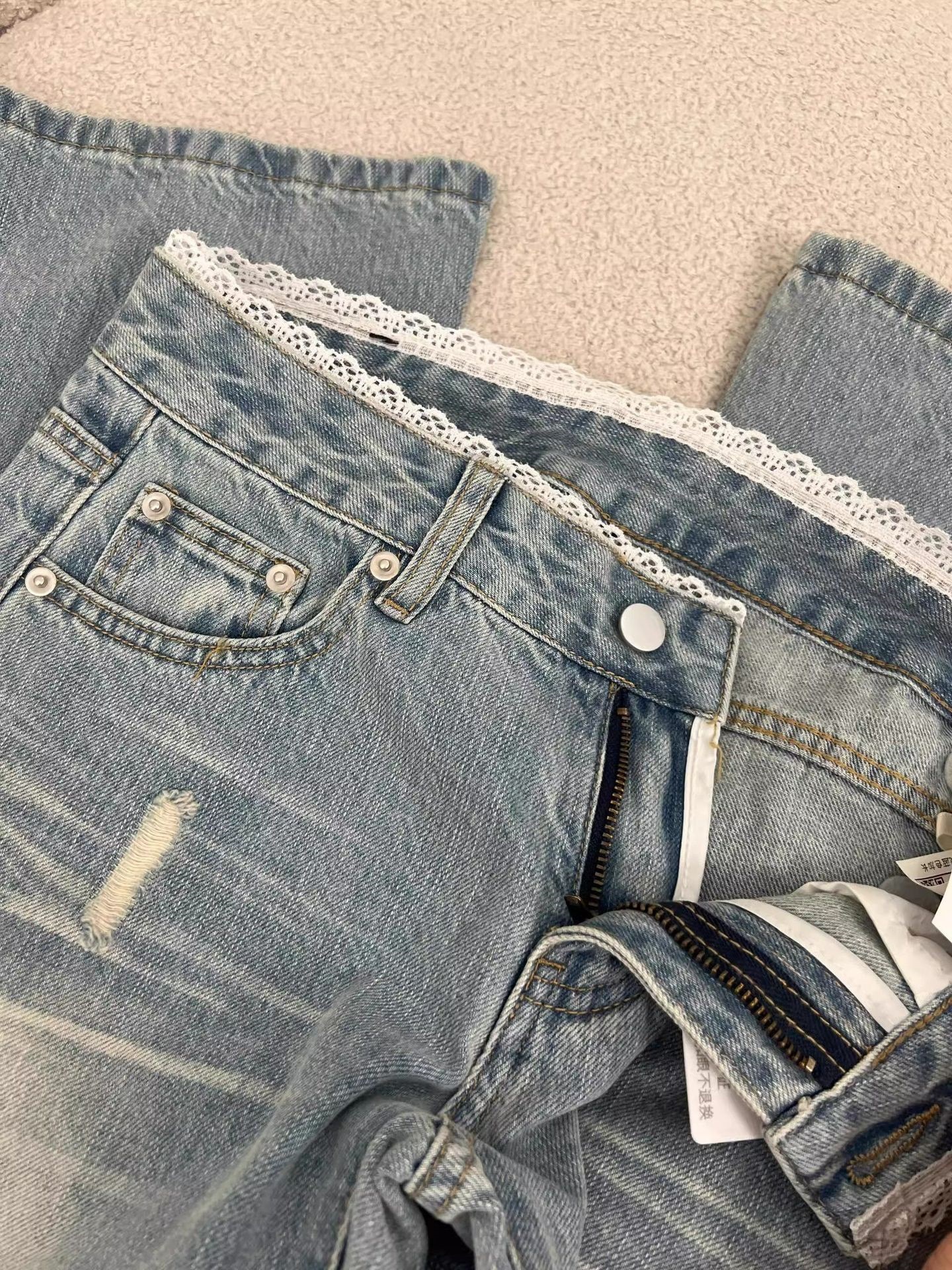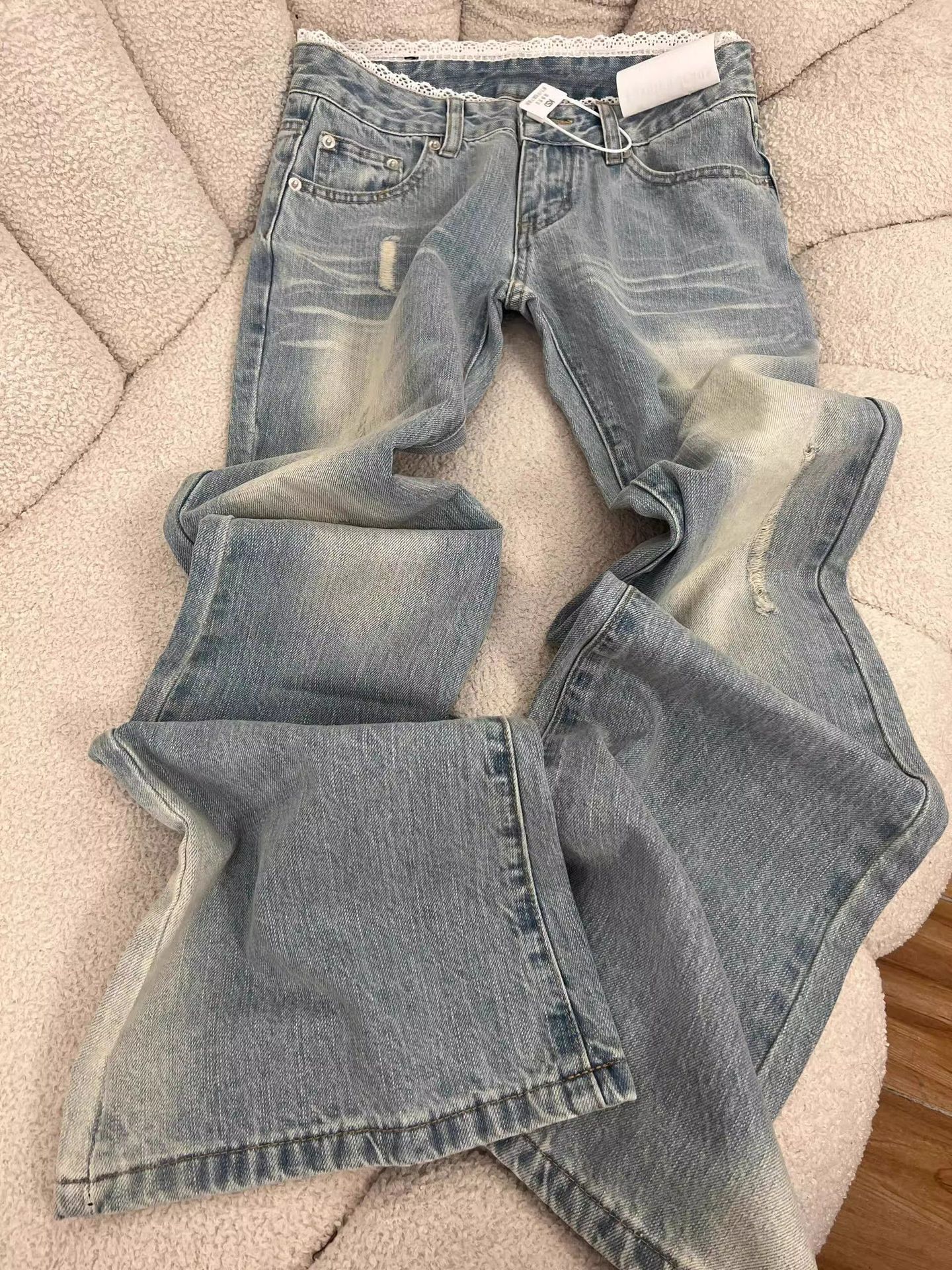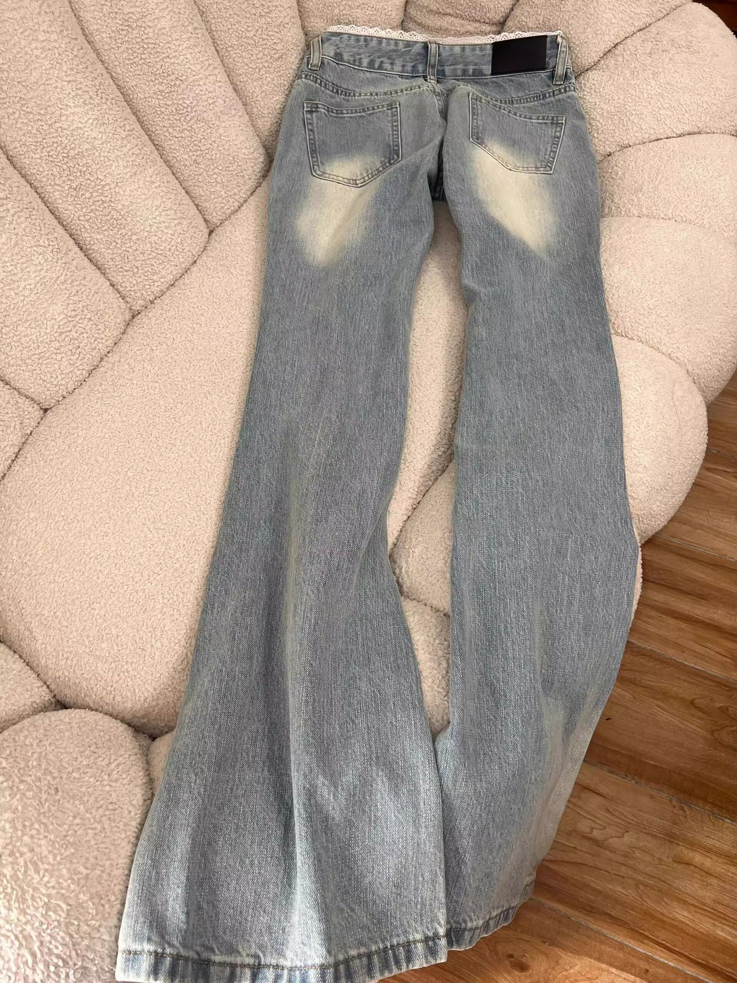 여성을 위한 레트로 워싱 라이트 컬러 부츠컷 청바지, 봄, 가을 새로운 스타일의 레이스 스플라이싱 로우 웨이스트 루즈핏 플레어 팬츠스토어 가기