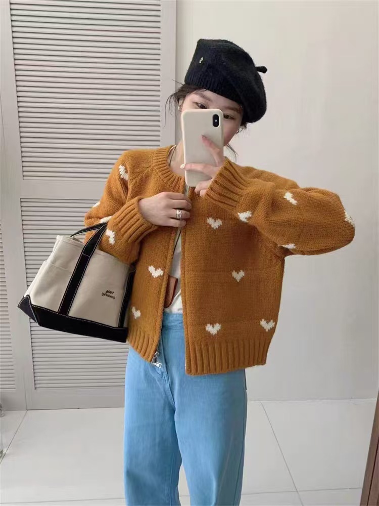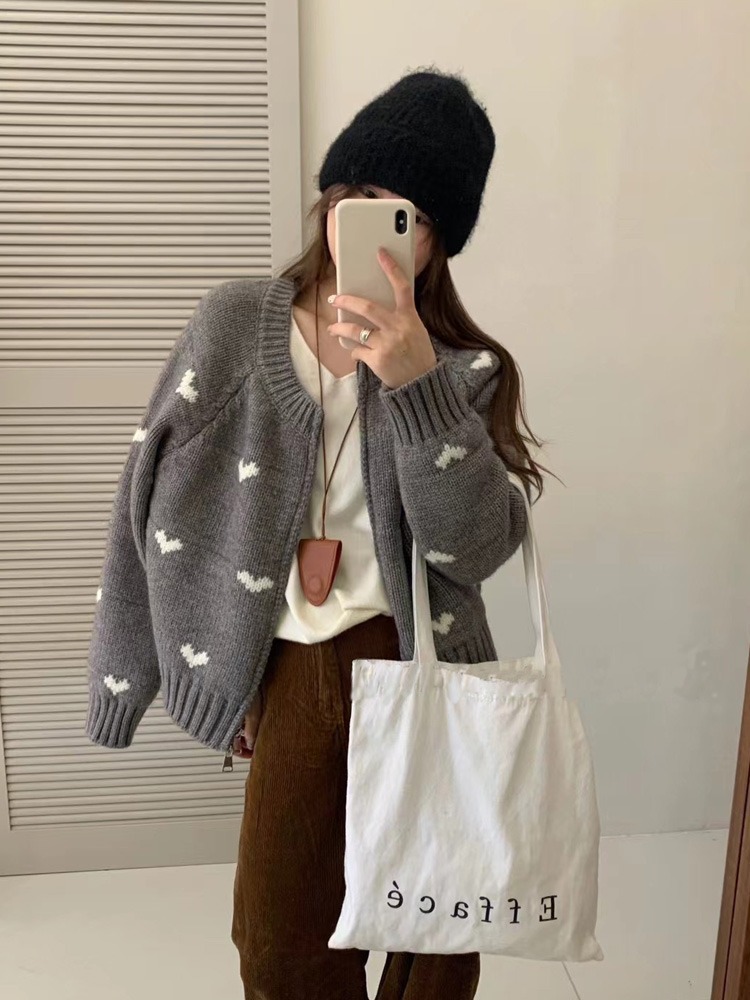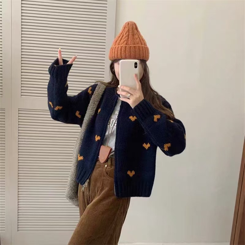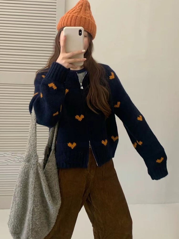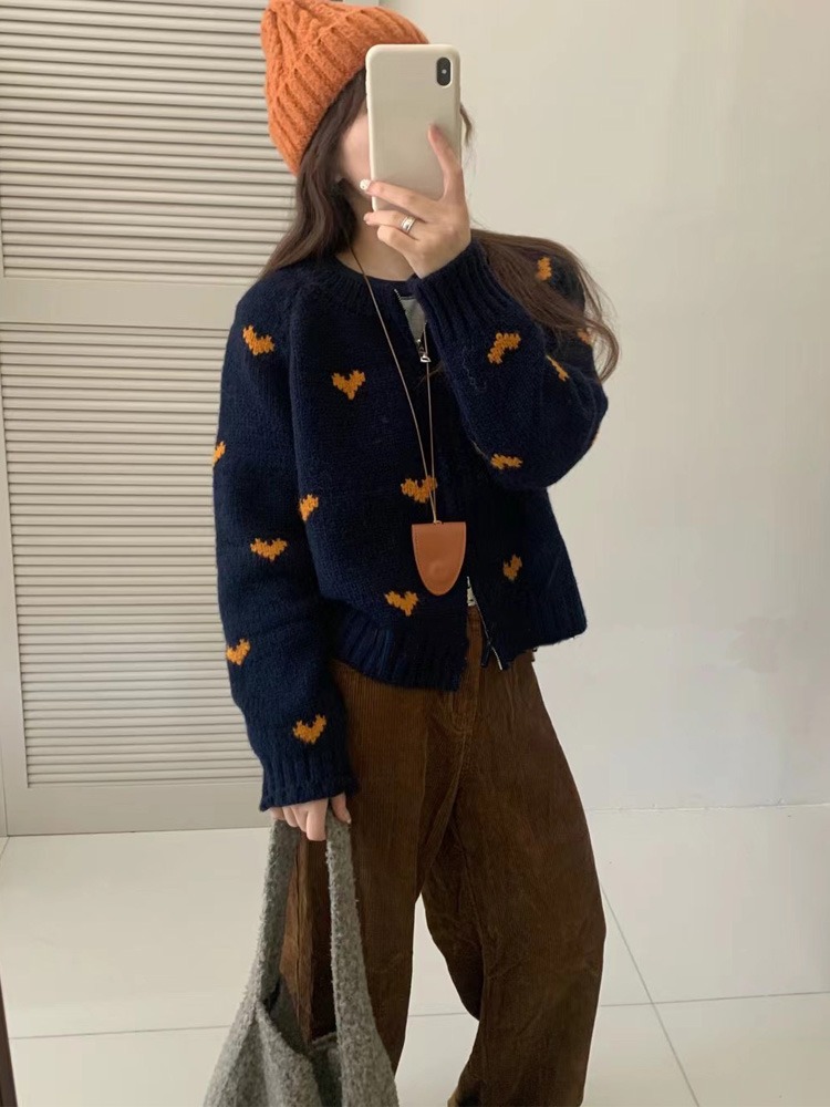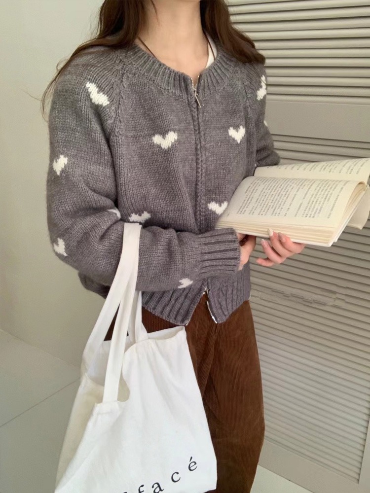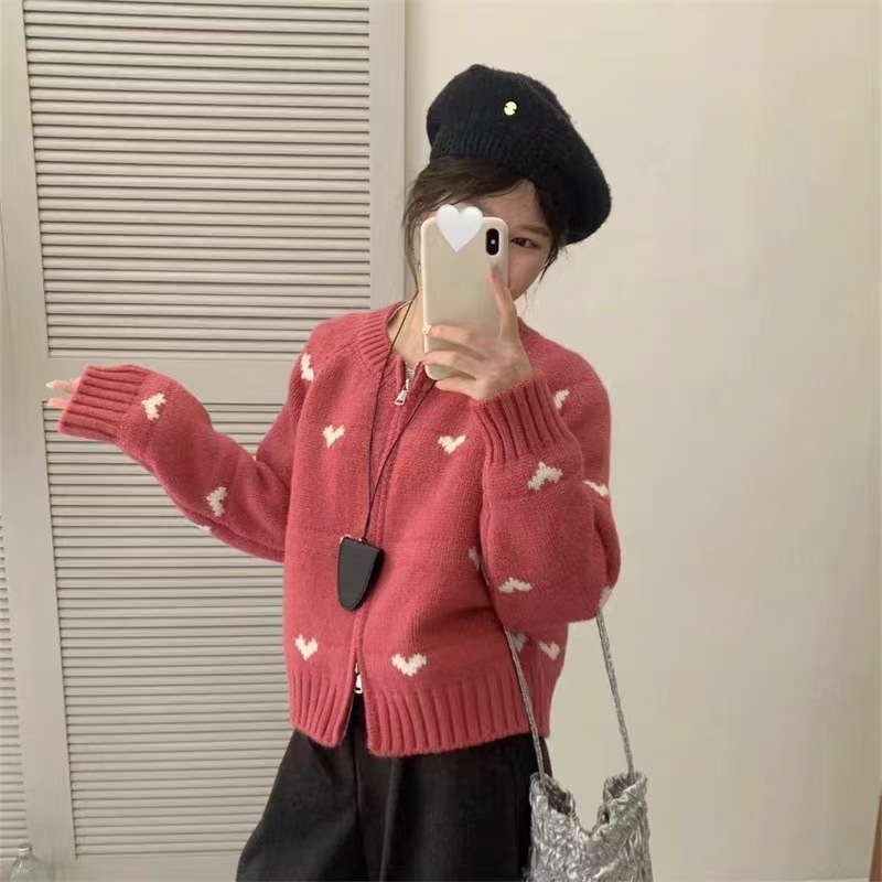 2025 한국 달콤한 사랑 자카드 라운드 넥 더블 지퍼 연령 감소 니트 카디건 가을, 겨울 부드러운 밀랍 스웨터 재킷 여성스토어 가기