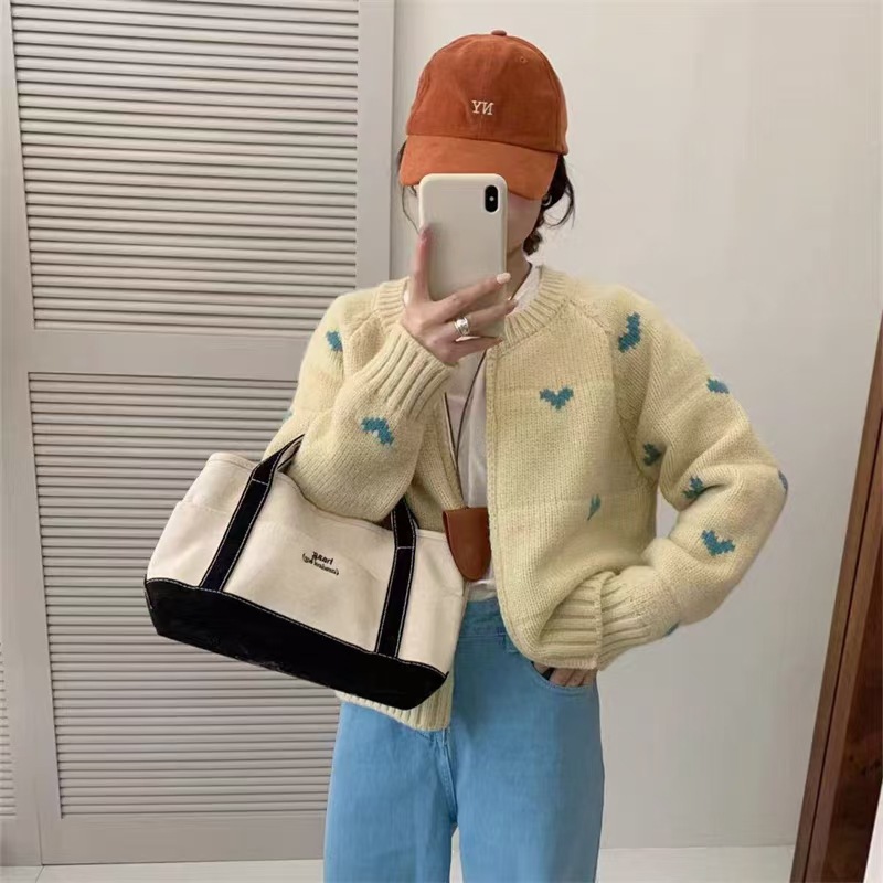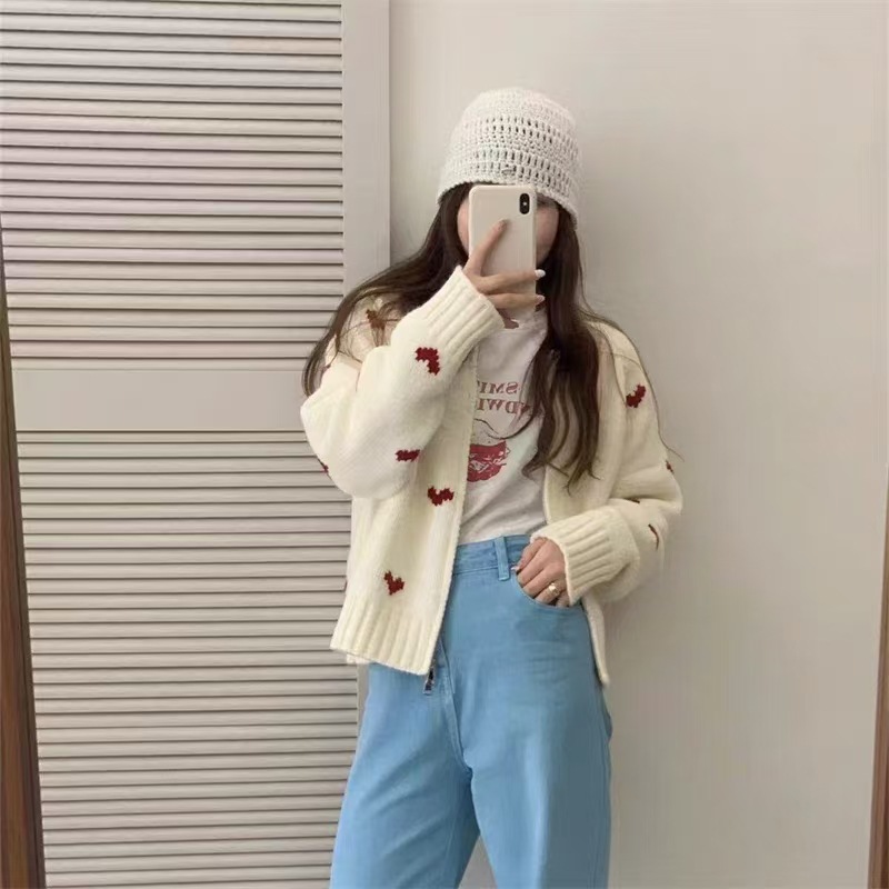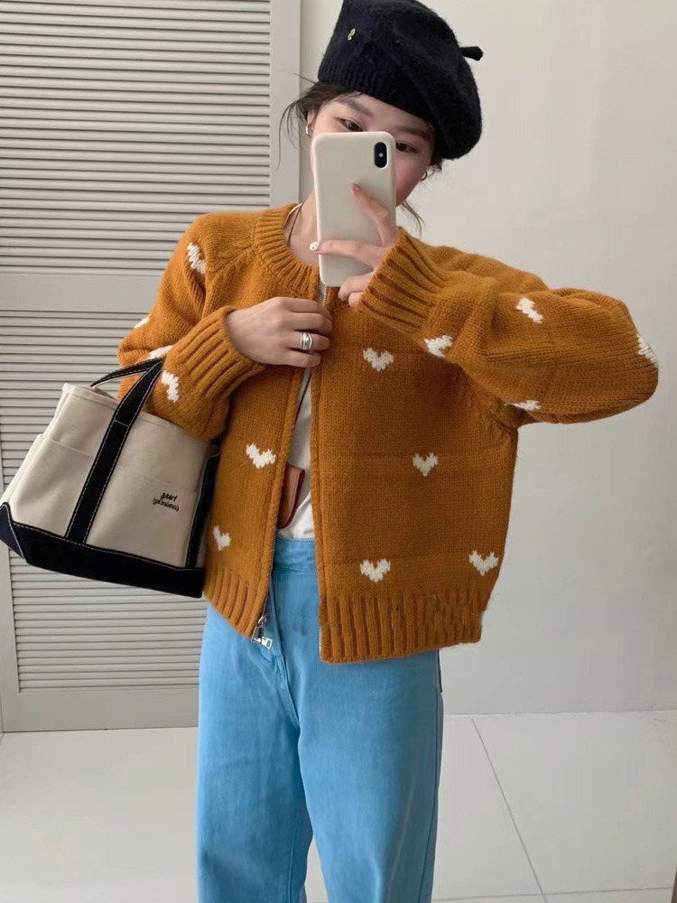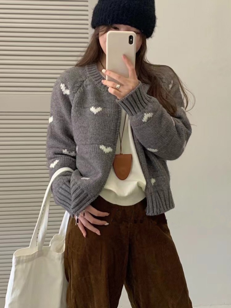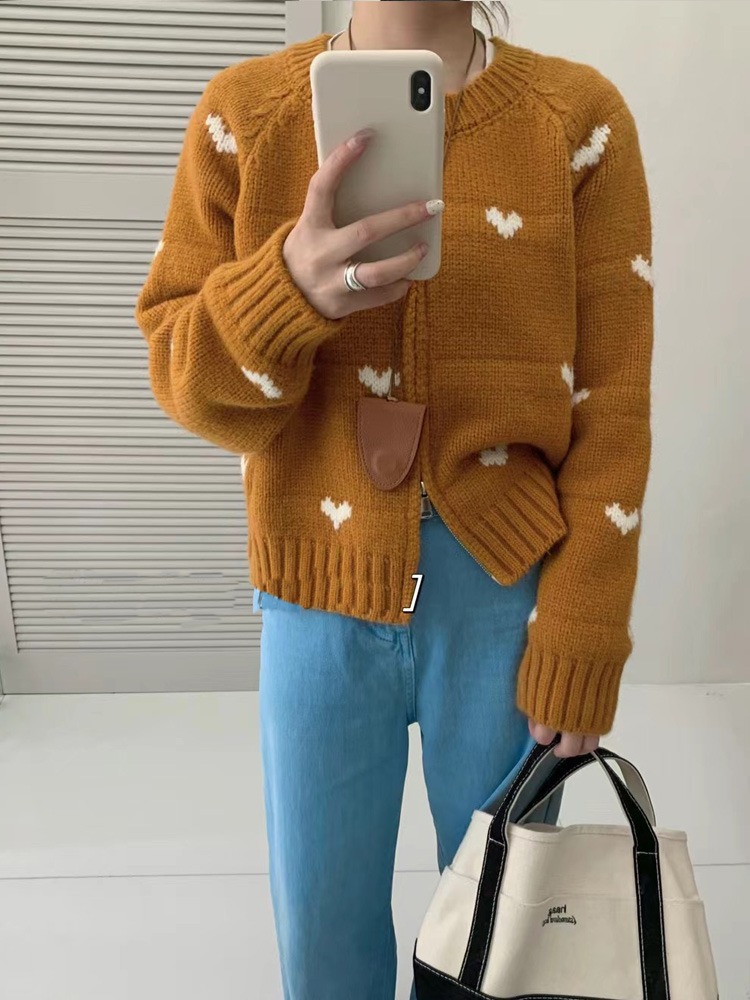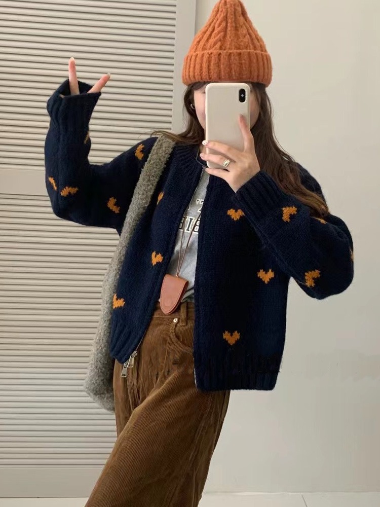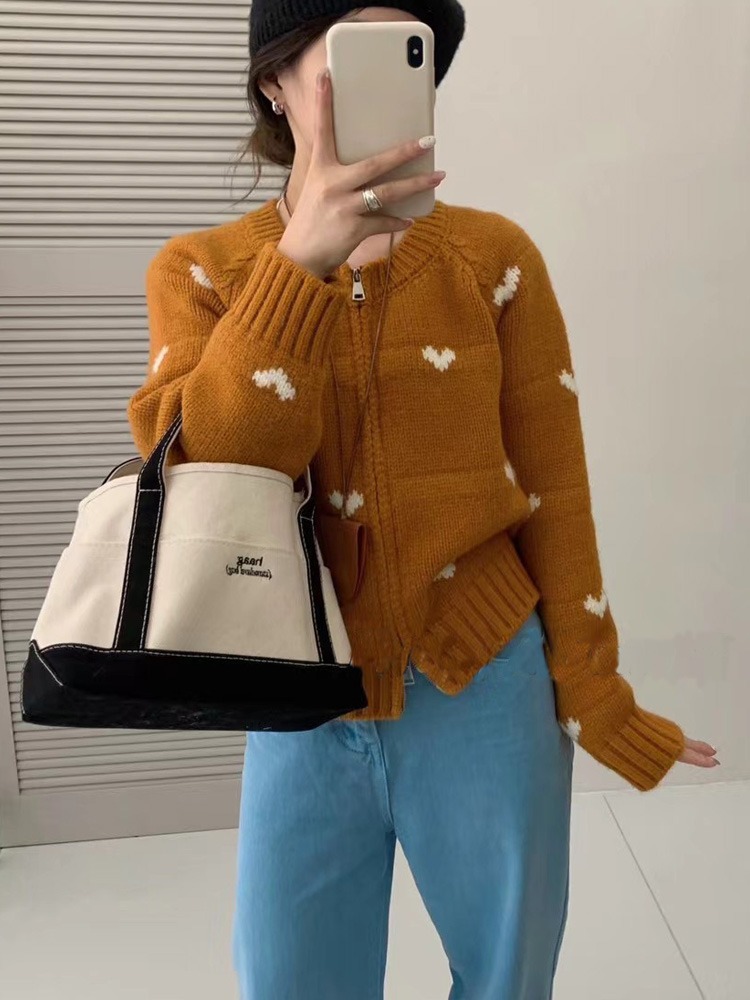 2025 한국 달콤한 사랑 자카드 라운드 넥 더블 지퍼 연령 감소 니트 카디건 가을, 겨울 부드러운 밀랍 스웨터 재킷 여성스토어 가기